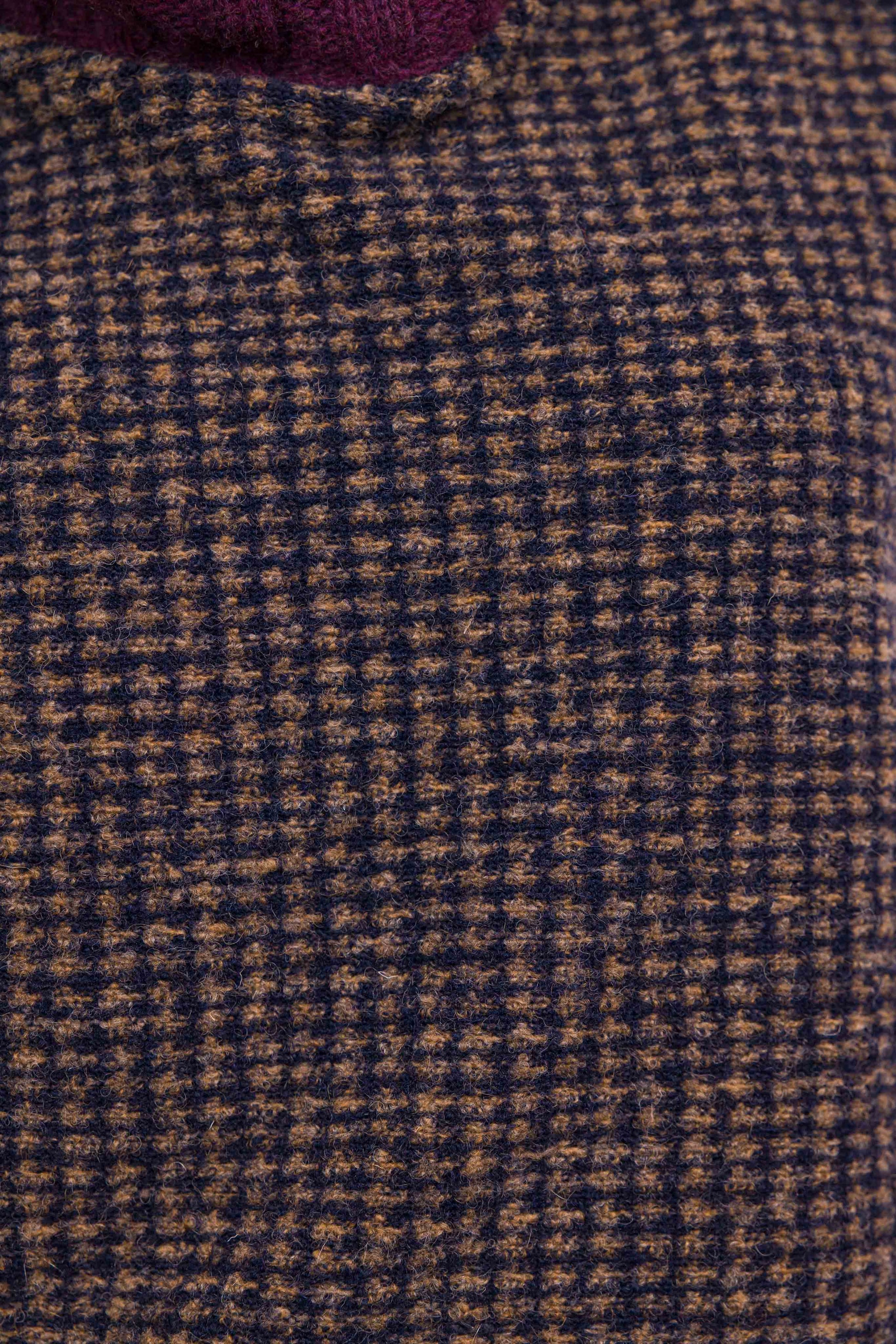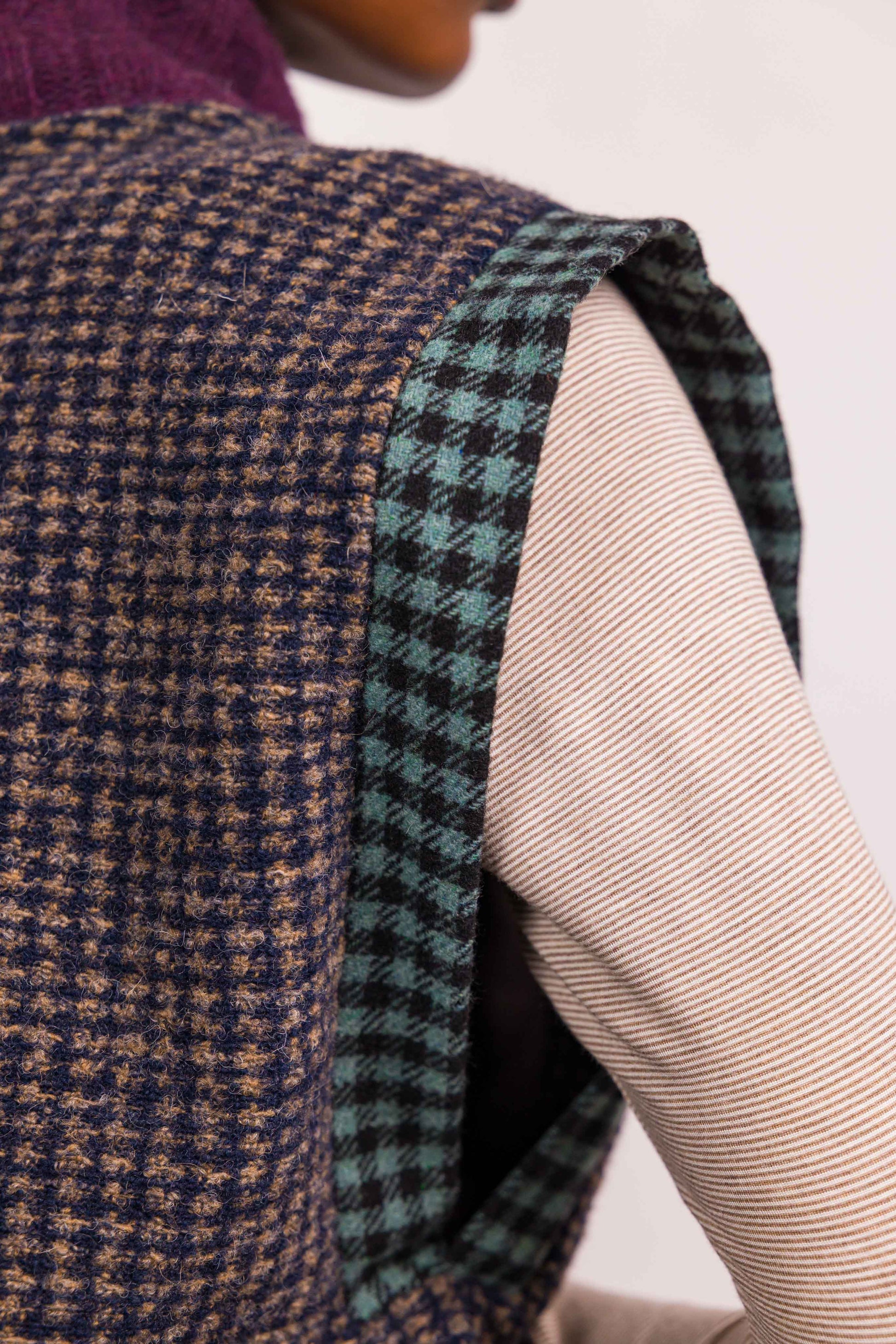 Le Ben Marieve revisite le pull sans manches avec une approche graphique et chaleureuse. Réalisé en laine, il se distingue par son jeu de motifs à carreaux et ses emmanchures soulignées d’un détail pied-de-poule, signature de l’atelier.