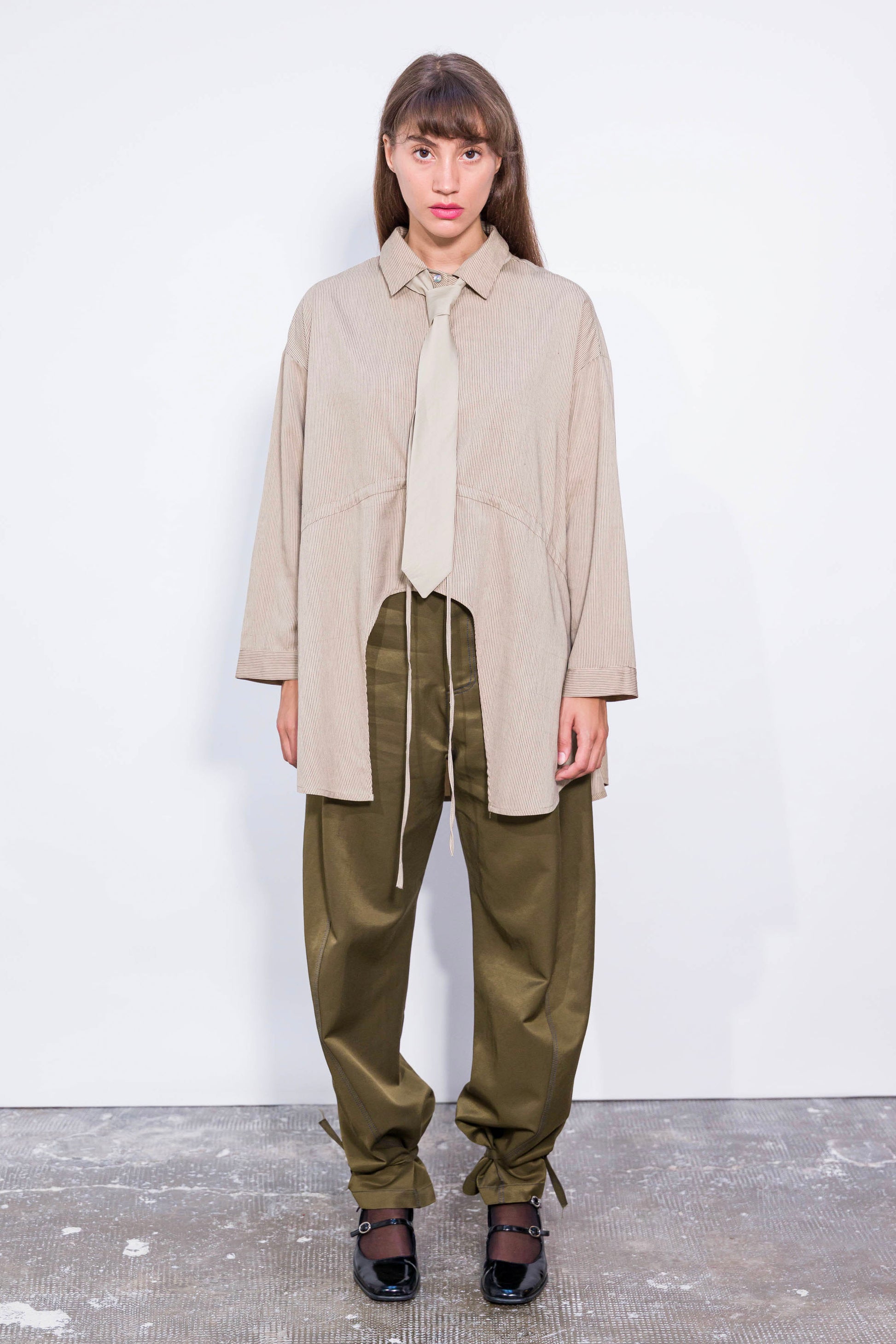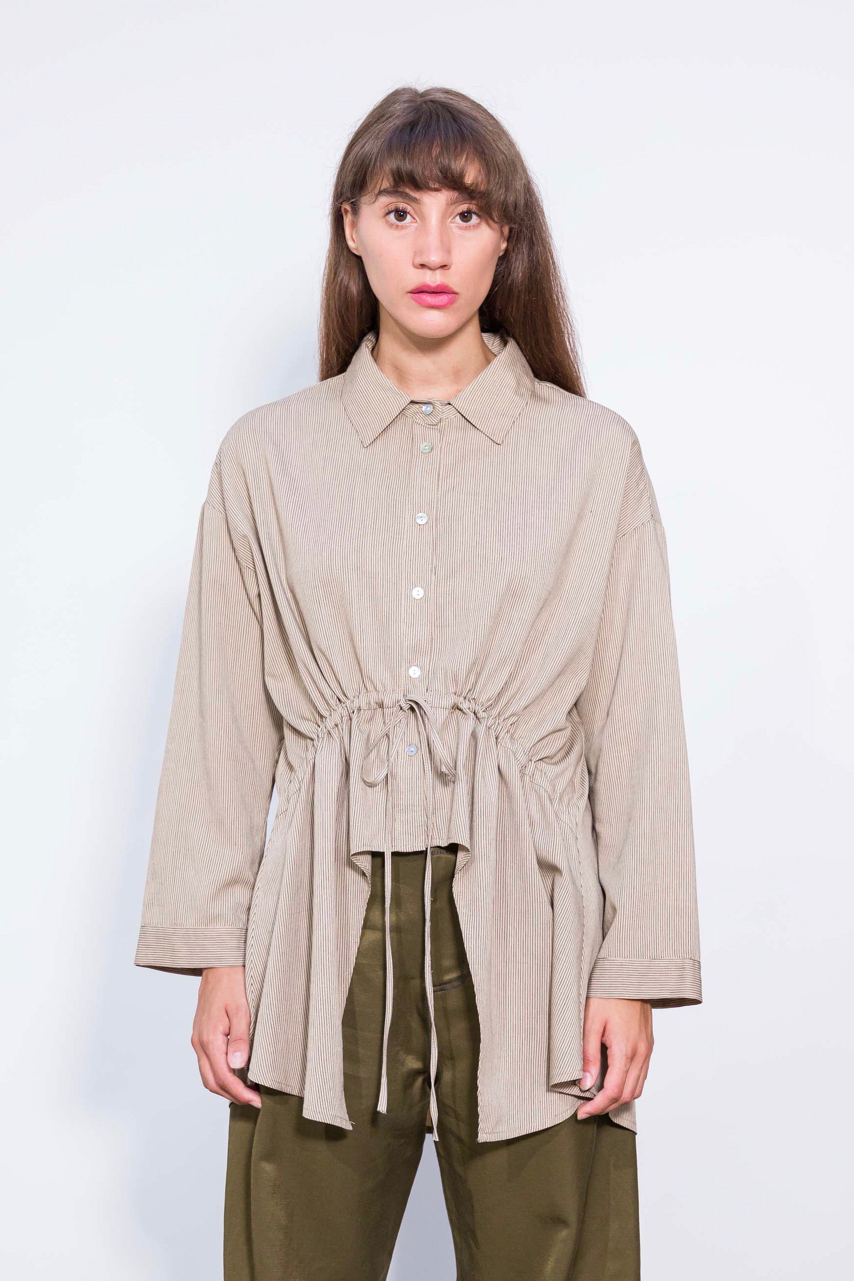 Longue chemise oversized en coton rayé beige. Des liens à la taille permettent de serrer afin de marquer la taille. Col chemise classique mais une large ouverture devant pour une touche créateur. A porter sur notre Nelson Kaki.