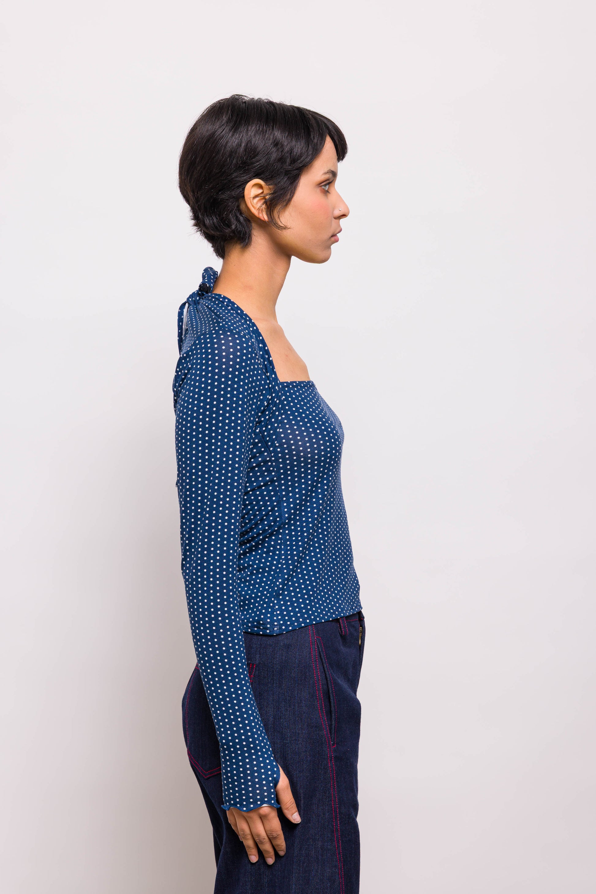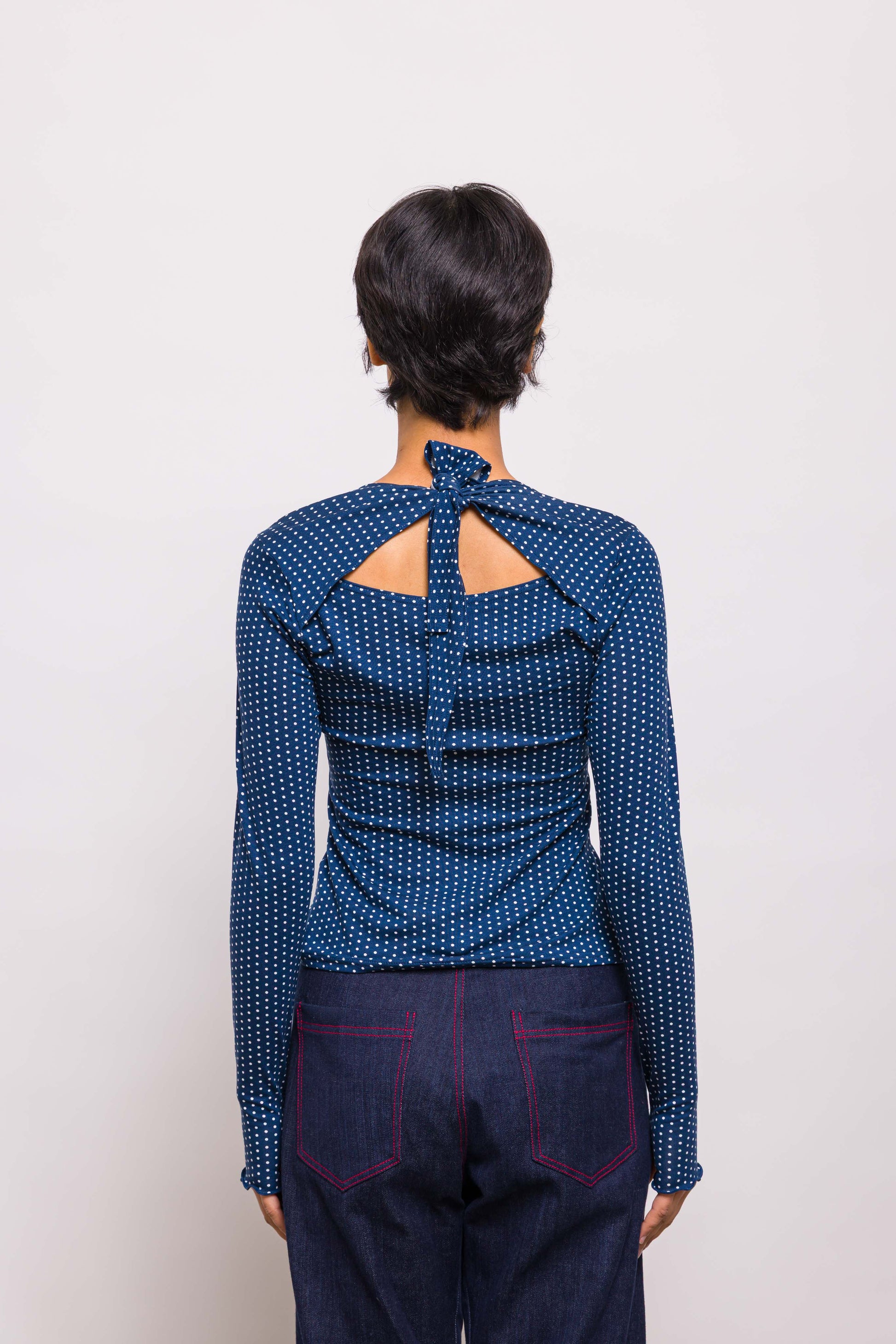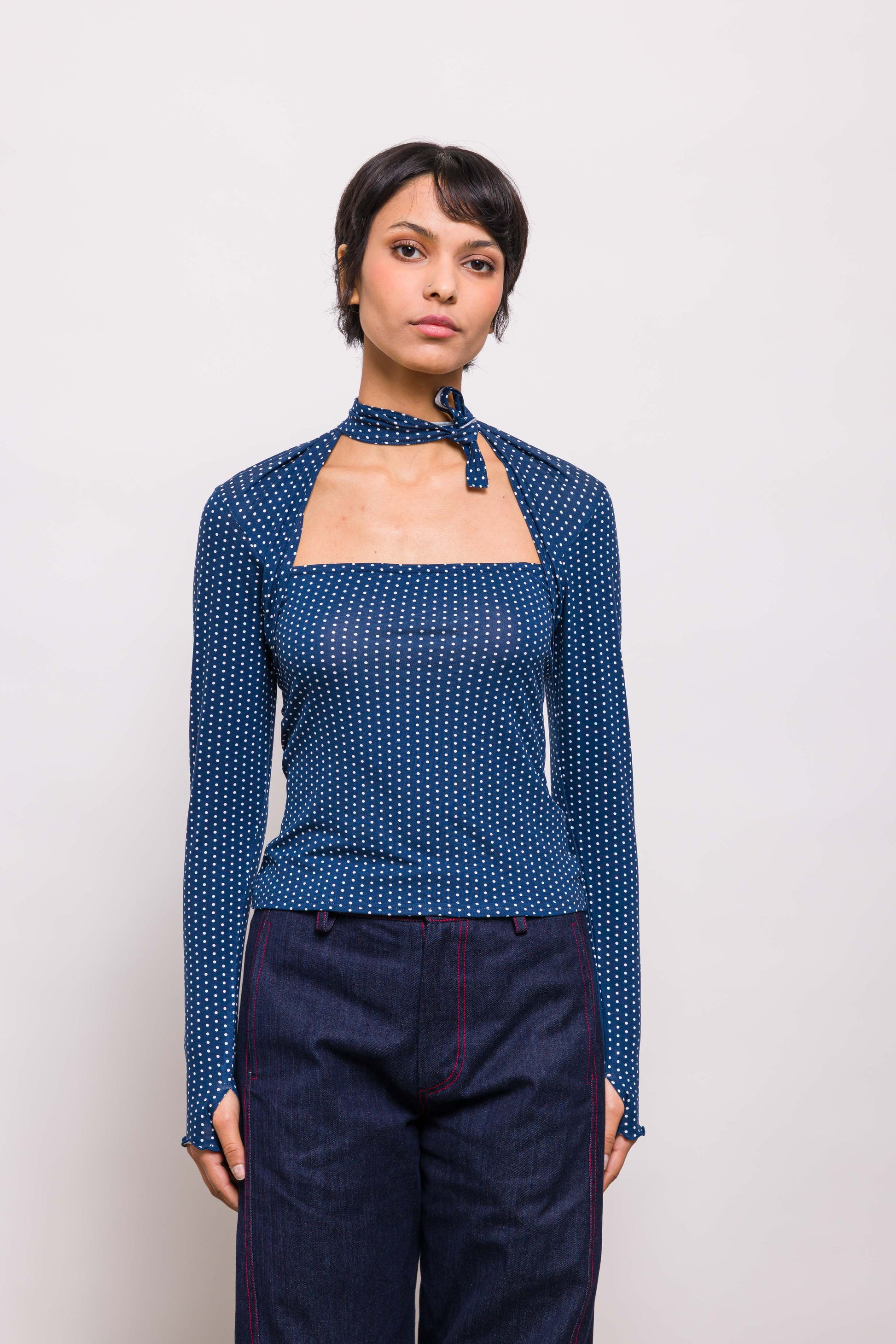 Top près du corps à porter noué devant ou derrière. On aime ses manches longues façon mitaine, son tissus à pois et sa coupe .