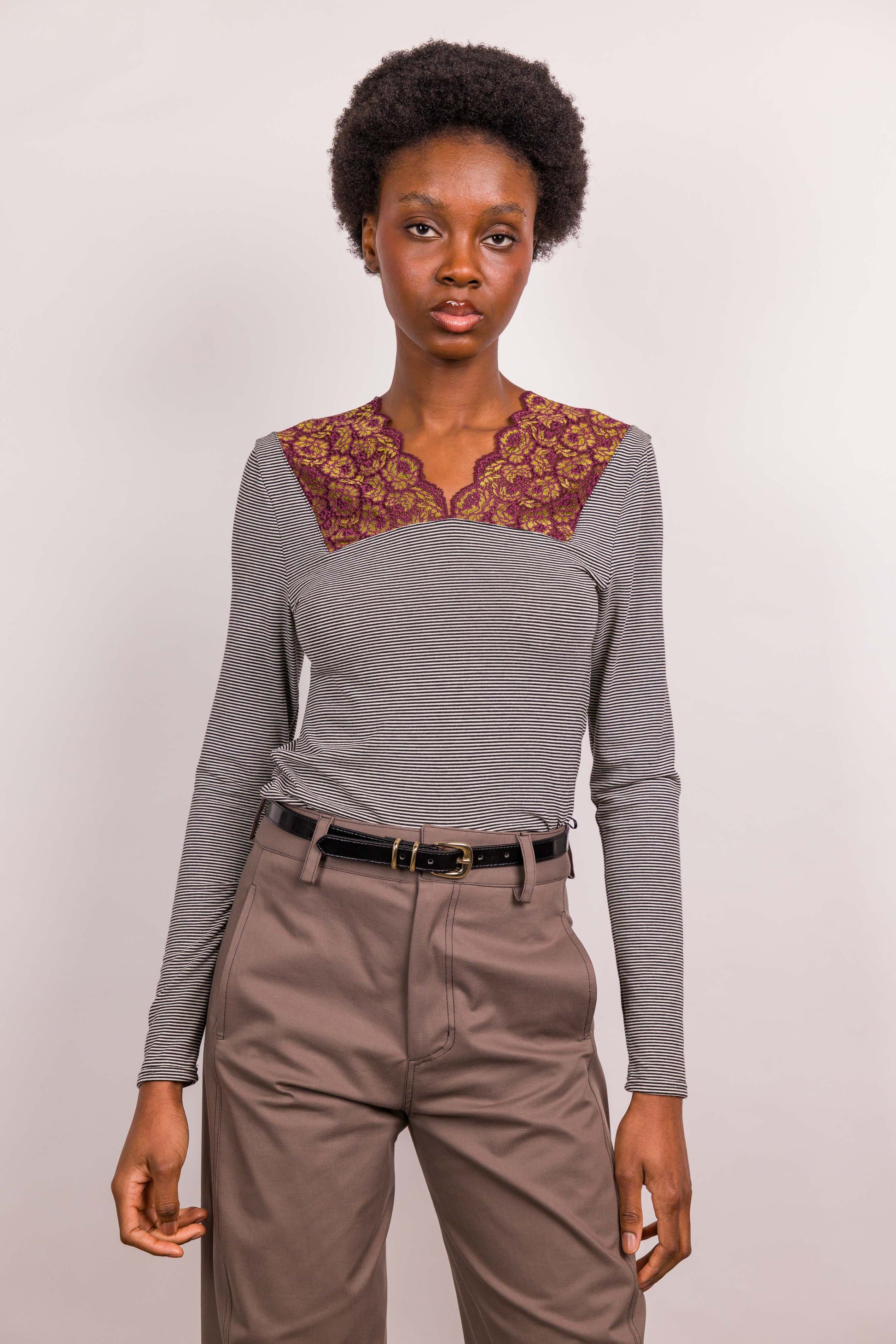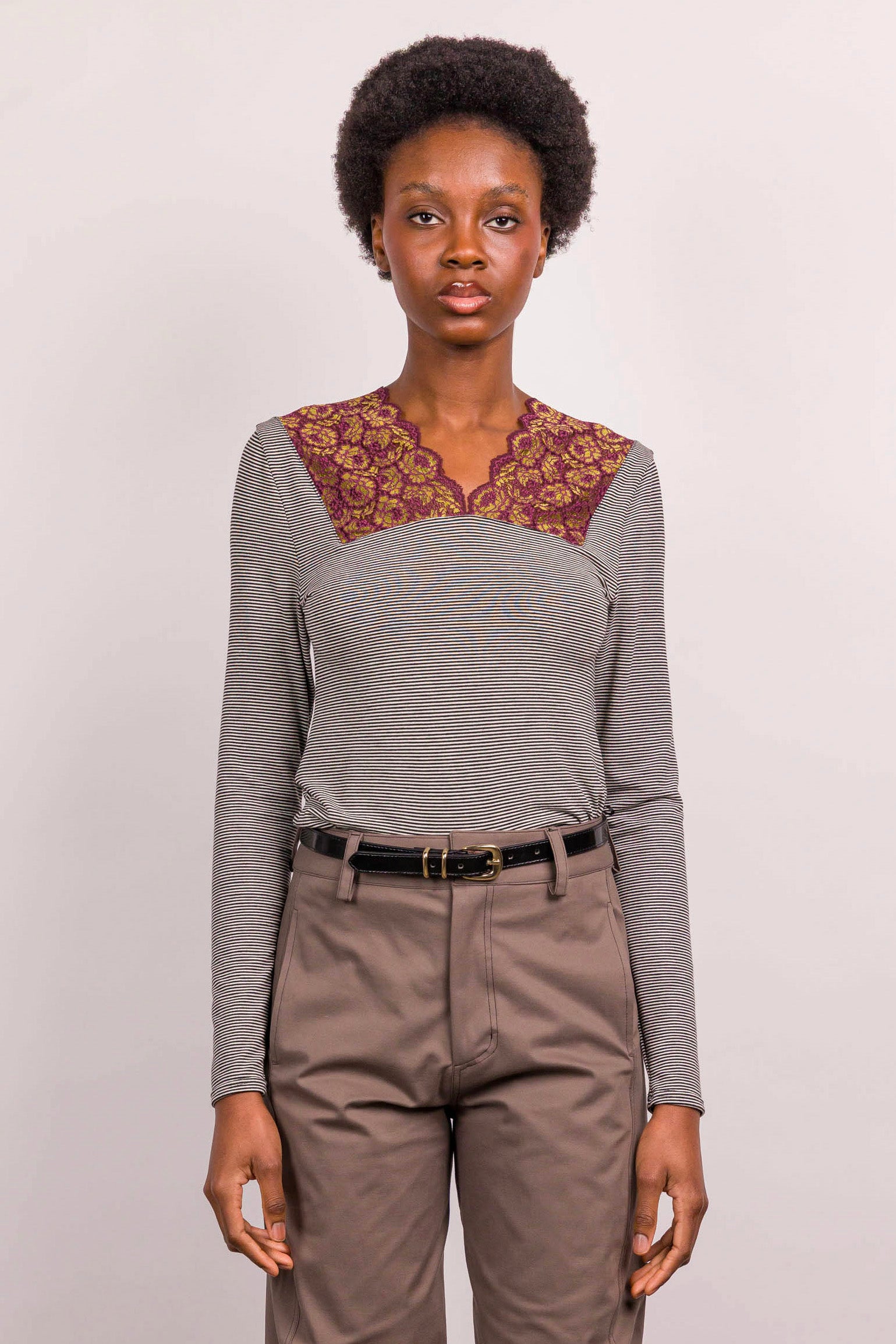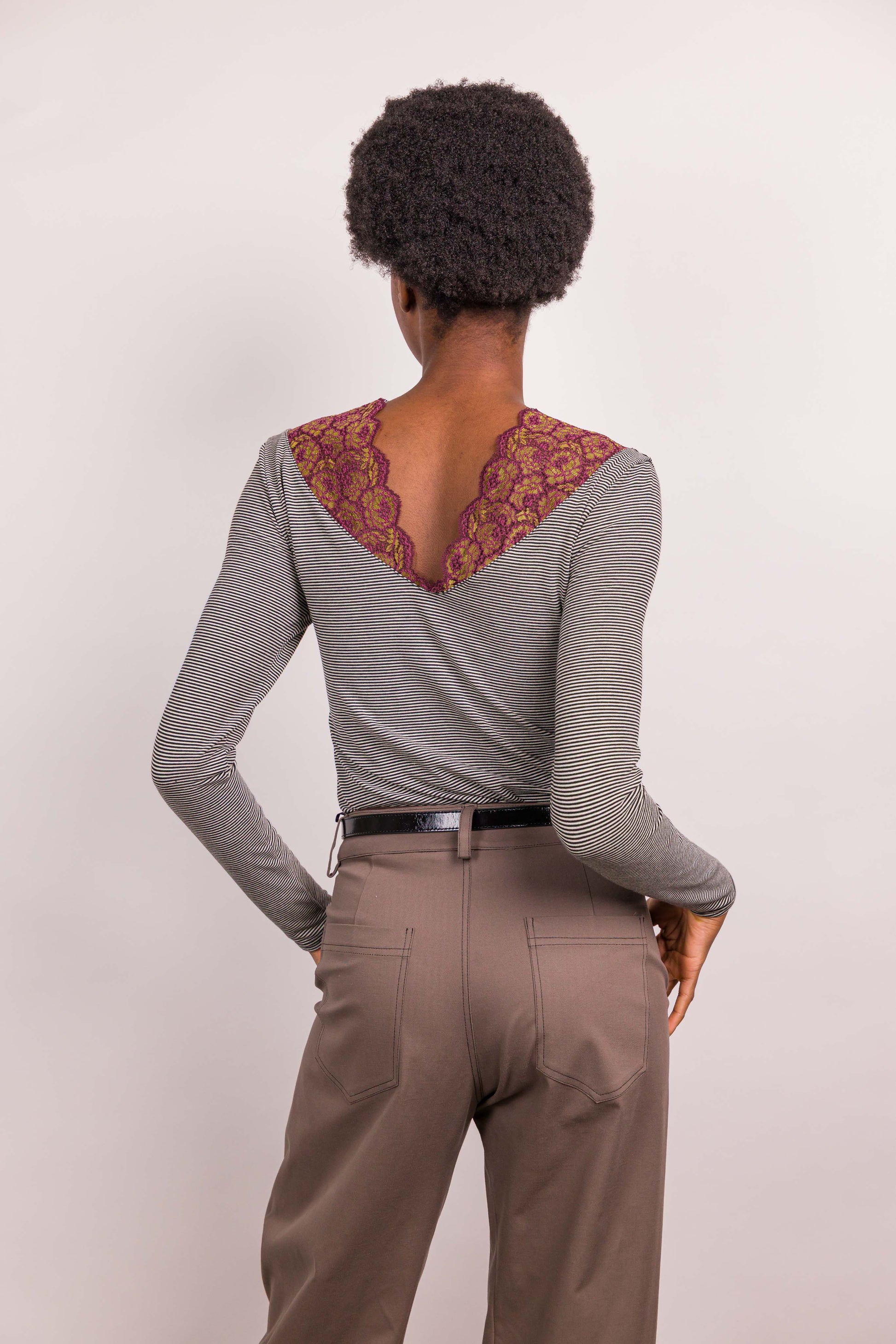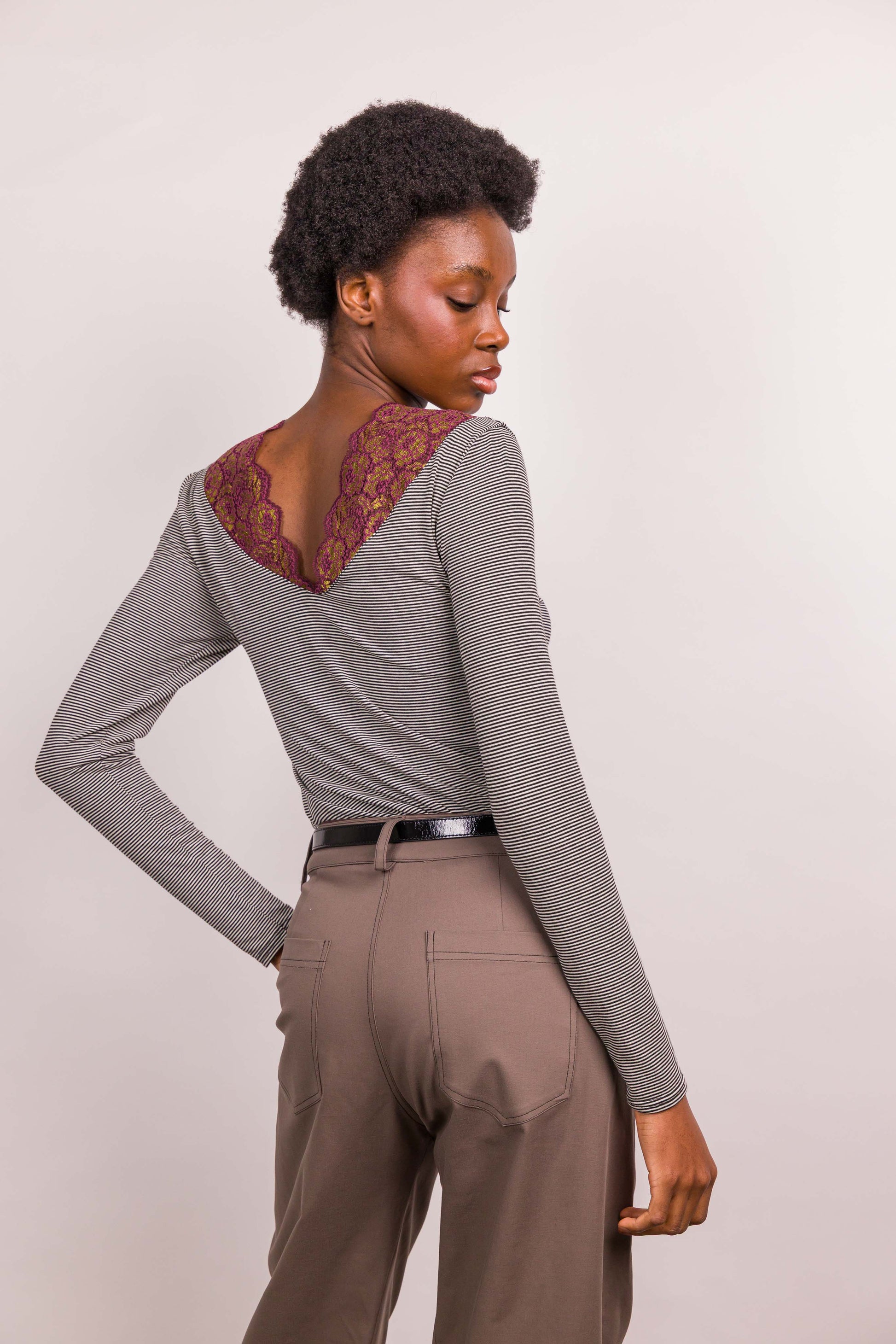 Jeu de matières et féminité assumée pour ce haut seconde peau au charme discret. Jocelyn mêle rayure noir et blanche à une fine dentelle, sur une coupe ajustée et flatteuse. Son encolure en V, devant et dos, encadre la silhouette avec subtilité. Il se glisse facilement dans un pantalon ou une jupe taille haute, et se prête aussi bien aux looks casual que plus habillés.