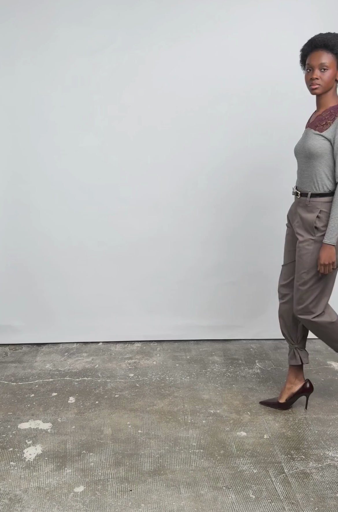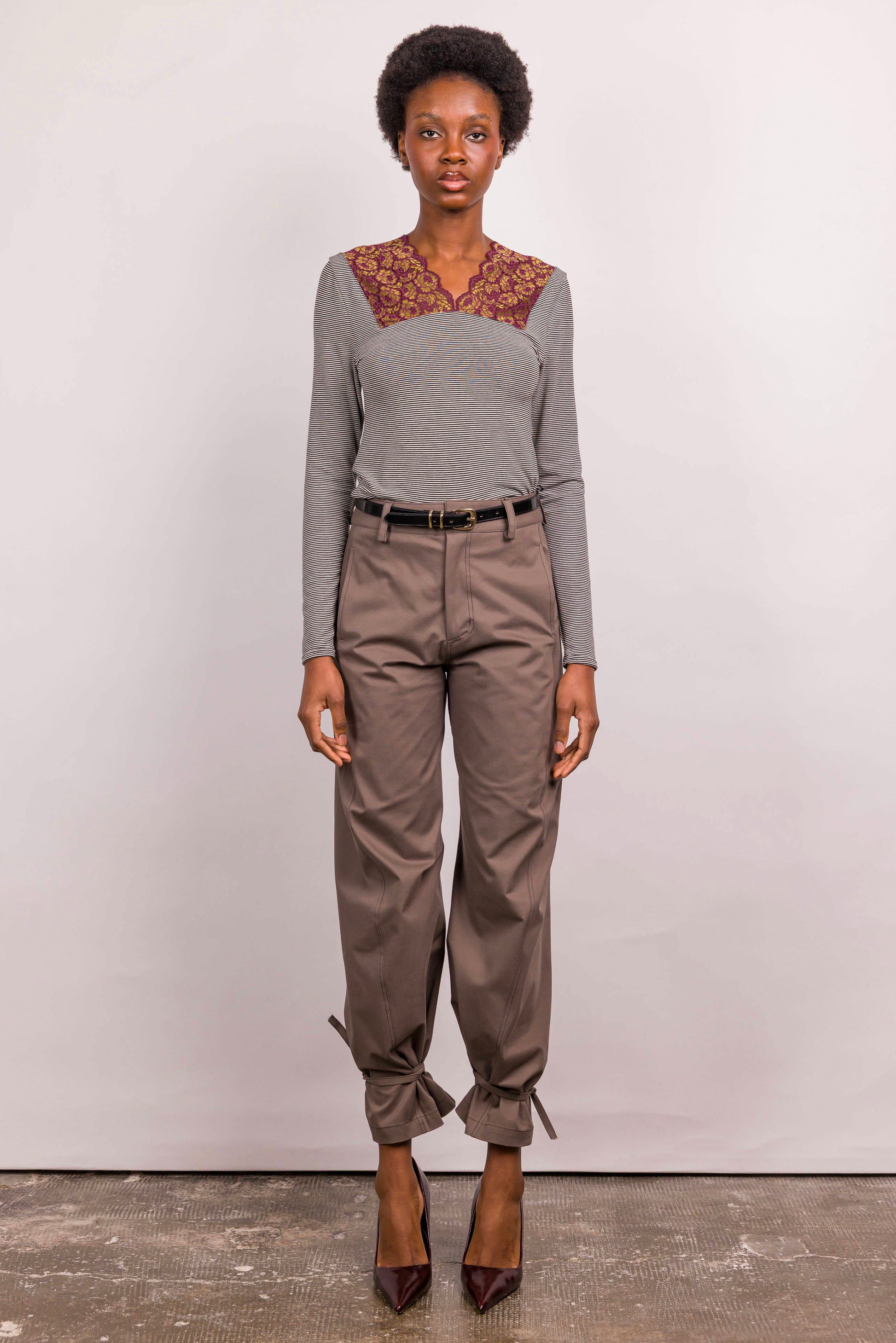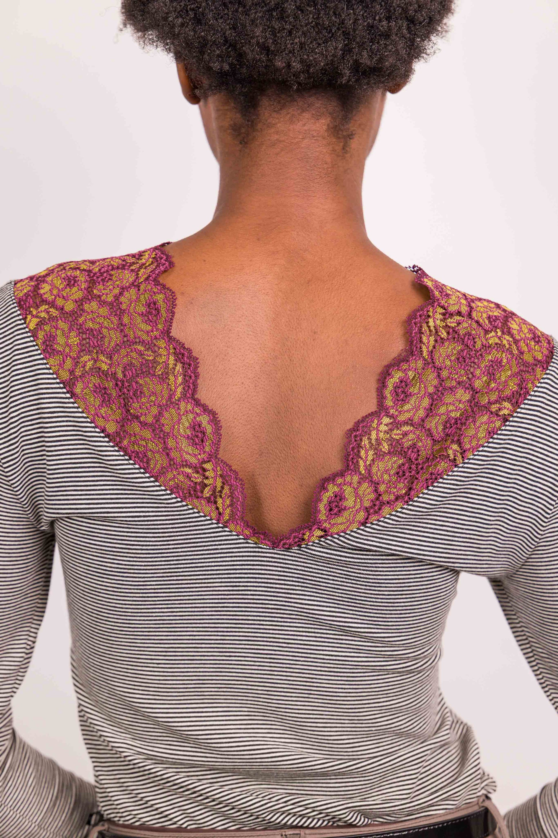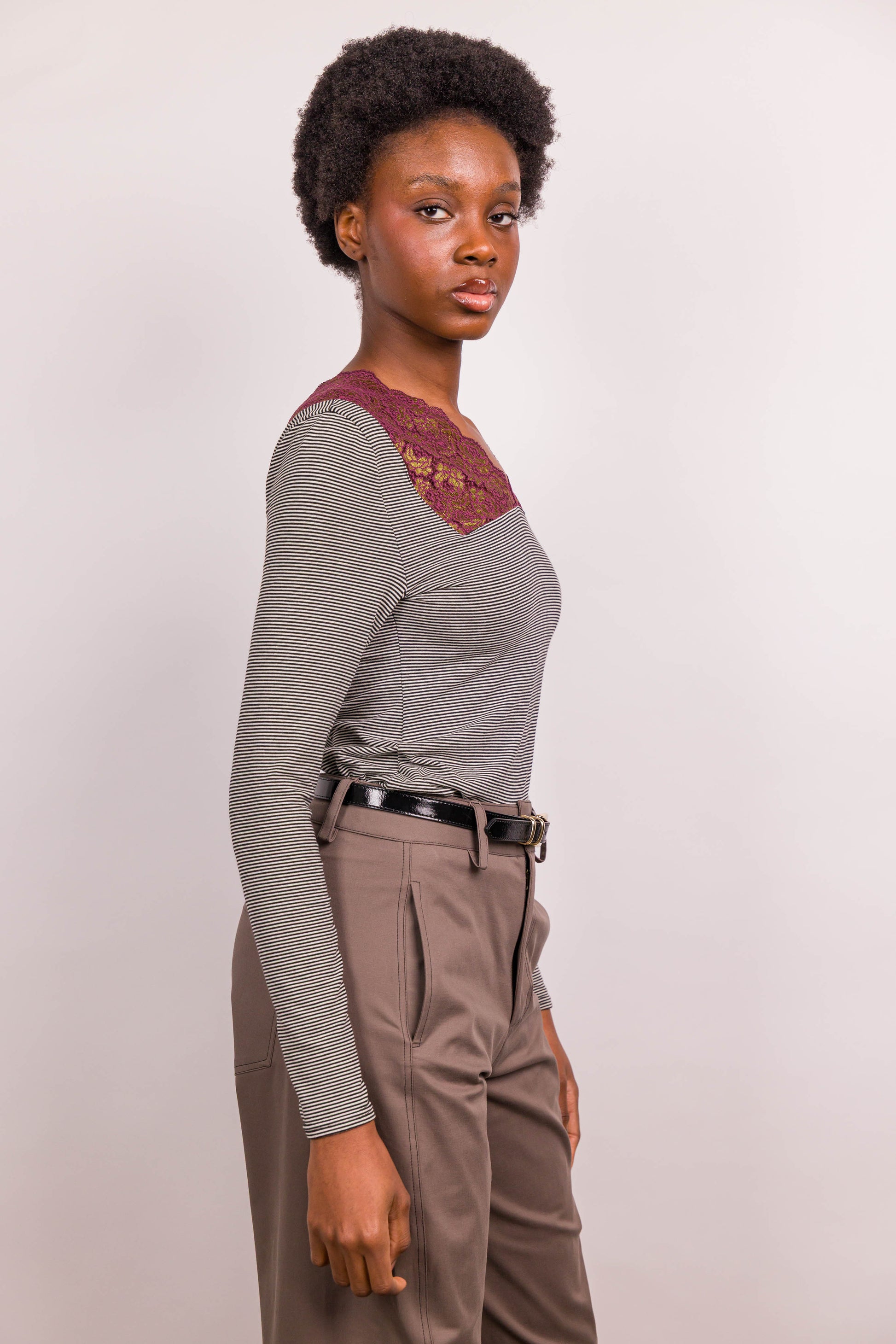 Jeu de matières et féminité assumée pour ce haut seconde peau au charme discret. Jocelyn mêle rayure noir et blanche à une fine dentelle, sur une coupe ajustée et flatteuse. Son encolure en V, devant et dos, encadre la silhouette avec subtilité. Il se glisse facilement dans un pantalon ou une jupe taille haute, et se prête aussi bien aux looks casual que plus habillés.