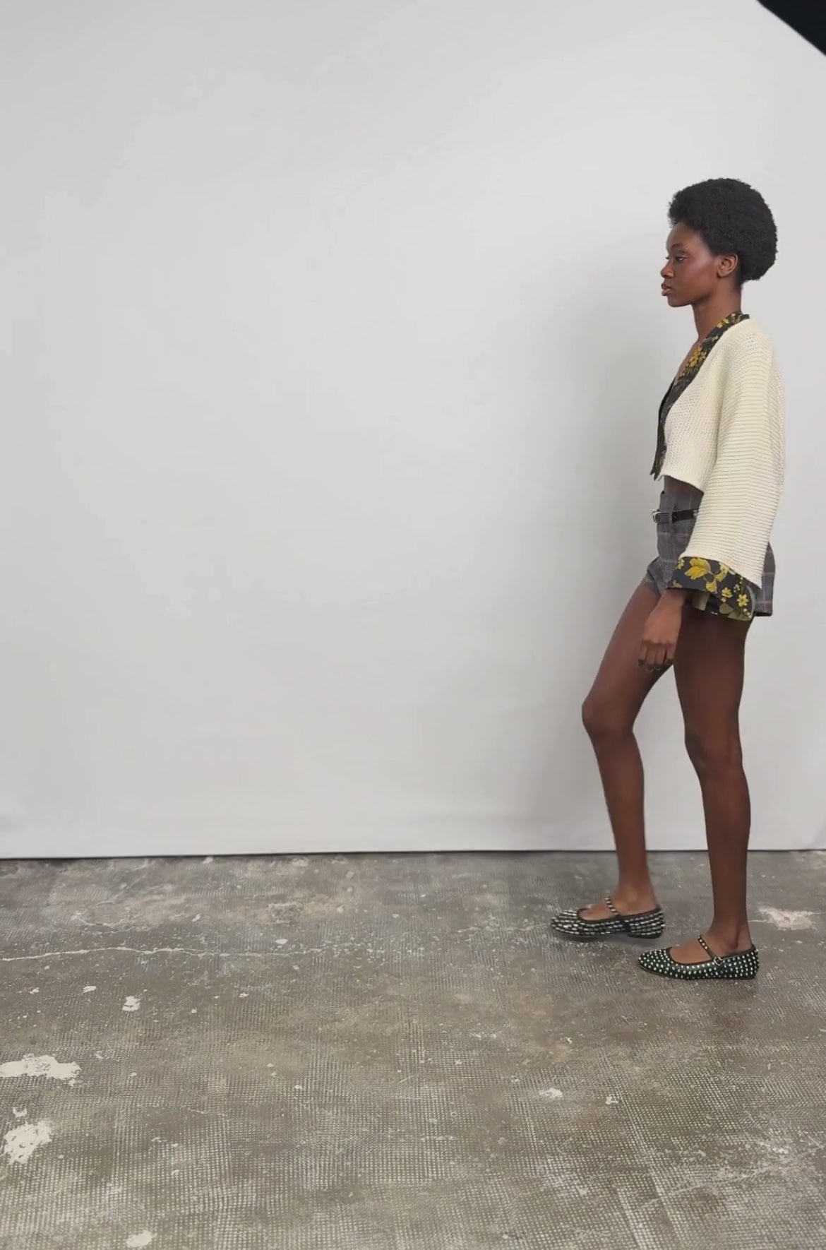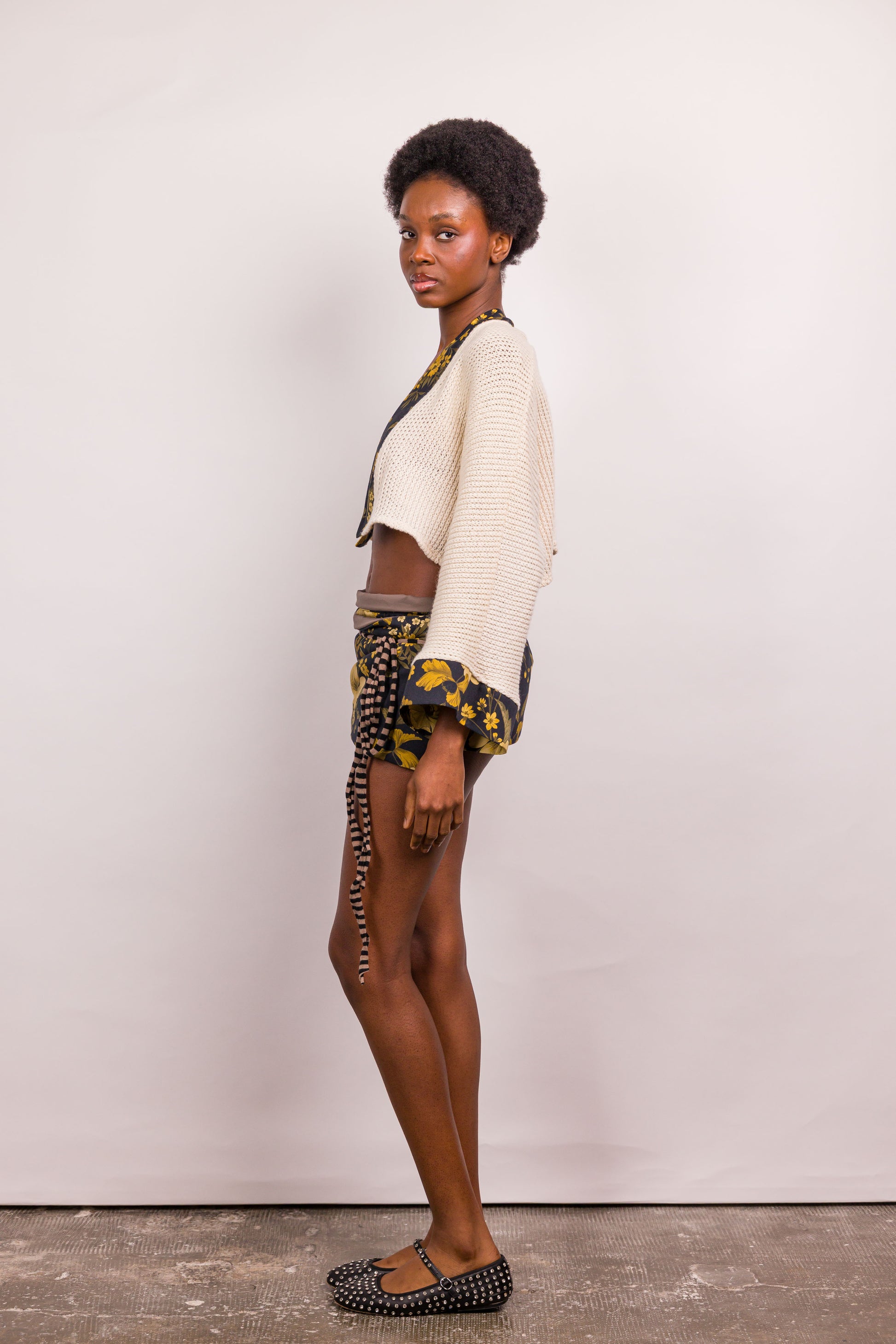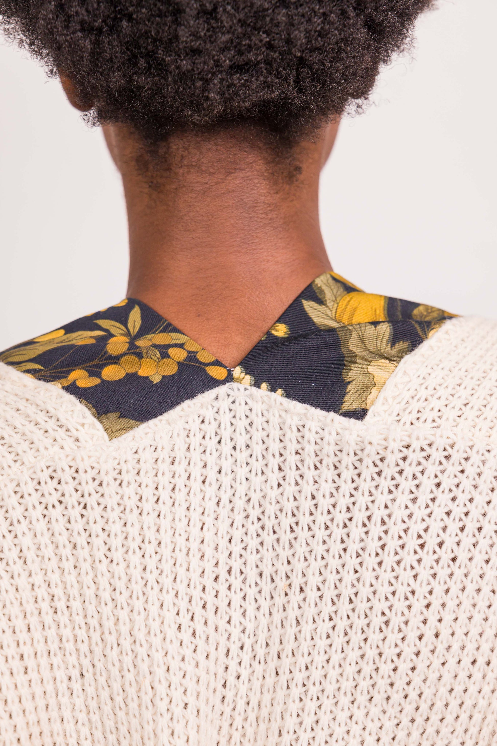 John revisite le kimono avec une coupe graphique, courte et ample, pensée pour twister une silhouette sobre. Son tissu en maille blanche apporte du relief sans alourdir, tandis que le contraste des poignets et du col à fleurs jaunes signe un look typiquement Marieve. Il se porte ouvert sur une robe, un pantalon taille haute ou à même la peau pour les plus audacieuses. On aime son tombé souple, son volume équilibré, et le travail du col en V qui allonge la silhouette.