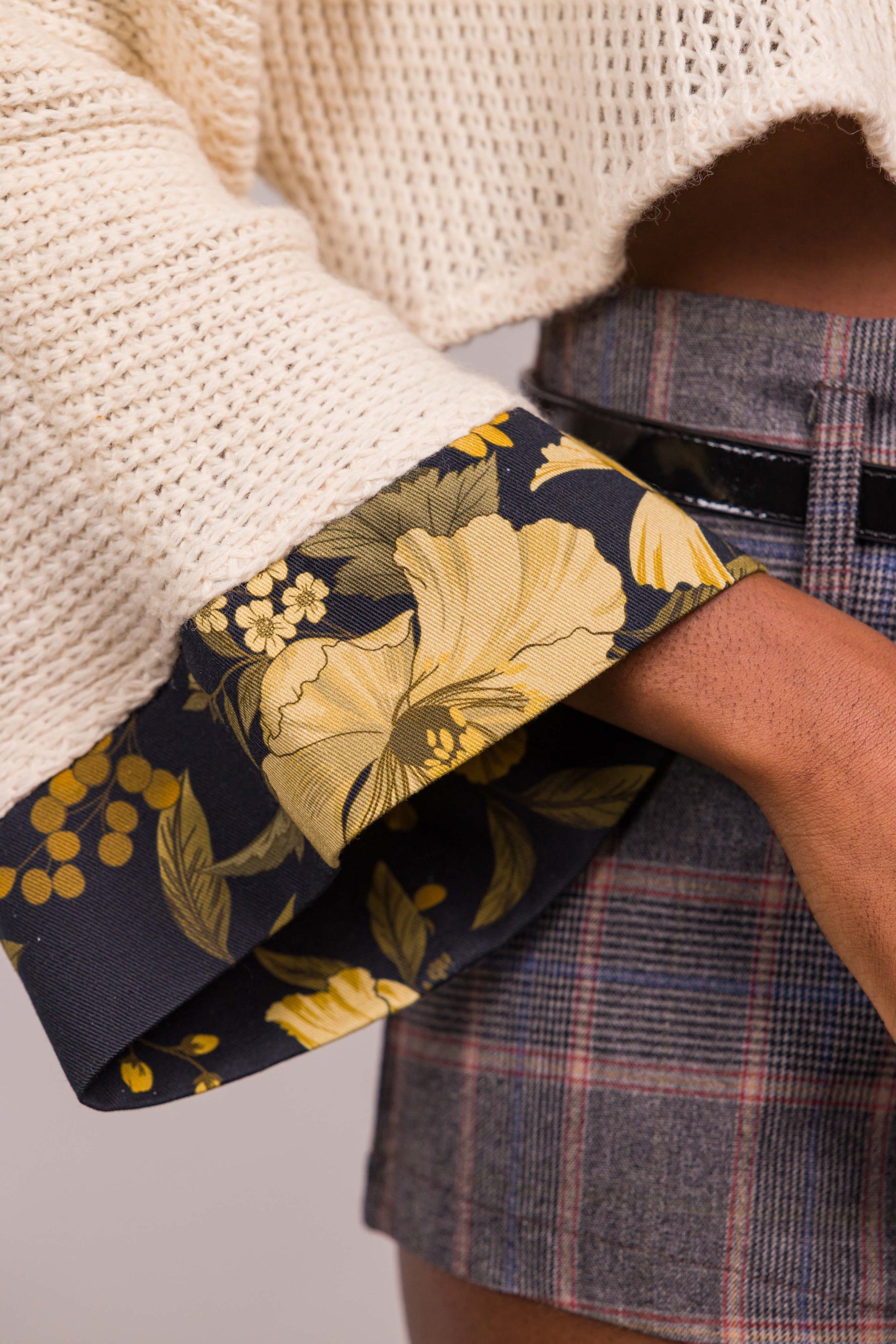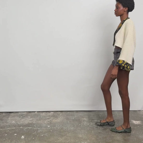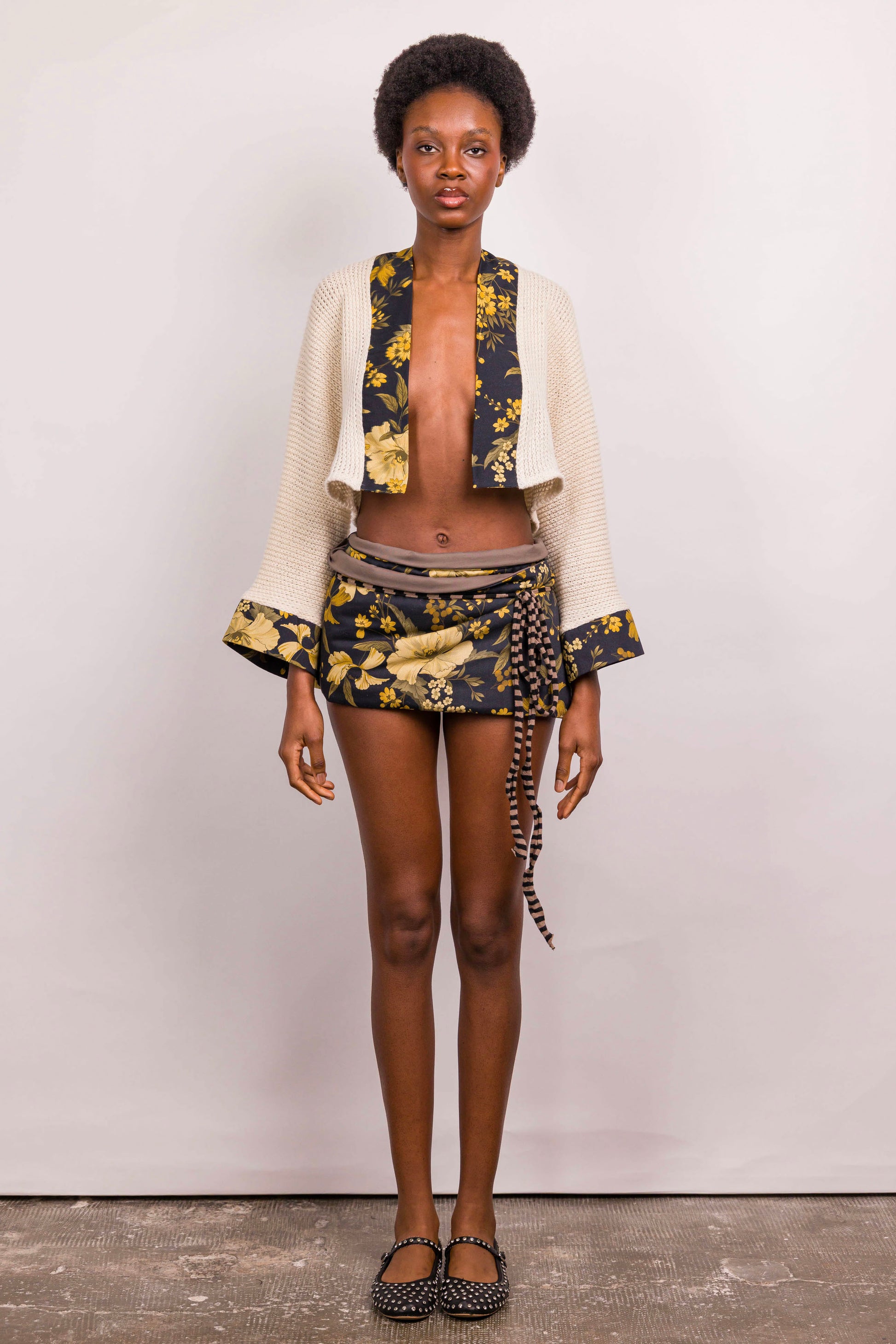 John revisite le kimono avec une coupe graphique, courte et ample, pensée pour twister une silhouette sobre. Son tissu en maille blanche apporte du relief sans alourdir, tandis que le contraste des poignets et du col à fleurs jaunes signe un look typiquement Marieve. Il se porte ouvert sur une robe, un pantalon taille haute ou à même la peau pour les plus audacieuses. On aime son tombé souple, son volume équilibré, et le travail du col en V qui allonge la silhouette.