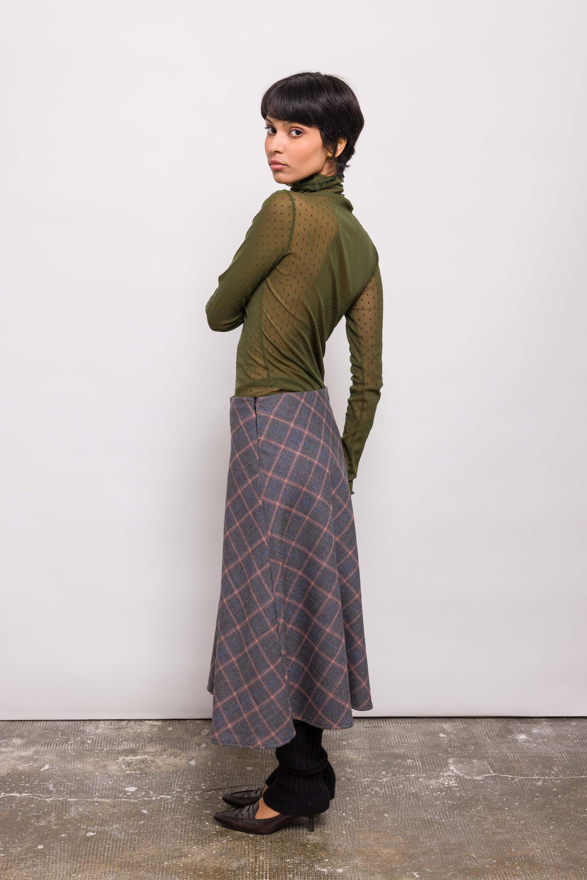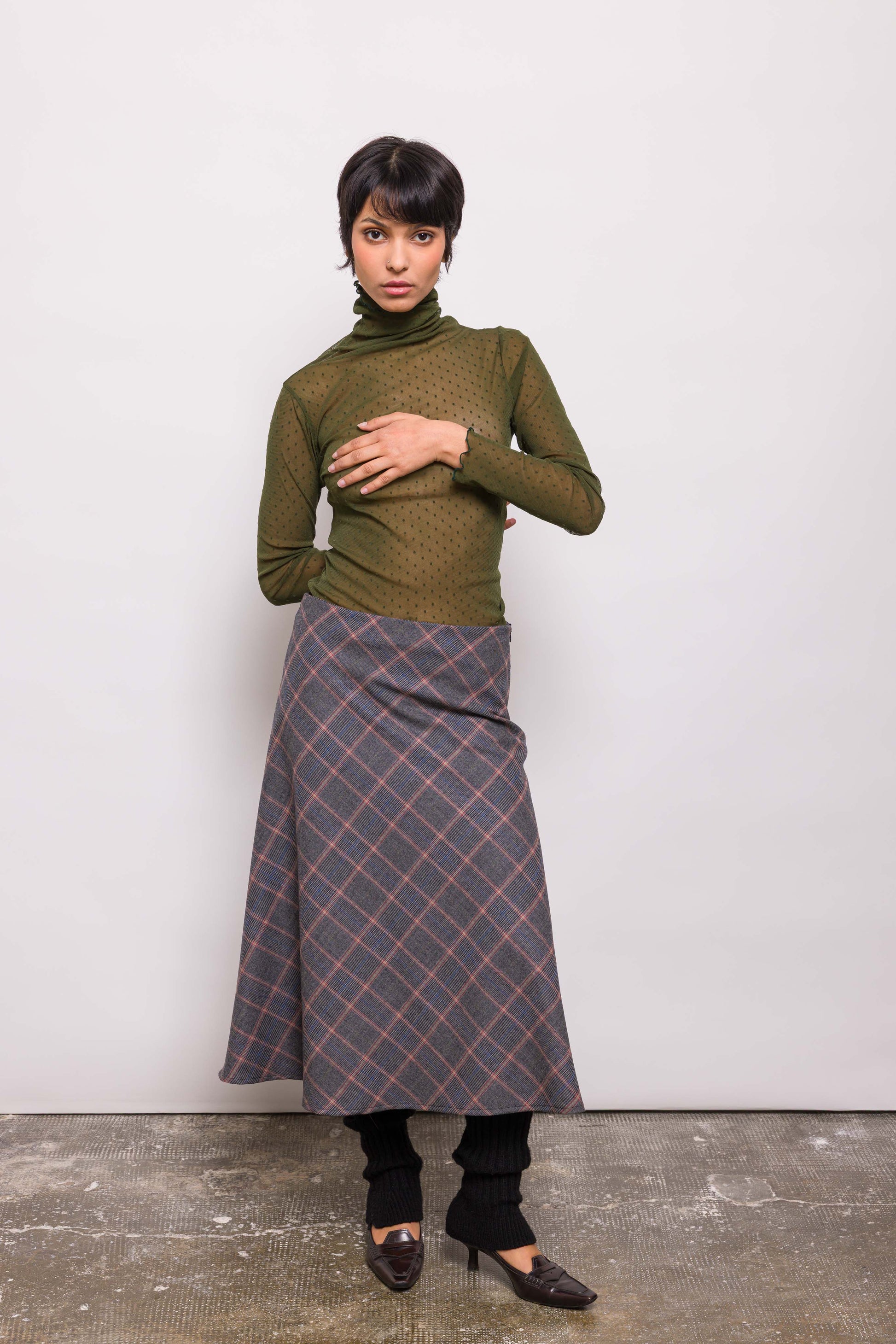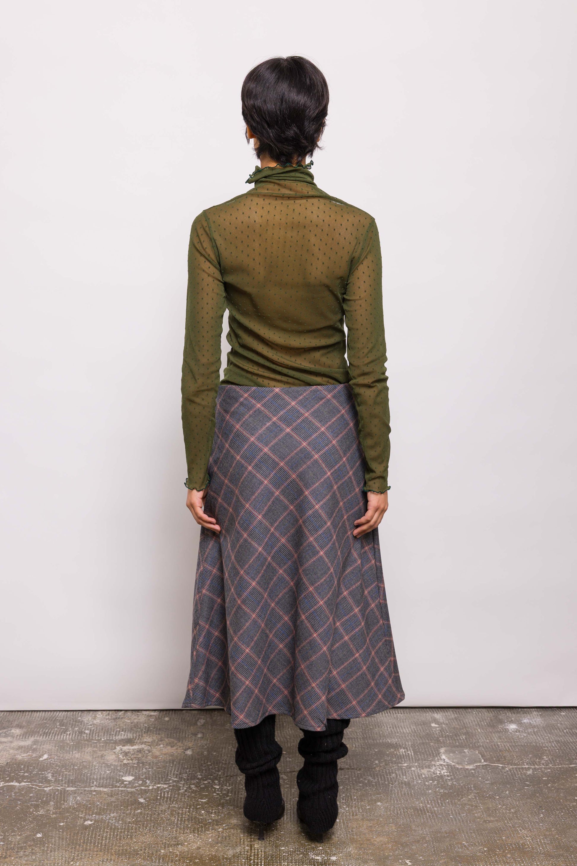 Haut près du corps en résille kaki à plumetis. Manches longues, coupe ajustée, matière stretch : Jordi se porte comme une seconde peau. À porter seul ou superposé, pour un jeu de transparence modulable.