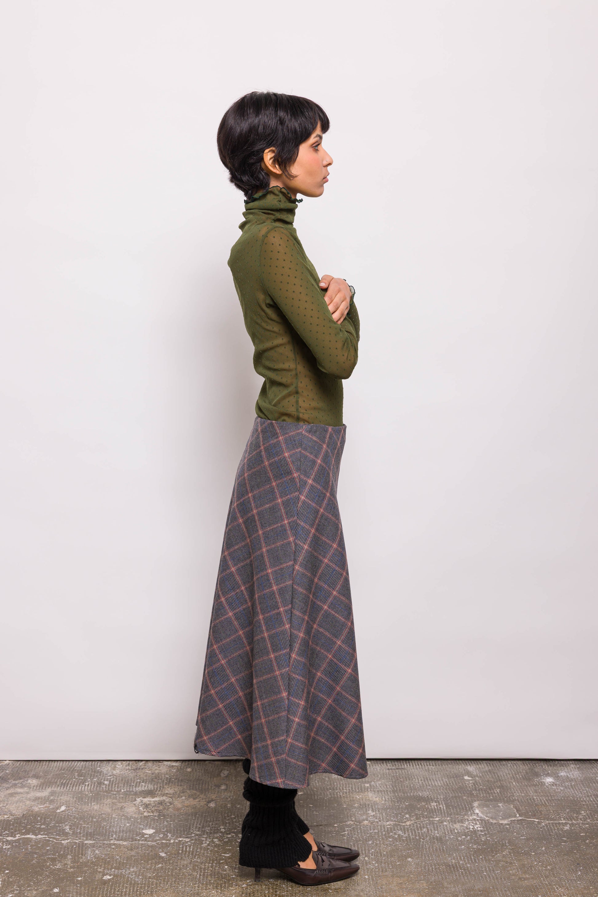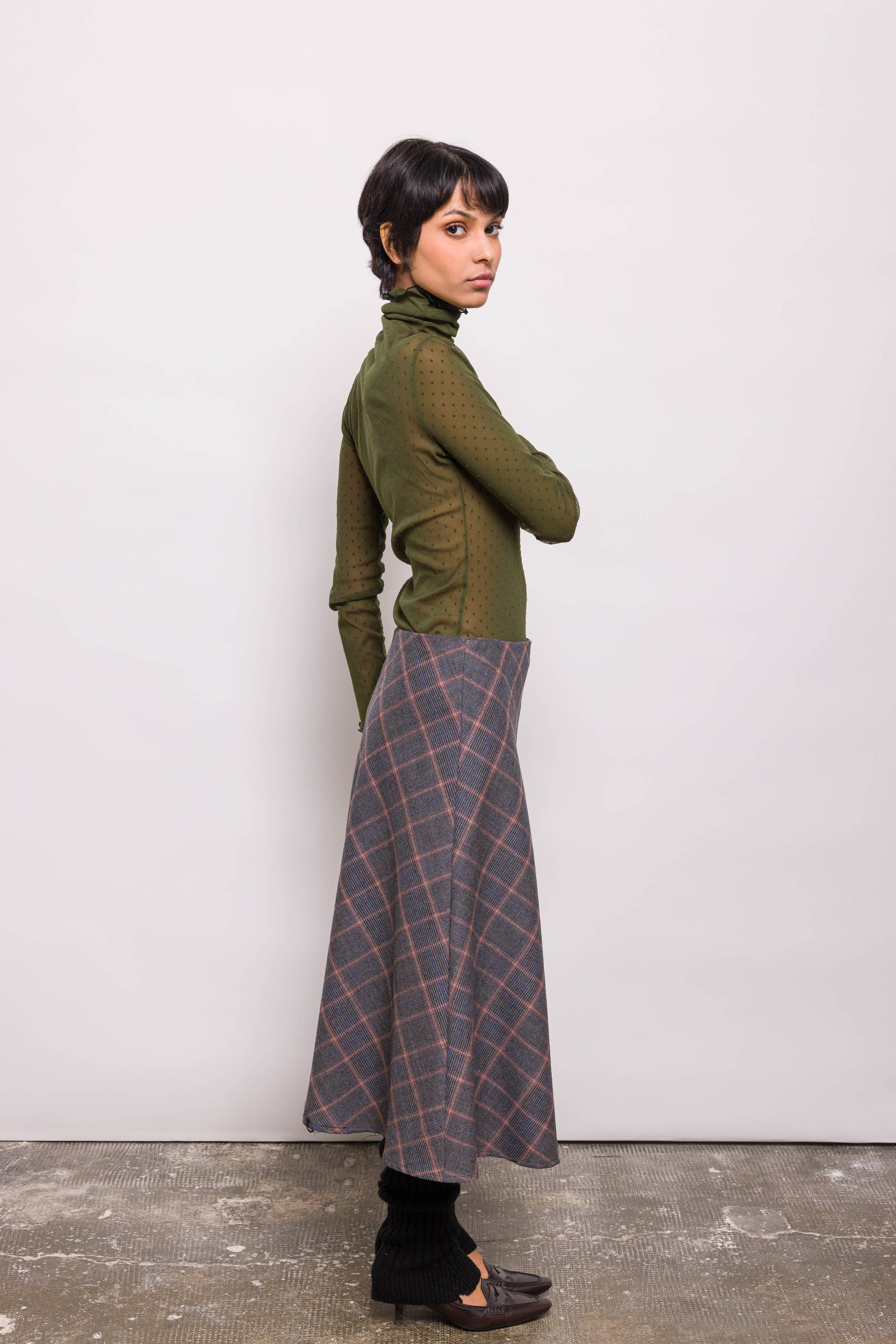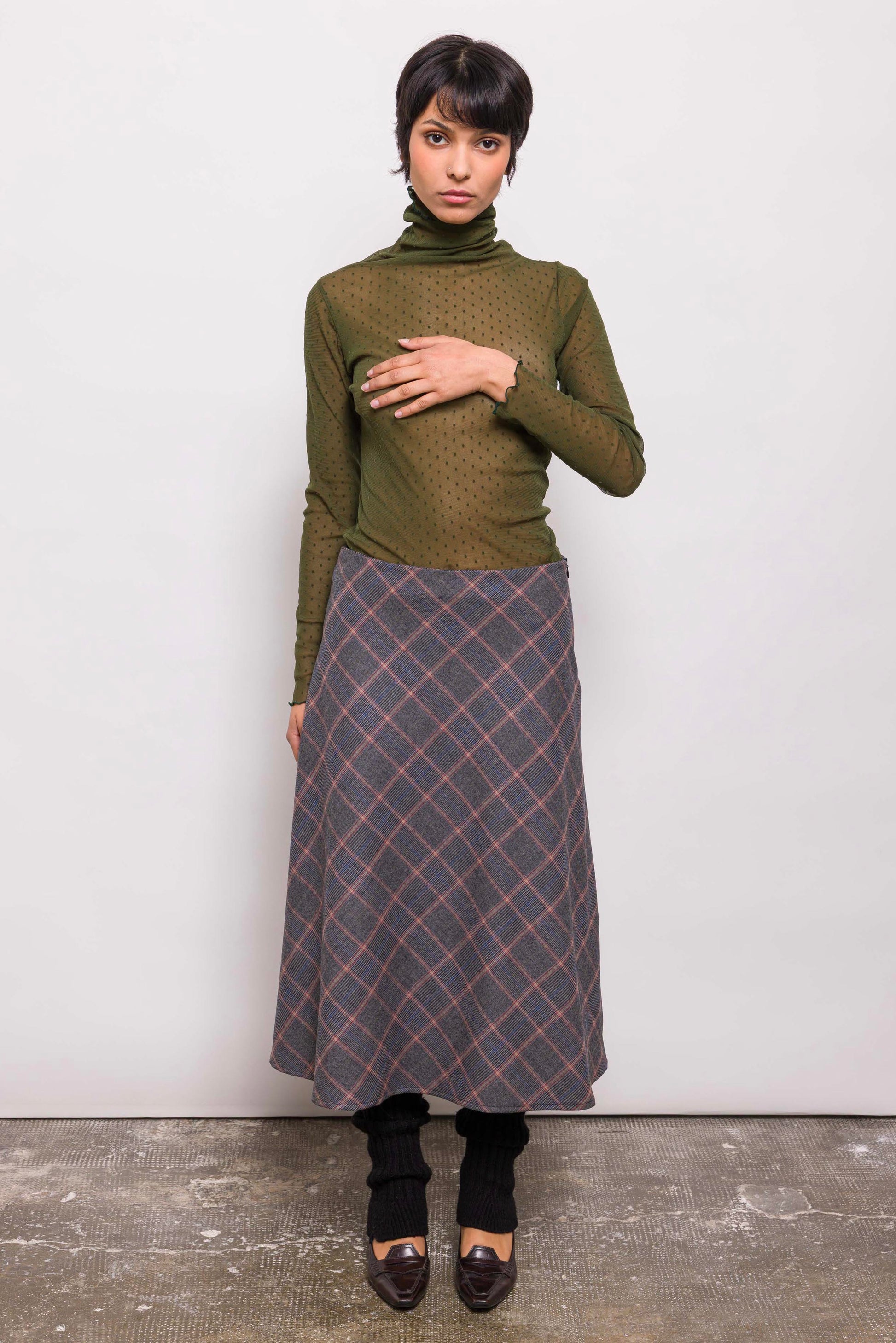 Haut près du corps en résille kaki à plumetis. Manches longues, coupe ajustée, matière stretch : Jordi se porte comme une seconde peau. À porter seul ou superposé, pour un jeu de transparence modulable.