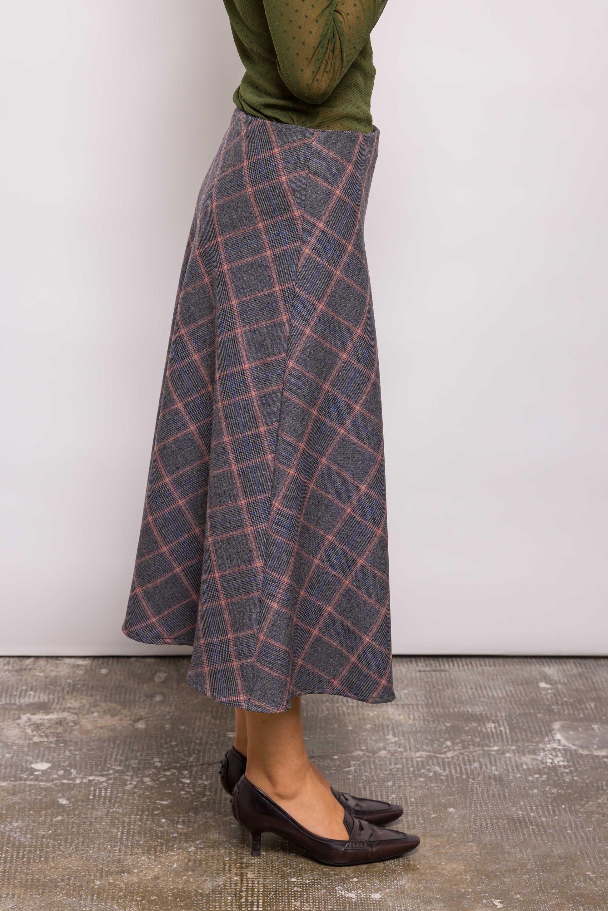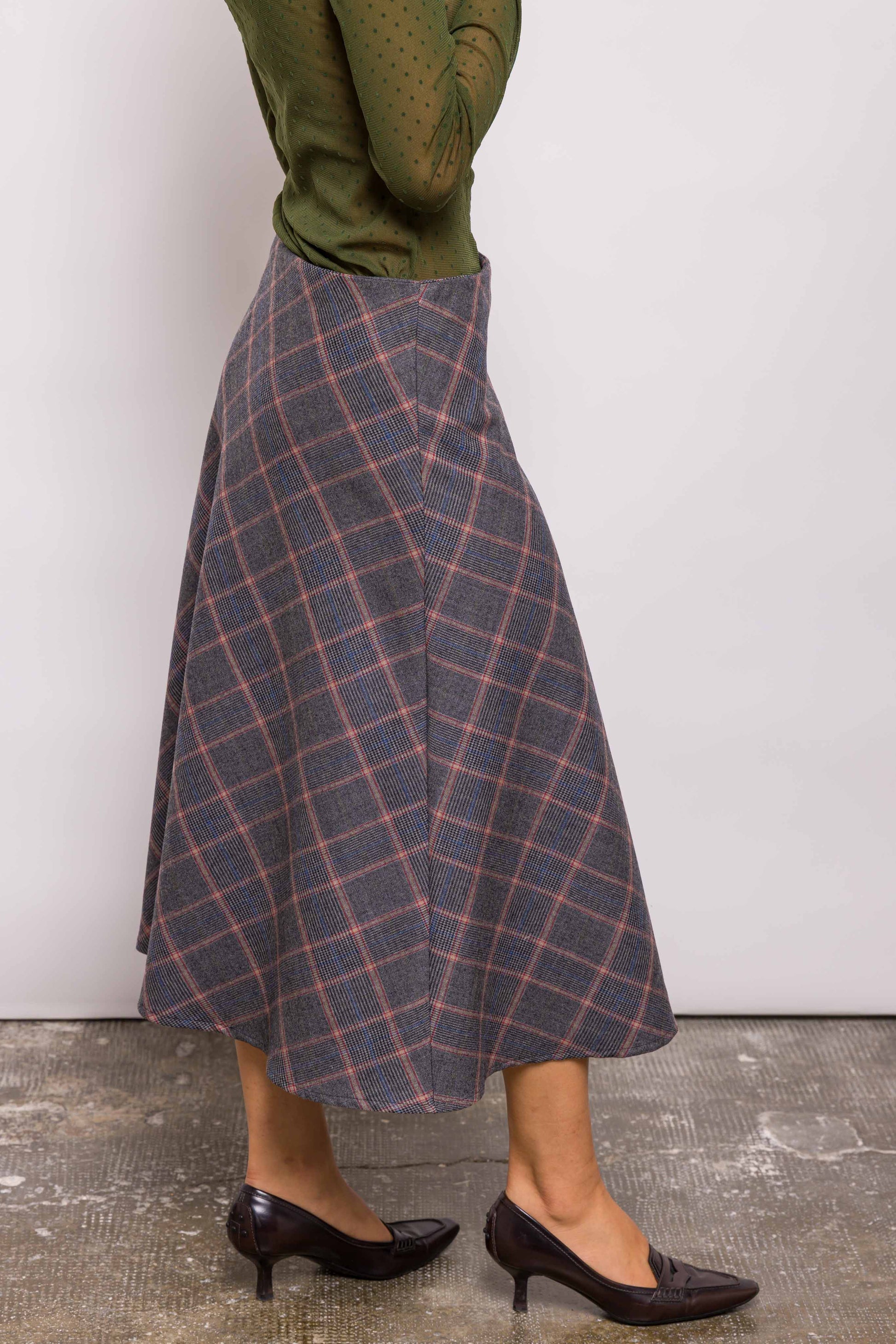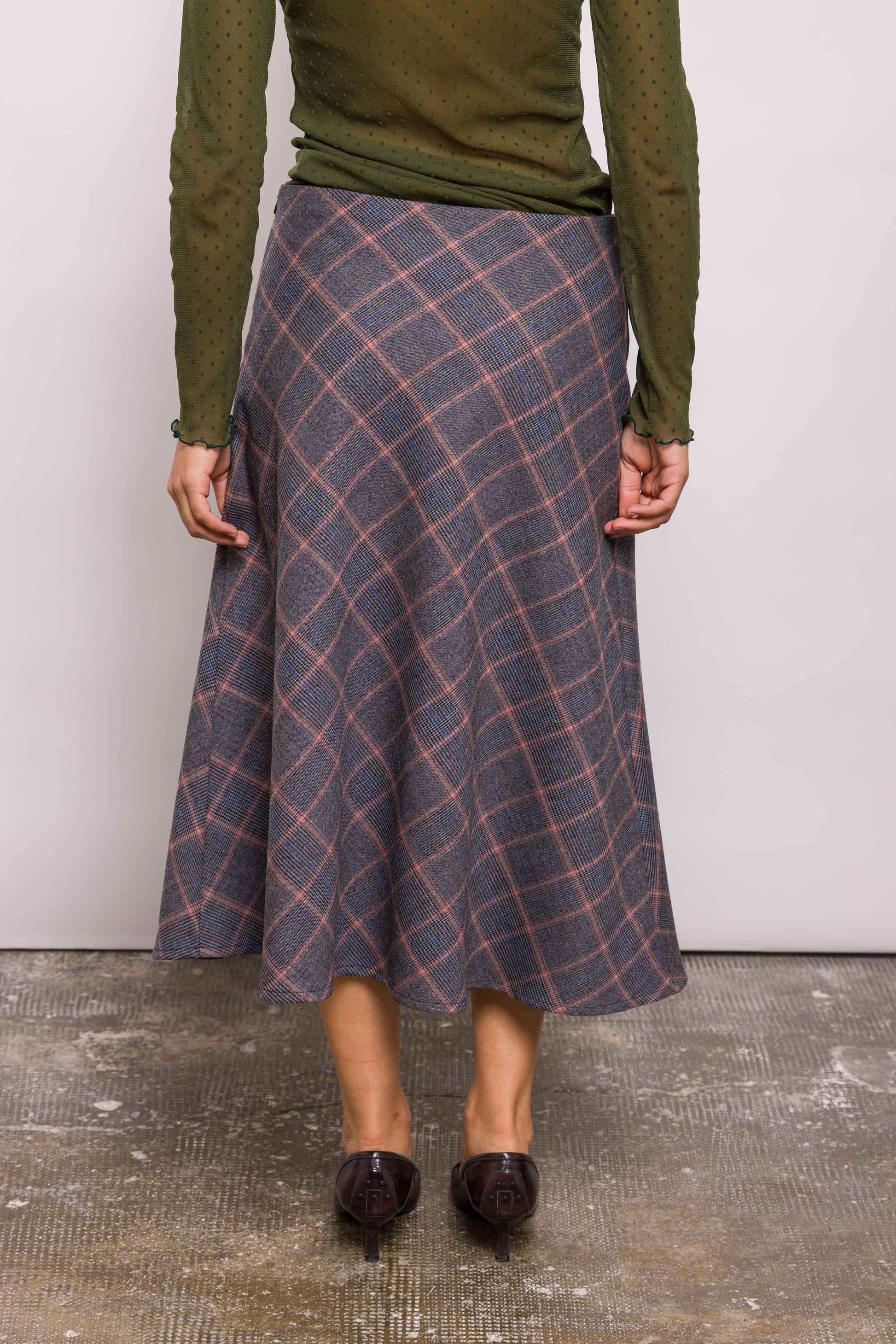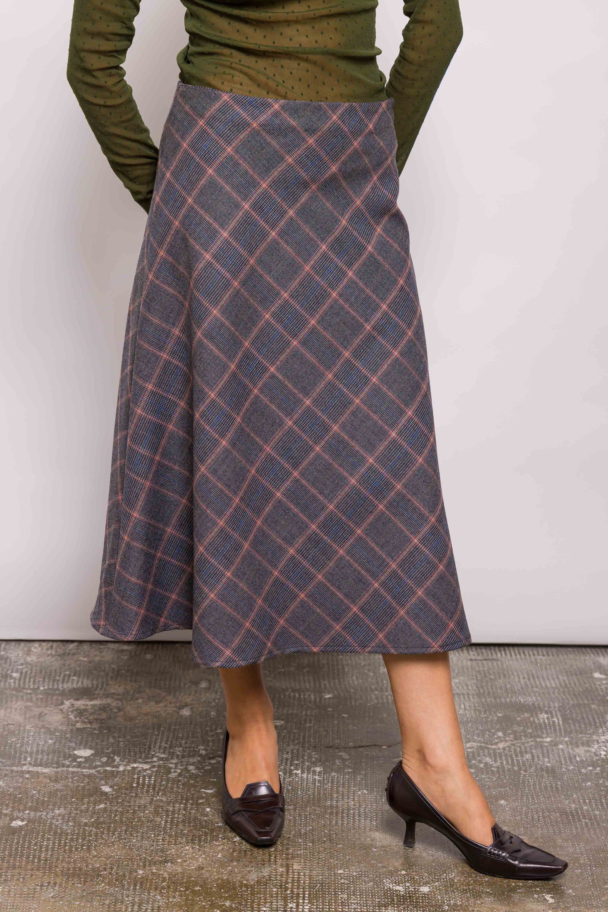 Jupe midi en lainage prince de galles, coupée plein biais pour un tombé fluide et une belle amplitude. Sa coupe souligne la silhouette sans la mouler. Élégante mais facile à vivre, elle se mixe à l’infini.. Le biais, c’est magique : il donne ce tombé dansant sans ajout de volume. Kehlia est une base forte pour toutes les silhouettes.