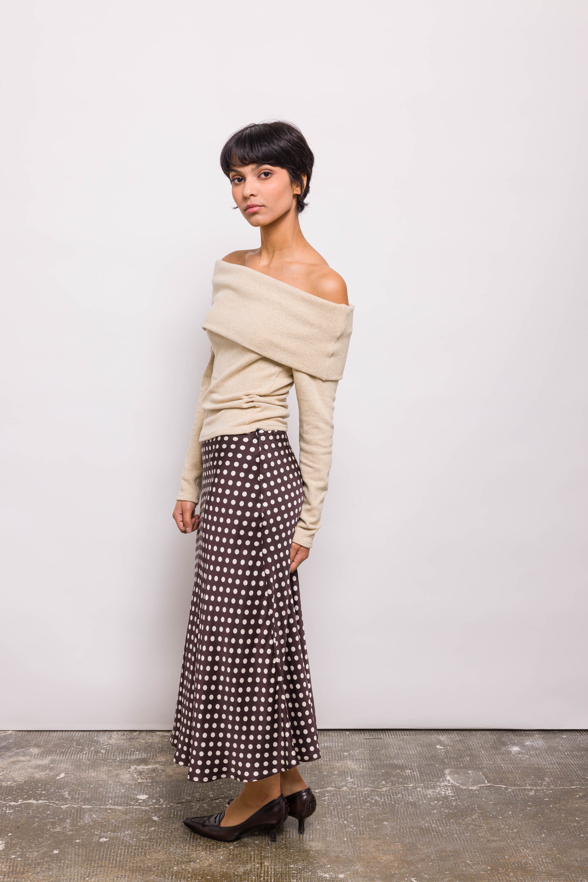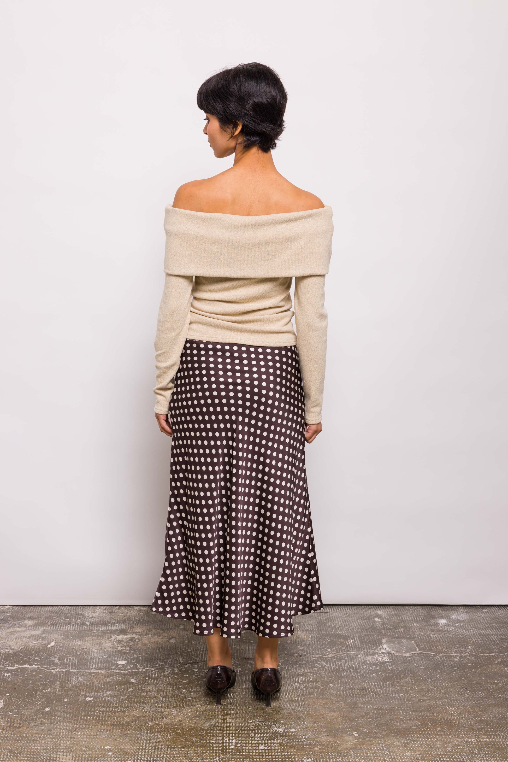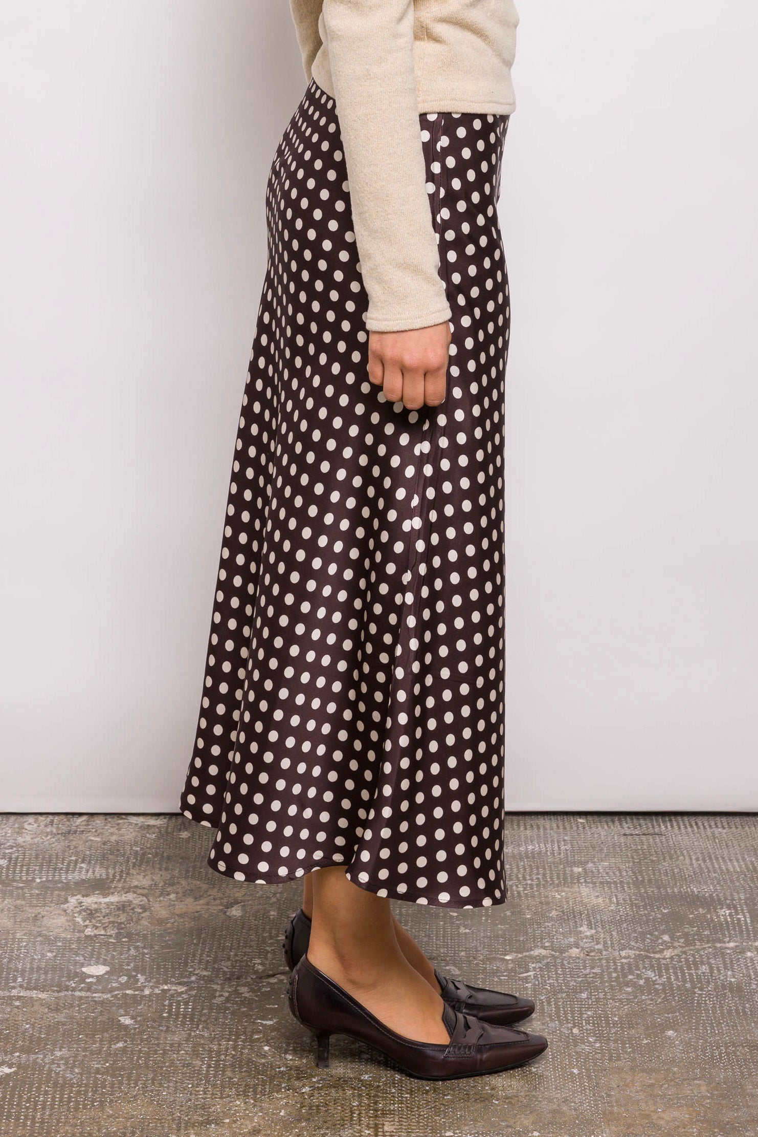 Jupe midi à pois, coupée plein biais pour un tombé fluide et une belle amplitude. Sa coupe souligne la silhouette sans la mouler. Élégante mais facile à vivre, elle se mixe à l’infini.. Le biais, c’est magique : il donne ce tombé dansant sans ajout de volume. Kehlia est une base forte pour toutes les silhouettes.