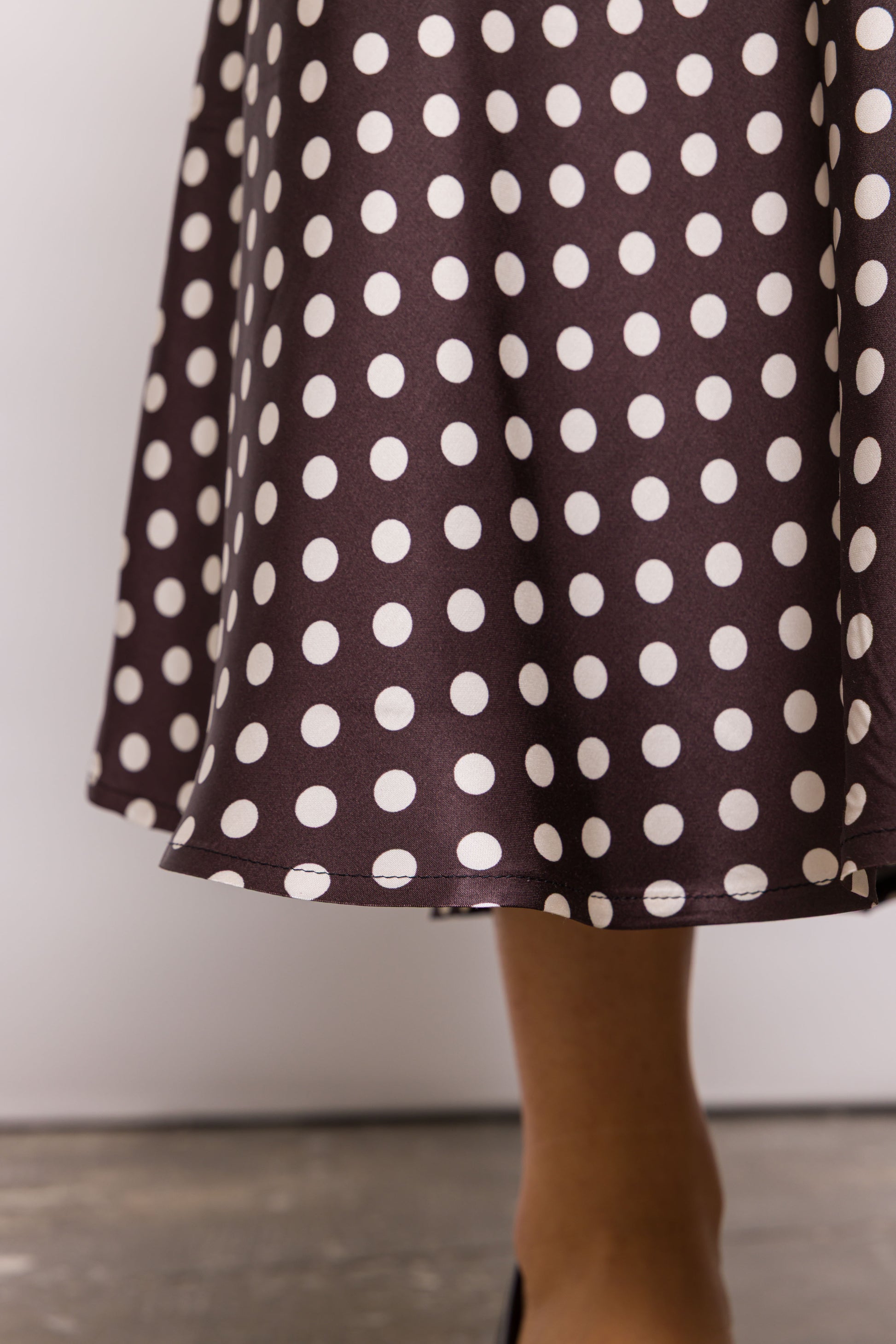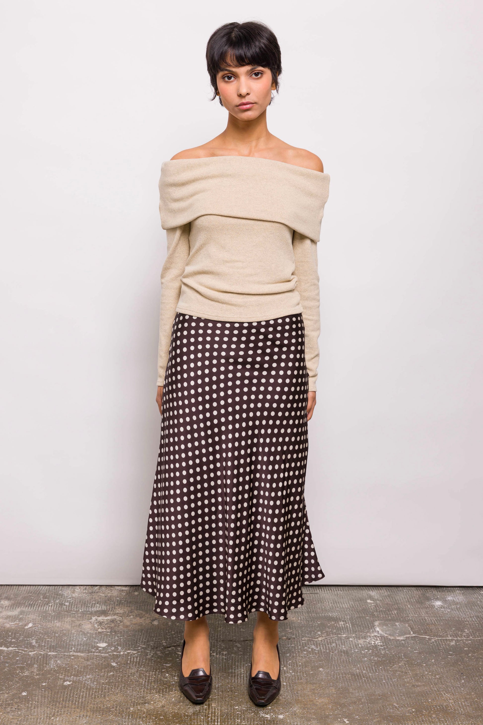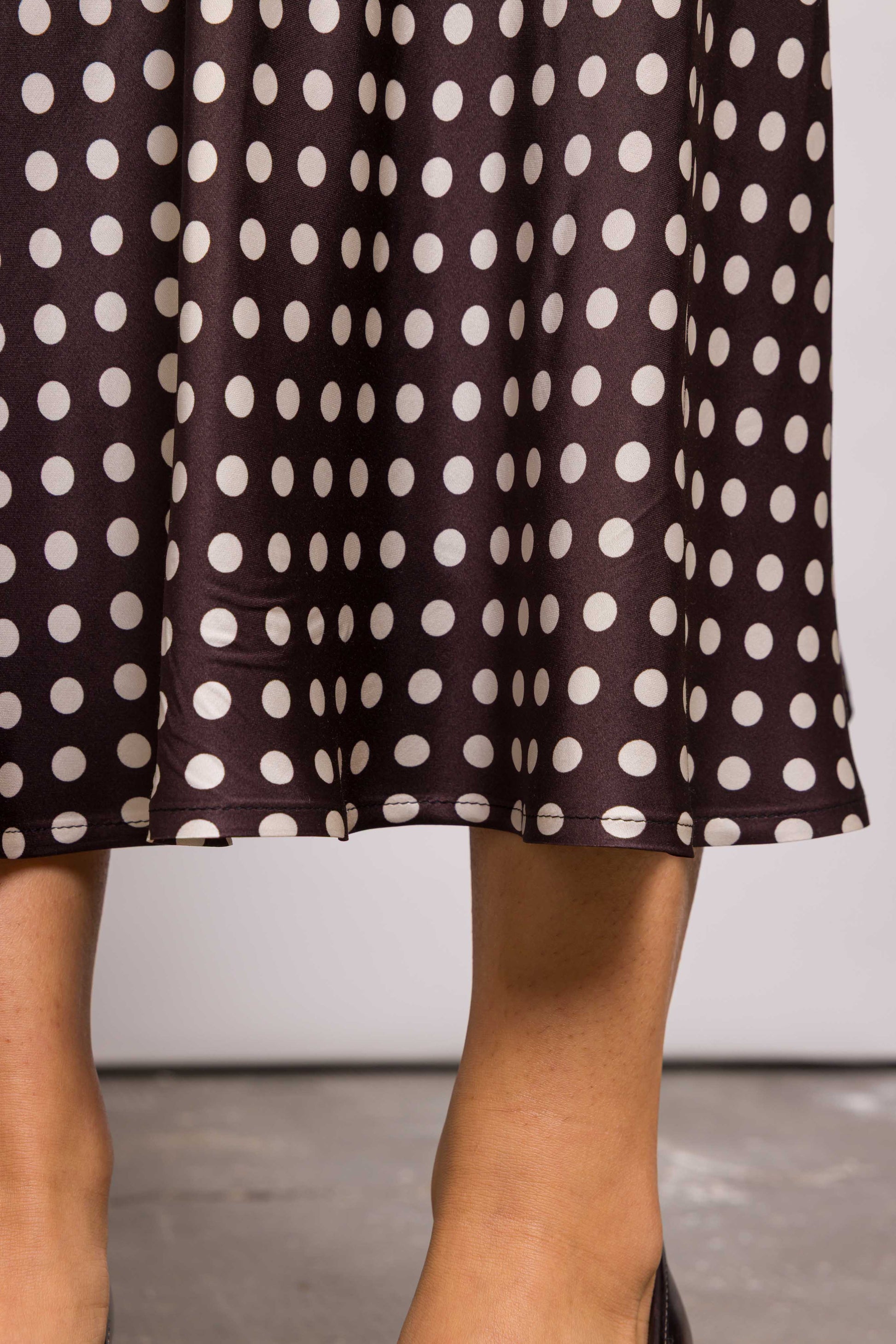 Jupe midi à pois, coupée plein biais pour un tombé fluide et une belle amplitude. Sa coupe souligne la silhouette sans la mouler. Élégante mais facile à vivre, elle se mixe à l’infini.. Le biais, c’est magique : il donne ce tombé dansant sans ajout de volume. Kehlia est une base forte pour toutes les silhouettes.