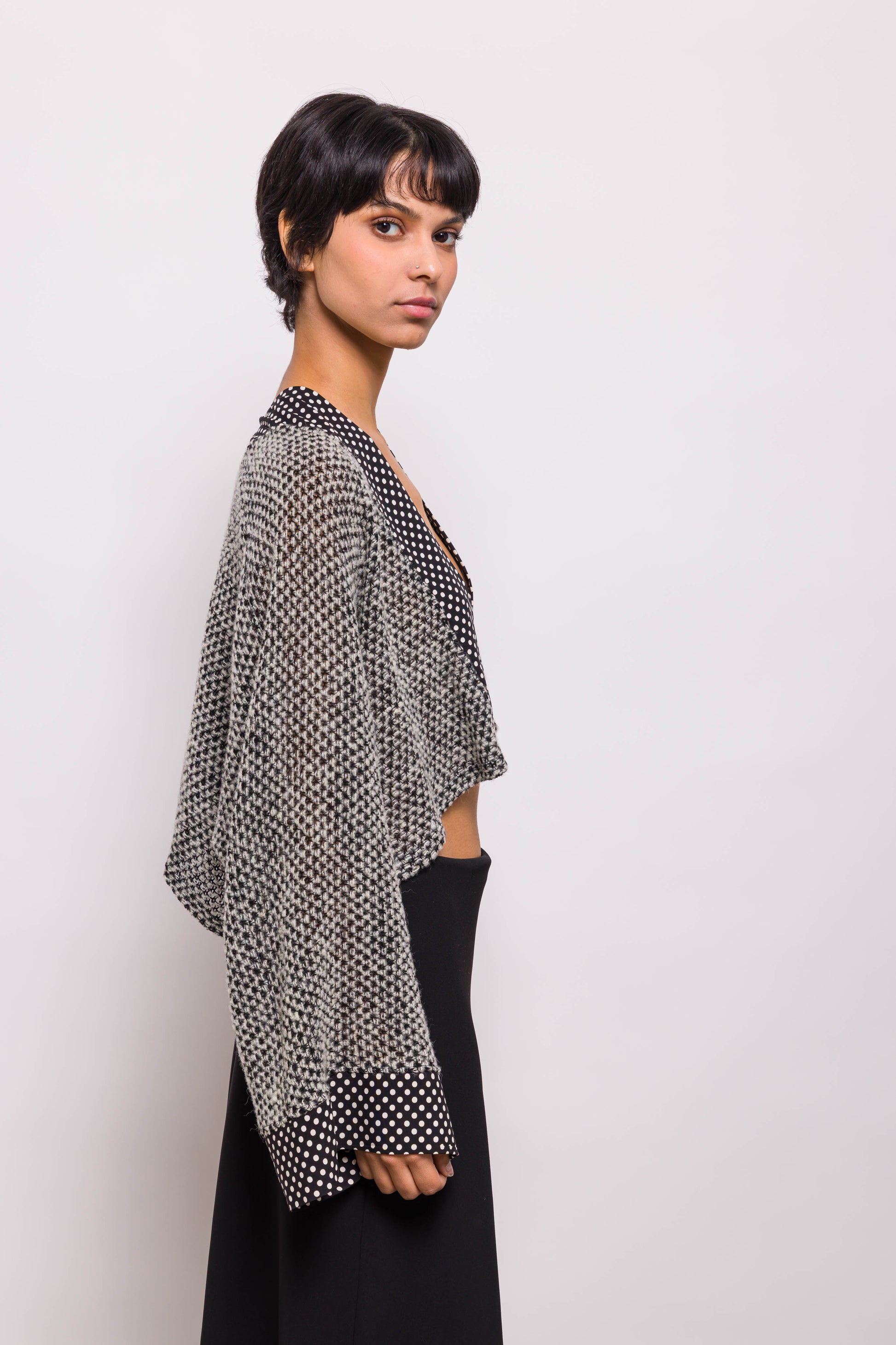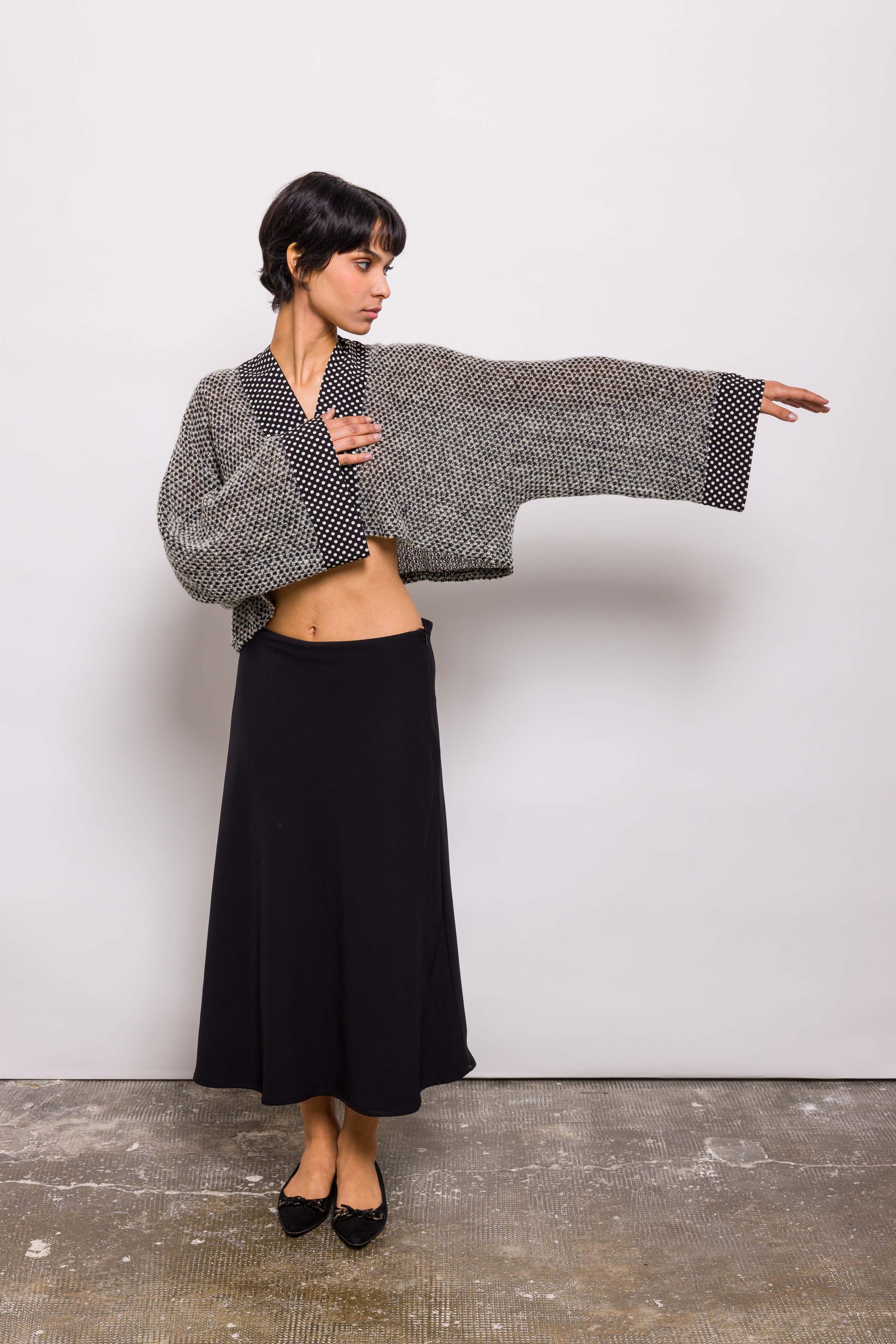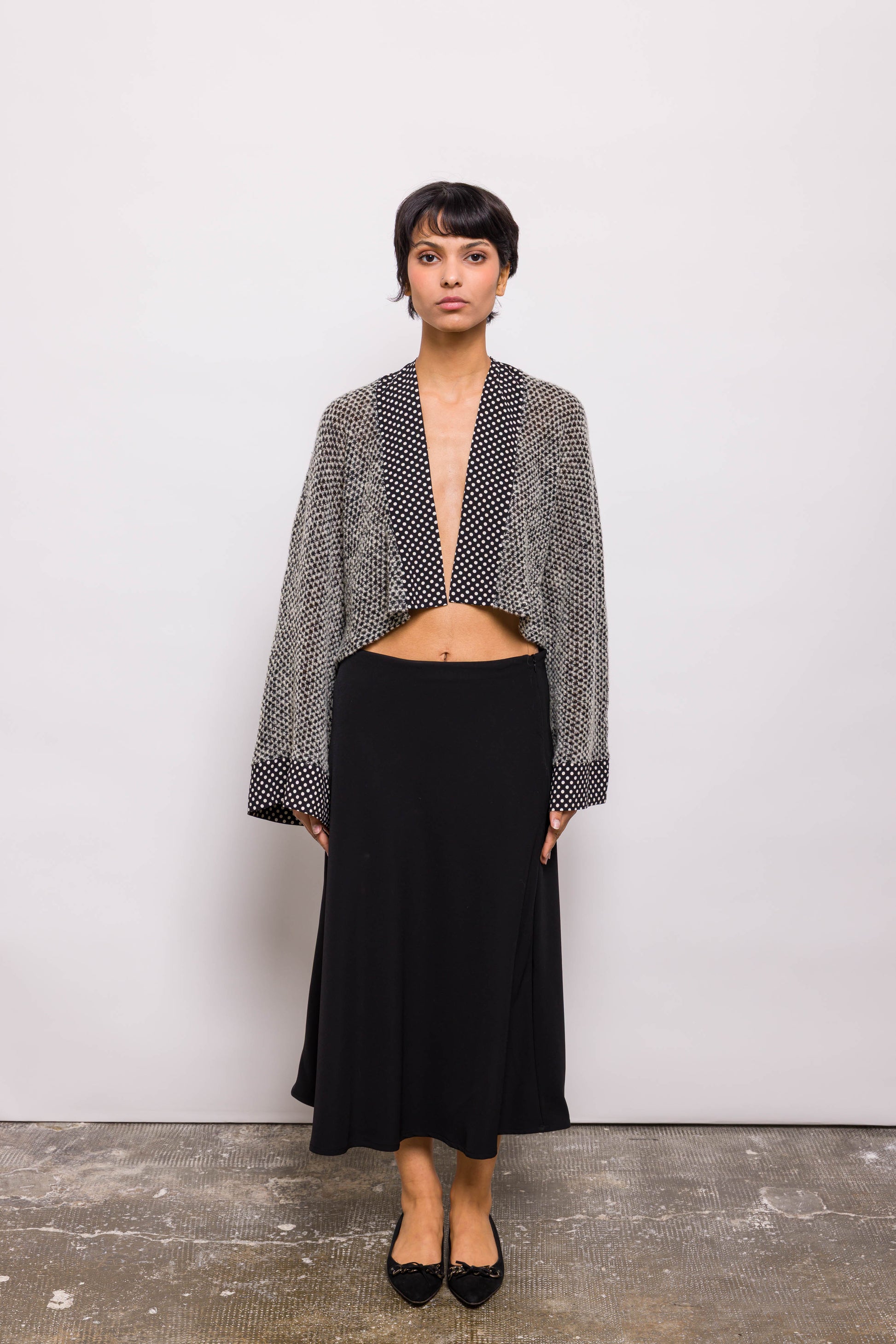 John revisite le kimono avec une coupe graphique, courte et ample, pensée pour twister une silhouette sobre. Son tissu en laine légère noir et beige apporte du relief sans alourdir, tandis que le contraste des poignets et du col à pois noirs et blancs signe un look typiquement Marieve. Il se porte ouvert sur une robe, un pantalon taille haute ou à même la peau pour les plus audacieuses. On aime son tombé souple, son volume équilibré, et le travail du col en V qui allonge la silhouette.