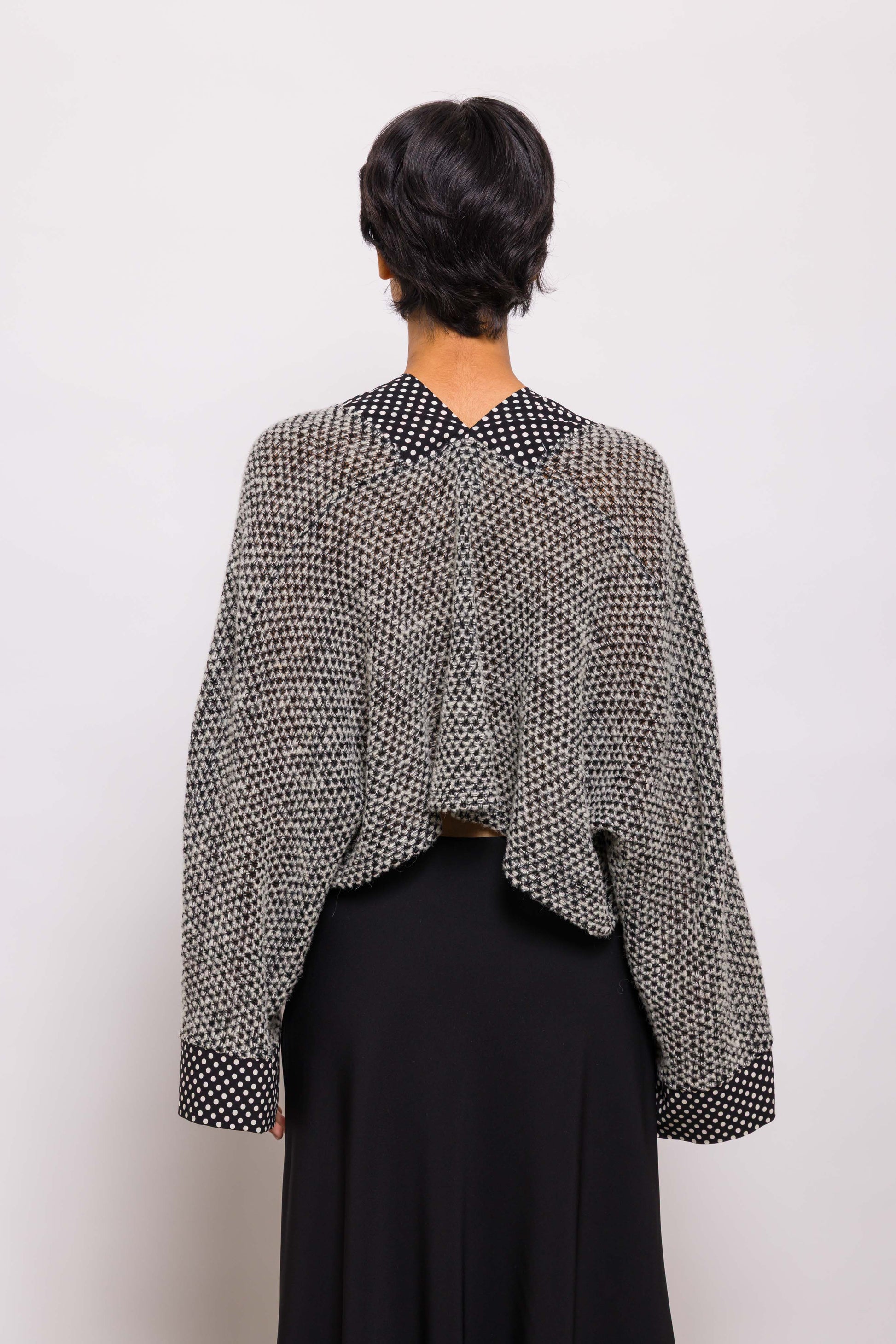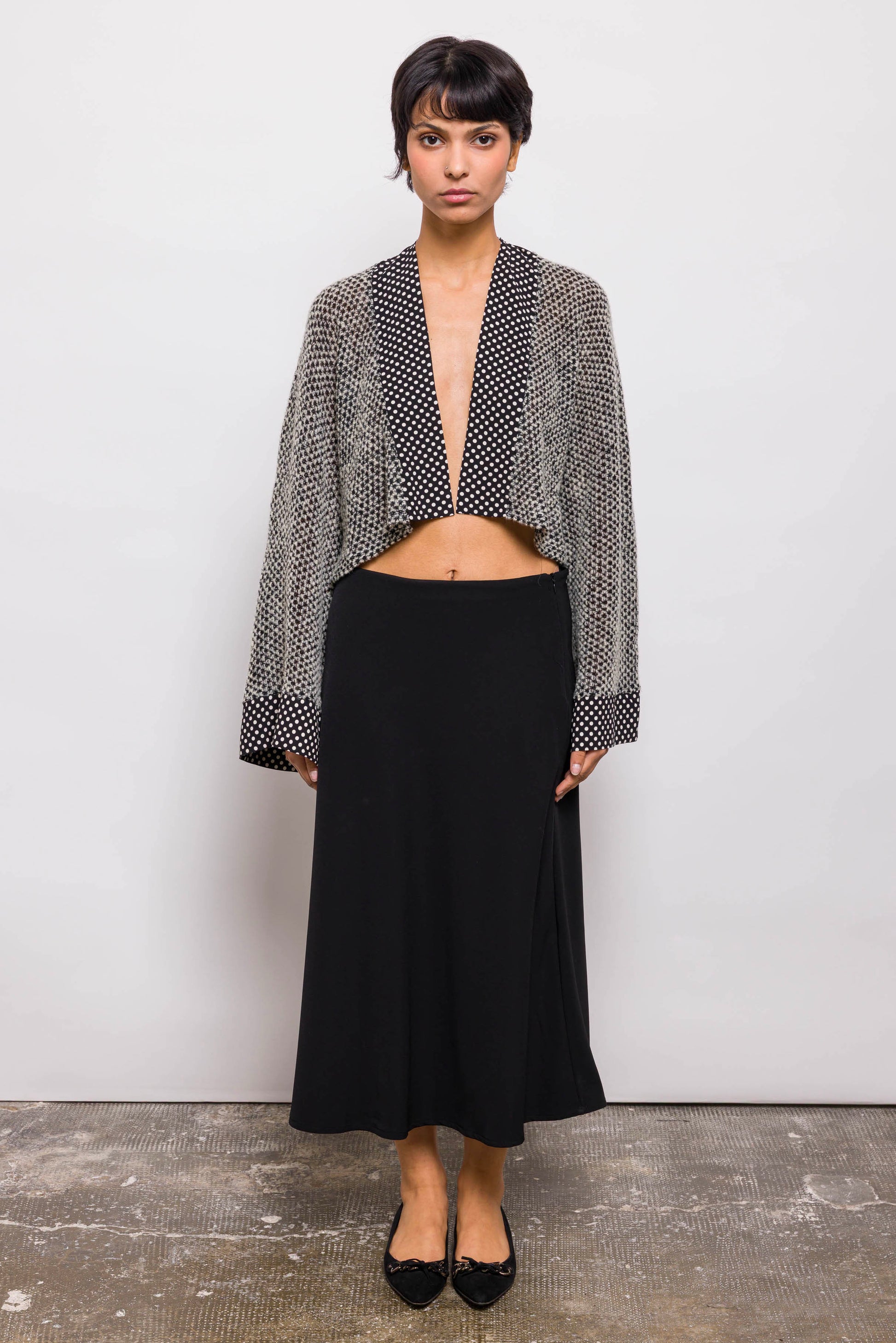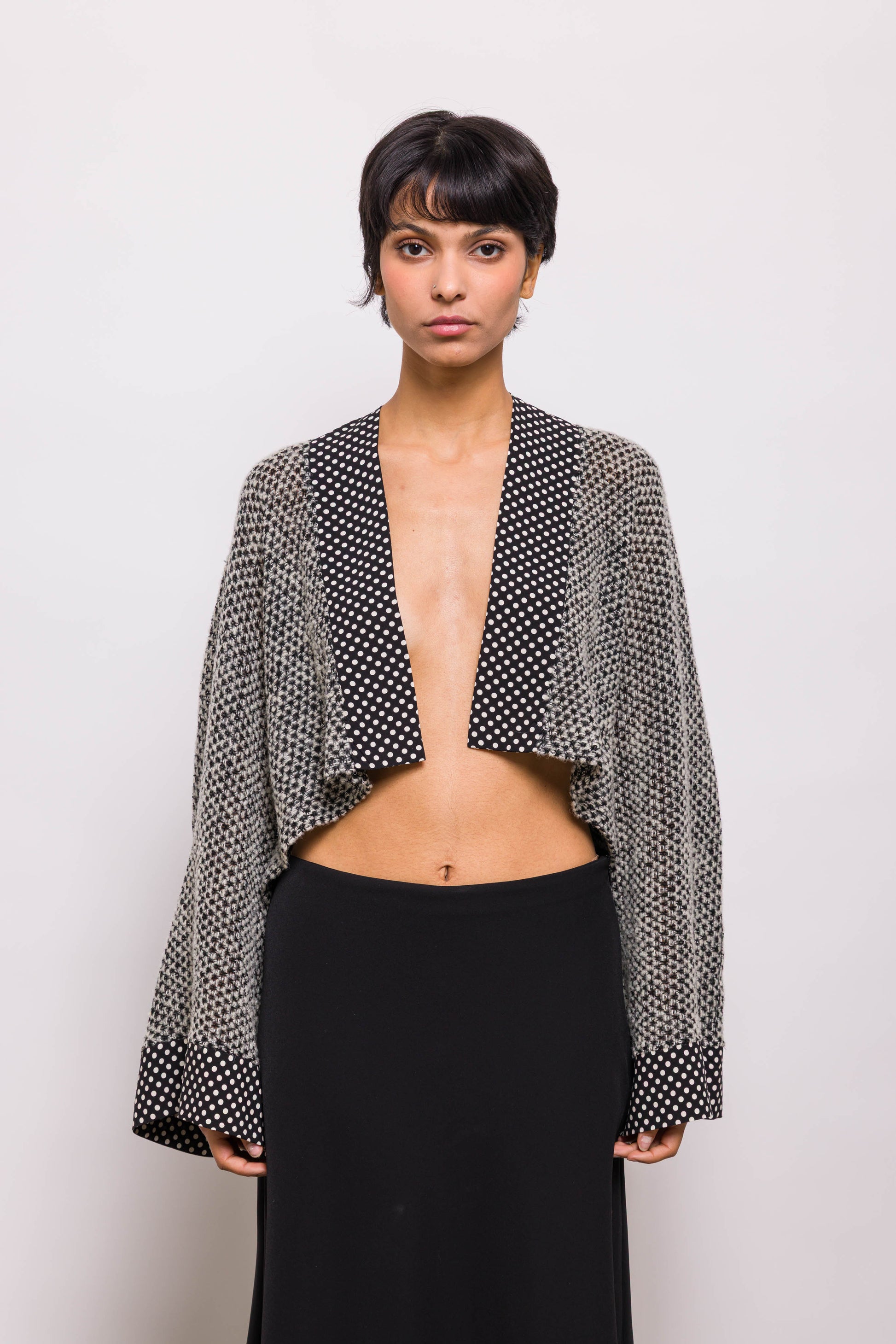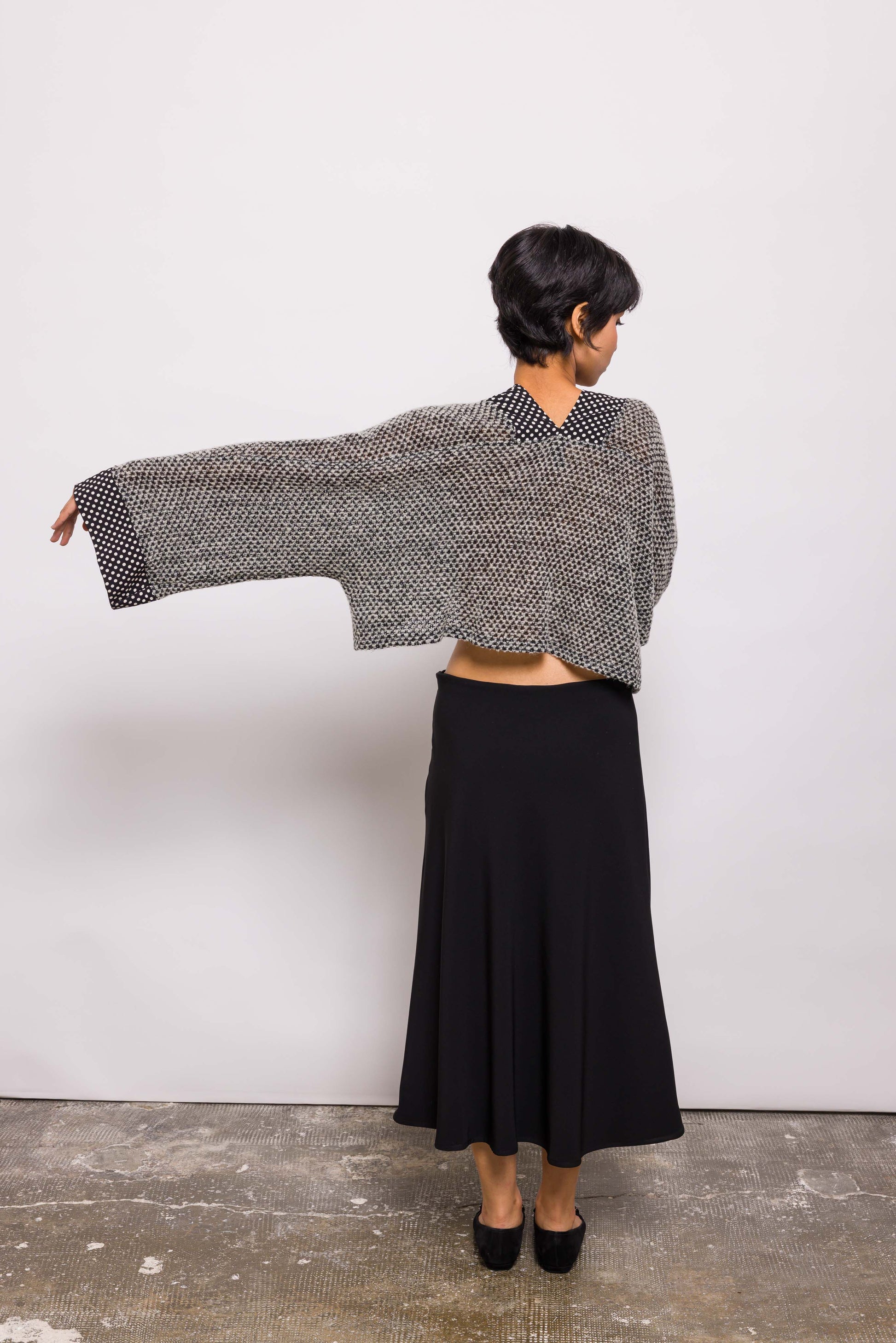 John revisite le kimono avec une coupe graphique, courte et ample, pensée pour twister une silhouette sobre. Son tissu en laine légère noir et beige apporte du relief sans alourdir, tandis que le contraste des poignets et du col à pois noirs et blancs signe un look typiquement Marieve. Il se porte ouvert sur une robe, un pantalon taille haute ou à même la peau pour les plus audacieuses. On aime son tombé souple, son volume équilibré, et le travail du col en V qui allonge la silhouette.