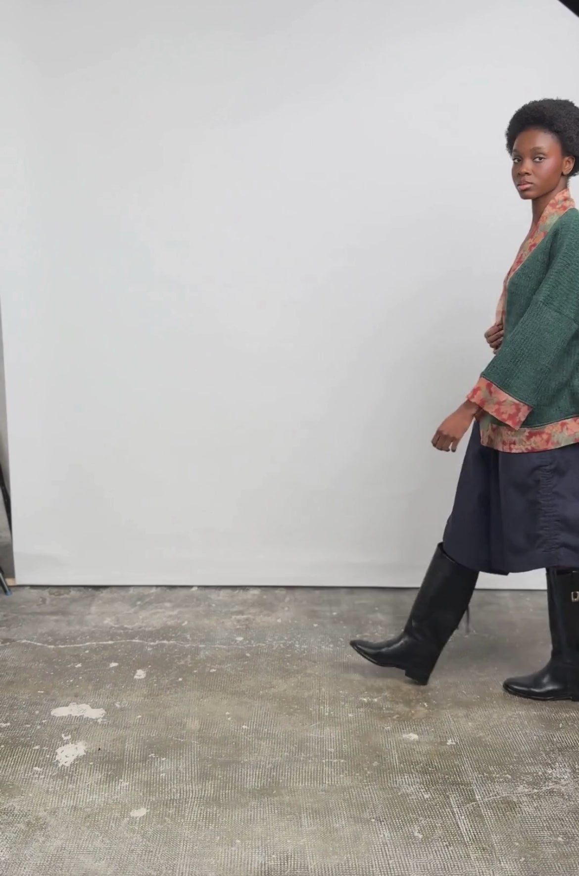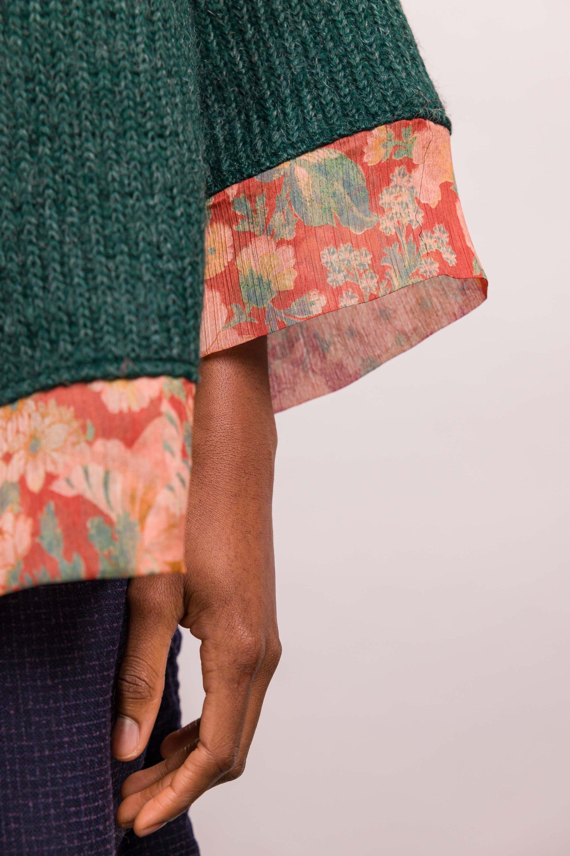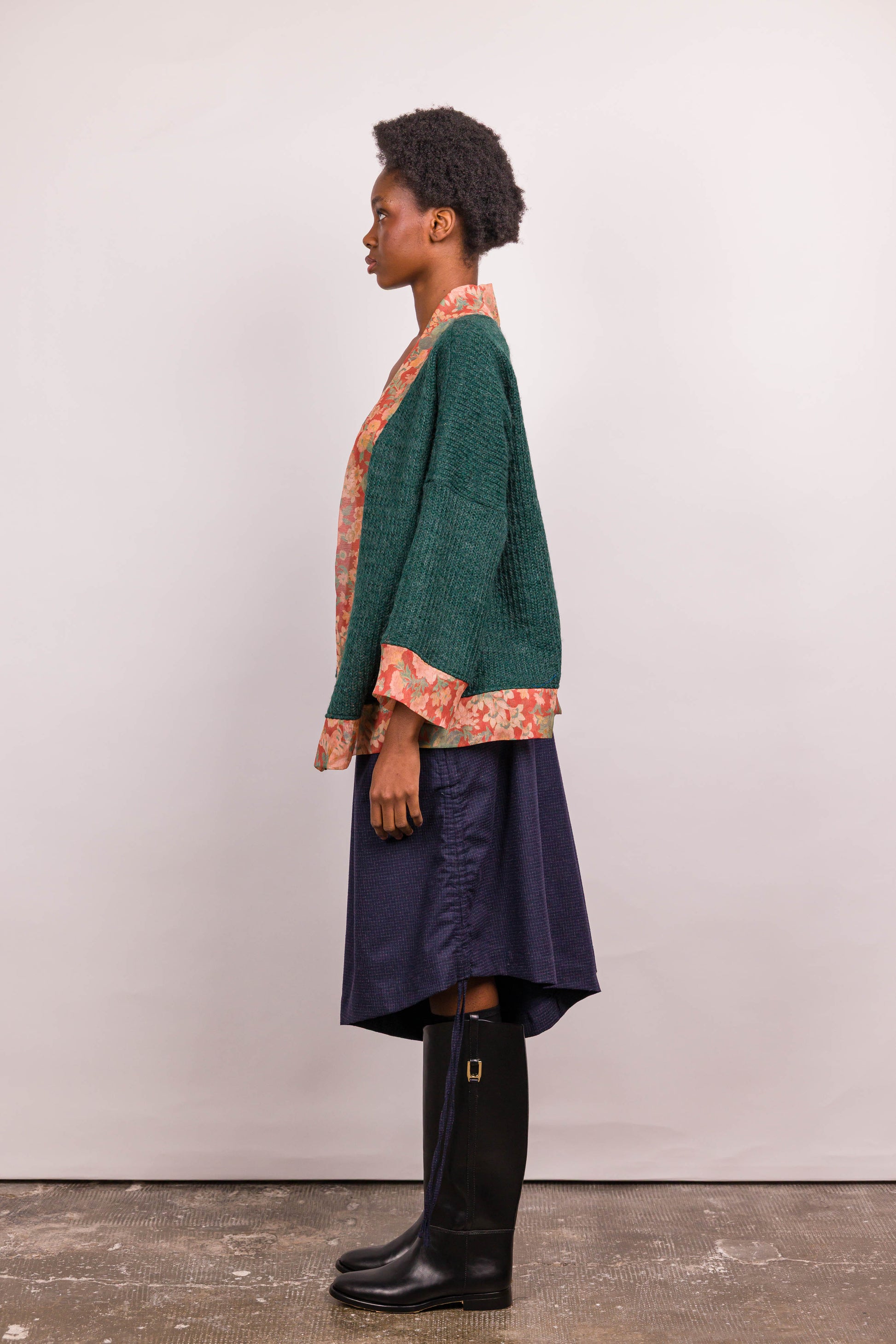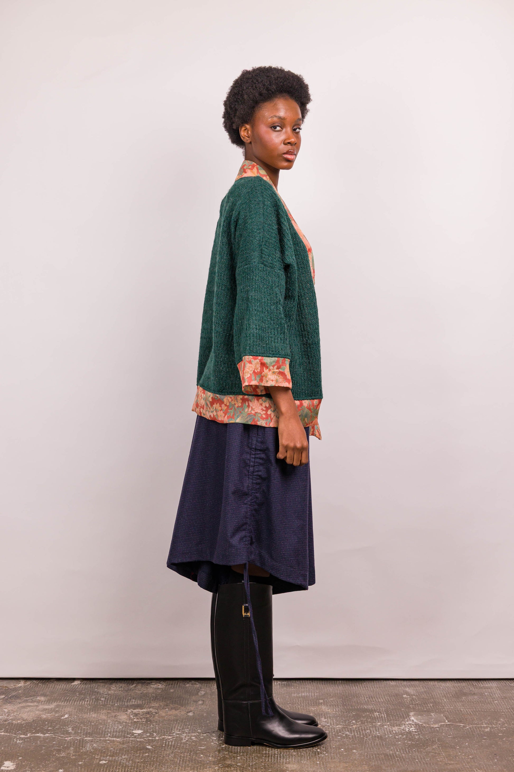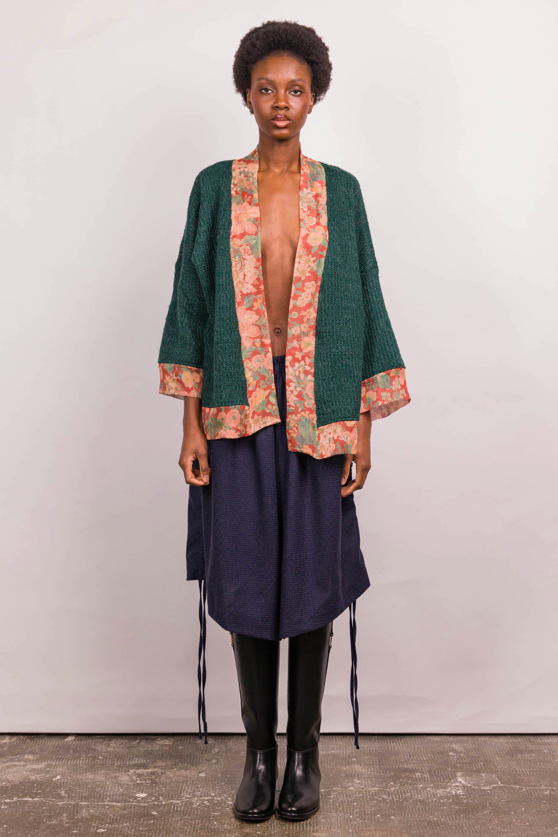 Ce kimono se distingue par son jeu de matières et de contrastes. Sa coupe droite et ample offre une silhouette fluide, facile à porter au quotidien. Le corps en maille verte apporte texture et profondeur, tandis que les parementures, poignets et bas contrastés en imprimé fleuri réchauffent l’ensemble et signent son identité.