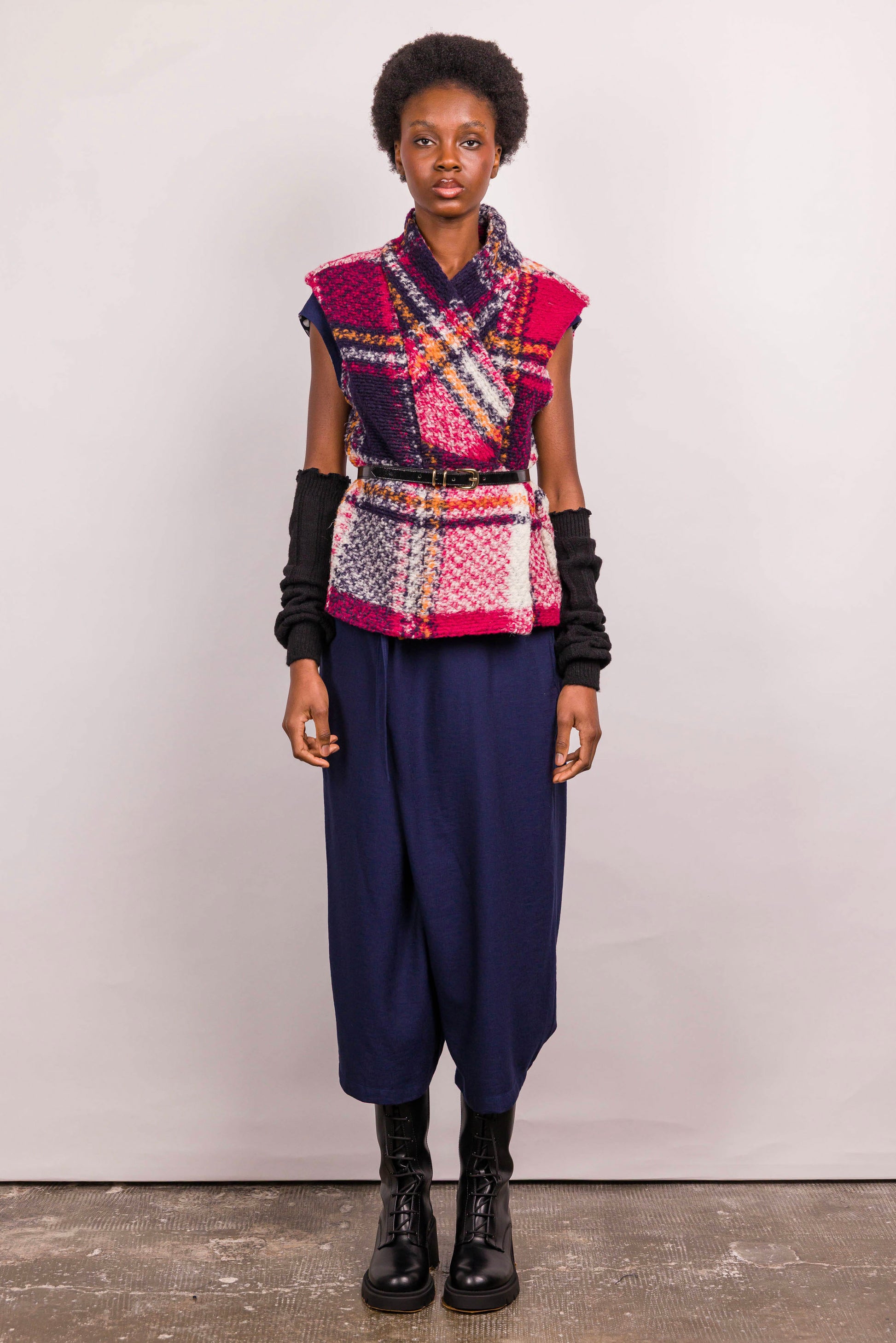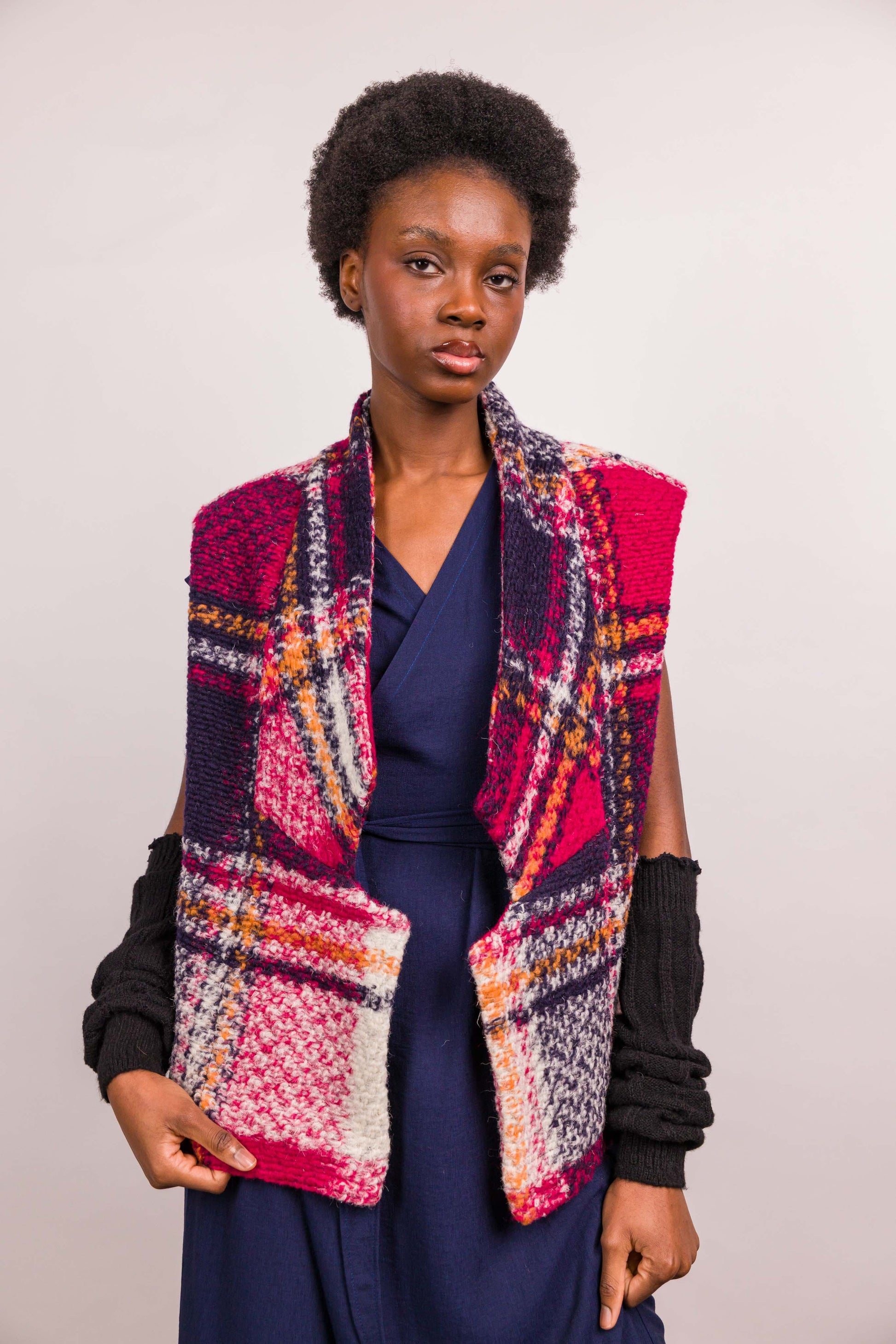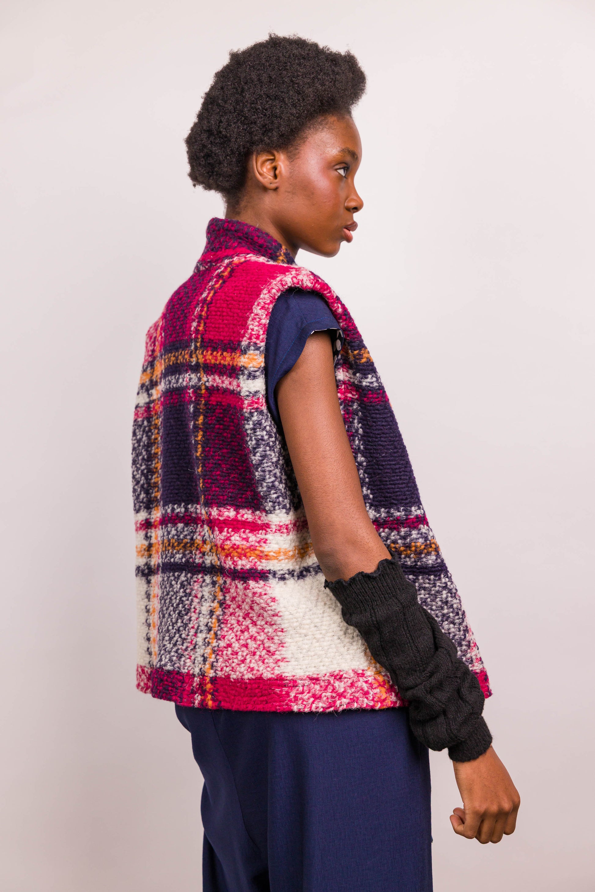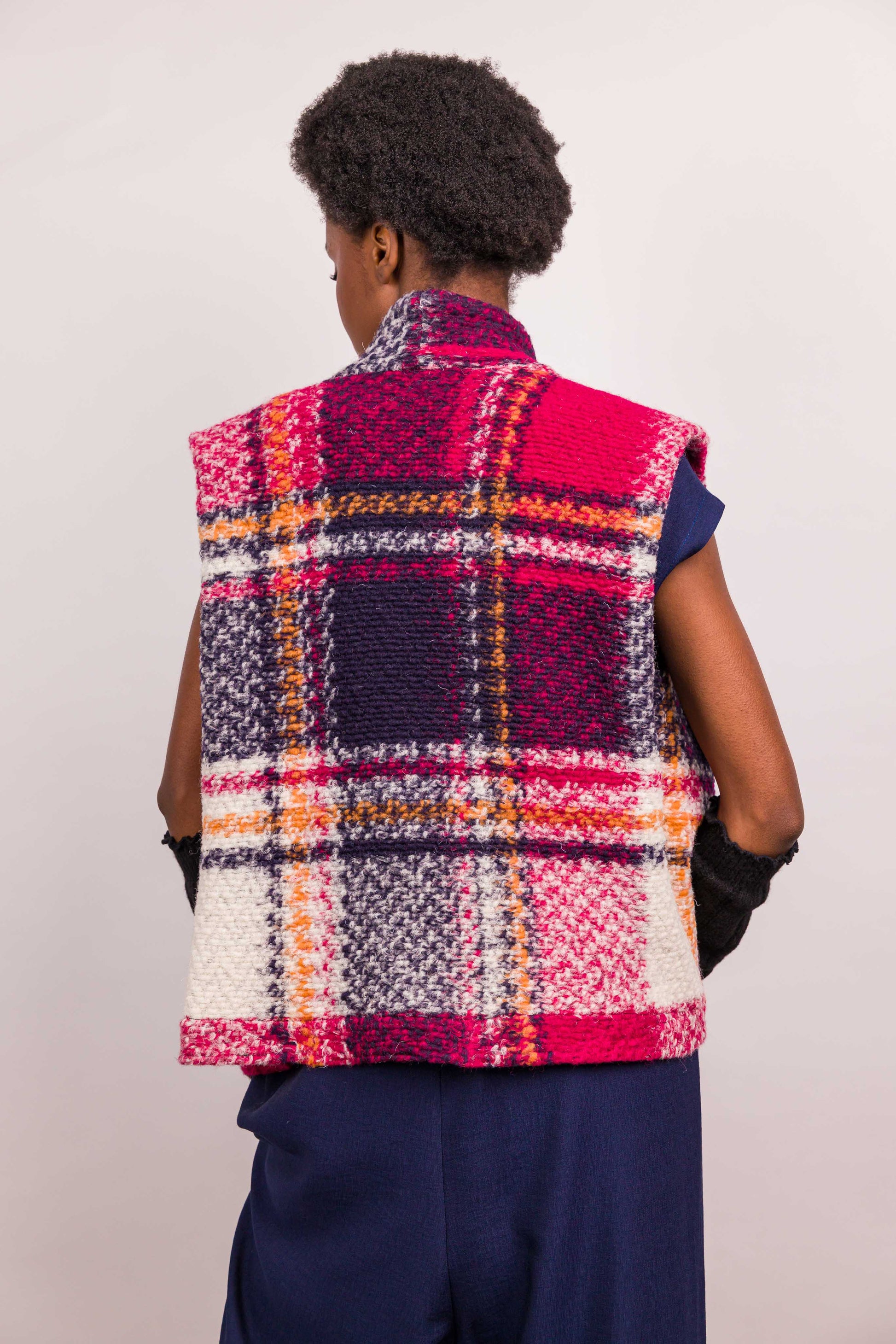 La veste Leona se décline ici dans une version écossaise forte et chaleureuse, toujours sans manches, pensée comme une alternative moderne au tailleur classique. Sa coupe ample et droite structure la silhouette tout en conservant une grande liberté de mouvement.