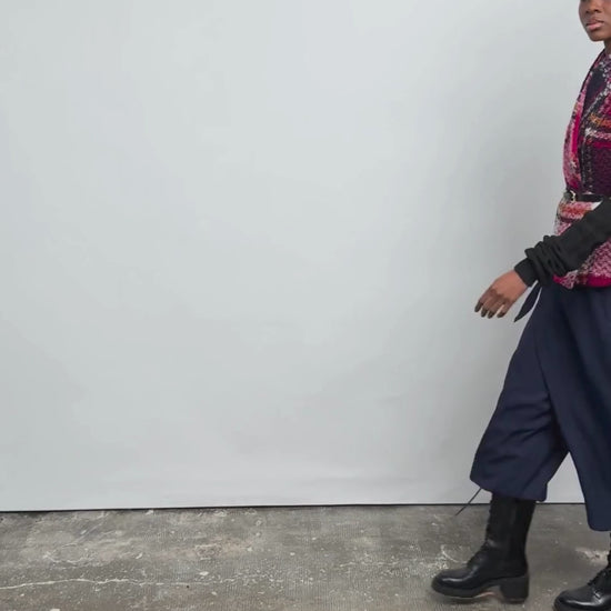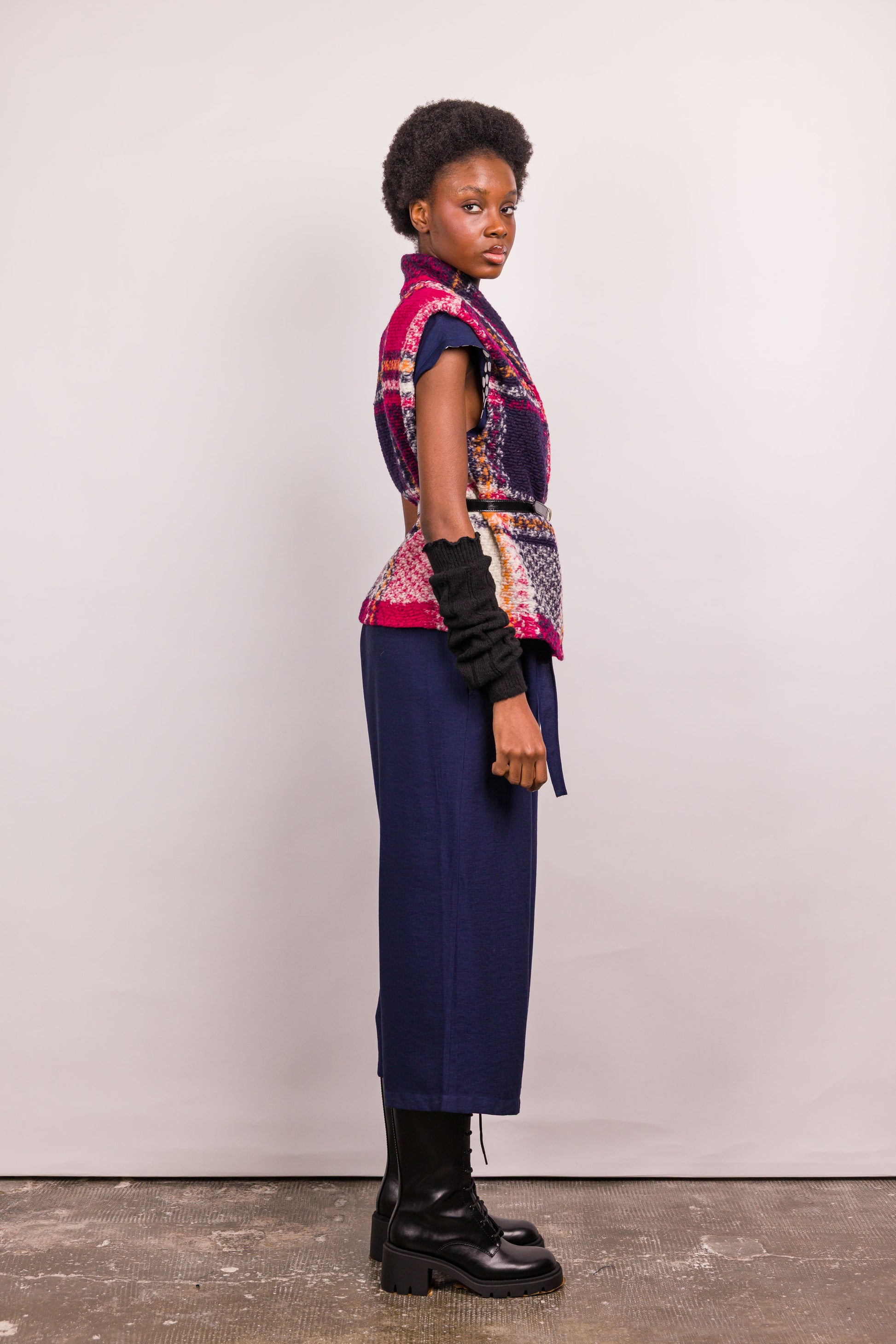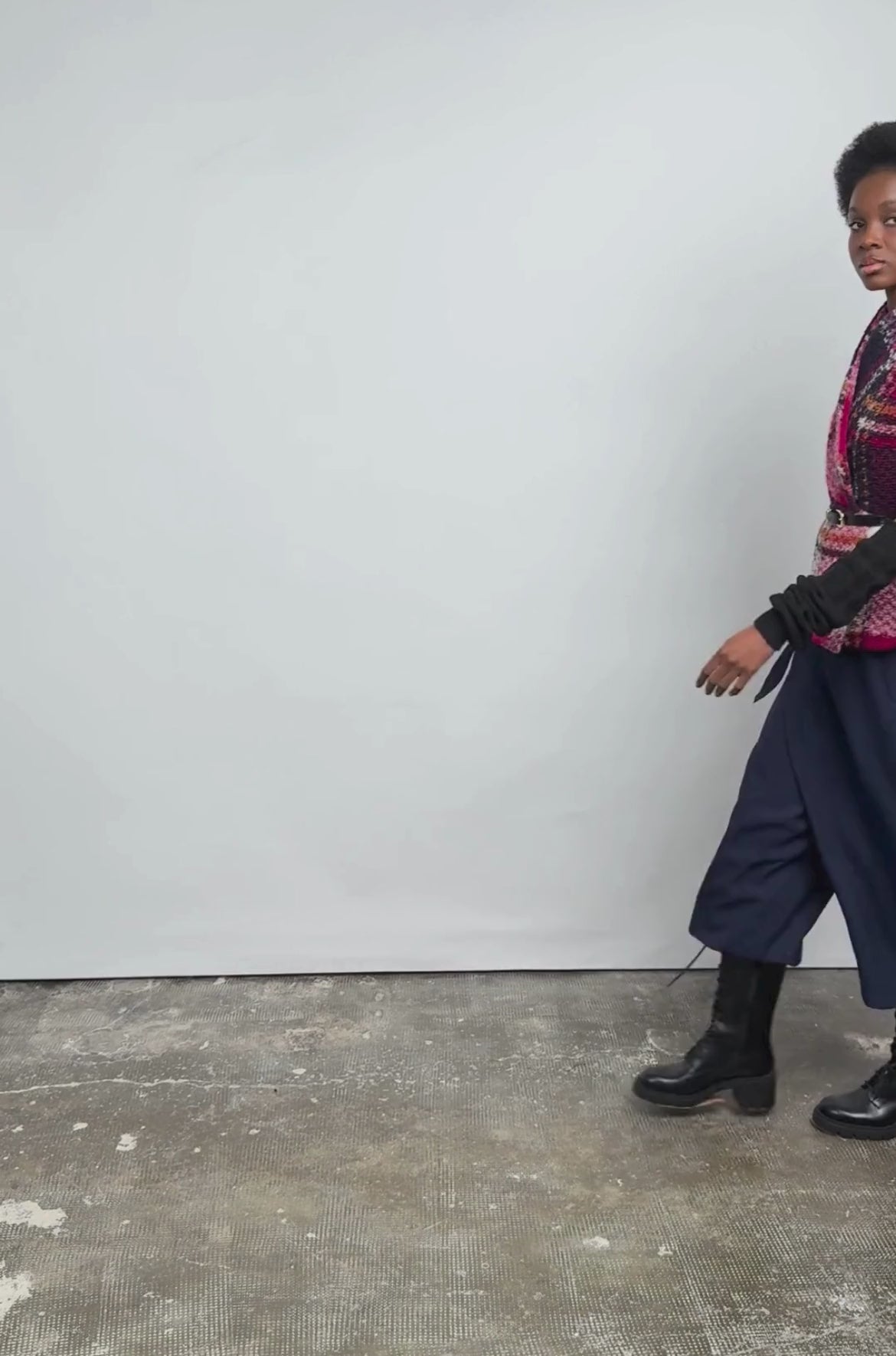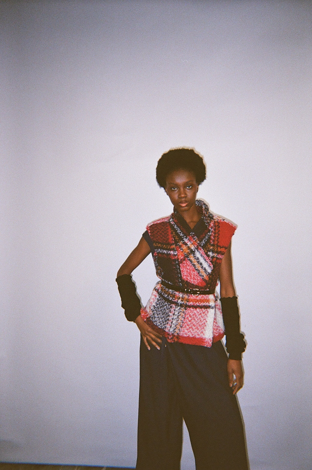 La veste Leona se décline ici dans une version écossaise forte et chaleureuse, toujours sans manches, pensée comme une alternative moderne au tailleur classique. Sa coupe ample et droite structure la silhouette tout en conservant une grande liberté de mouvement.