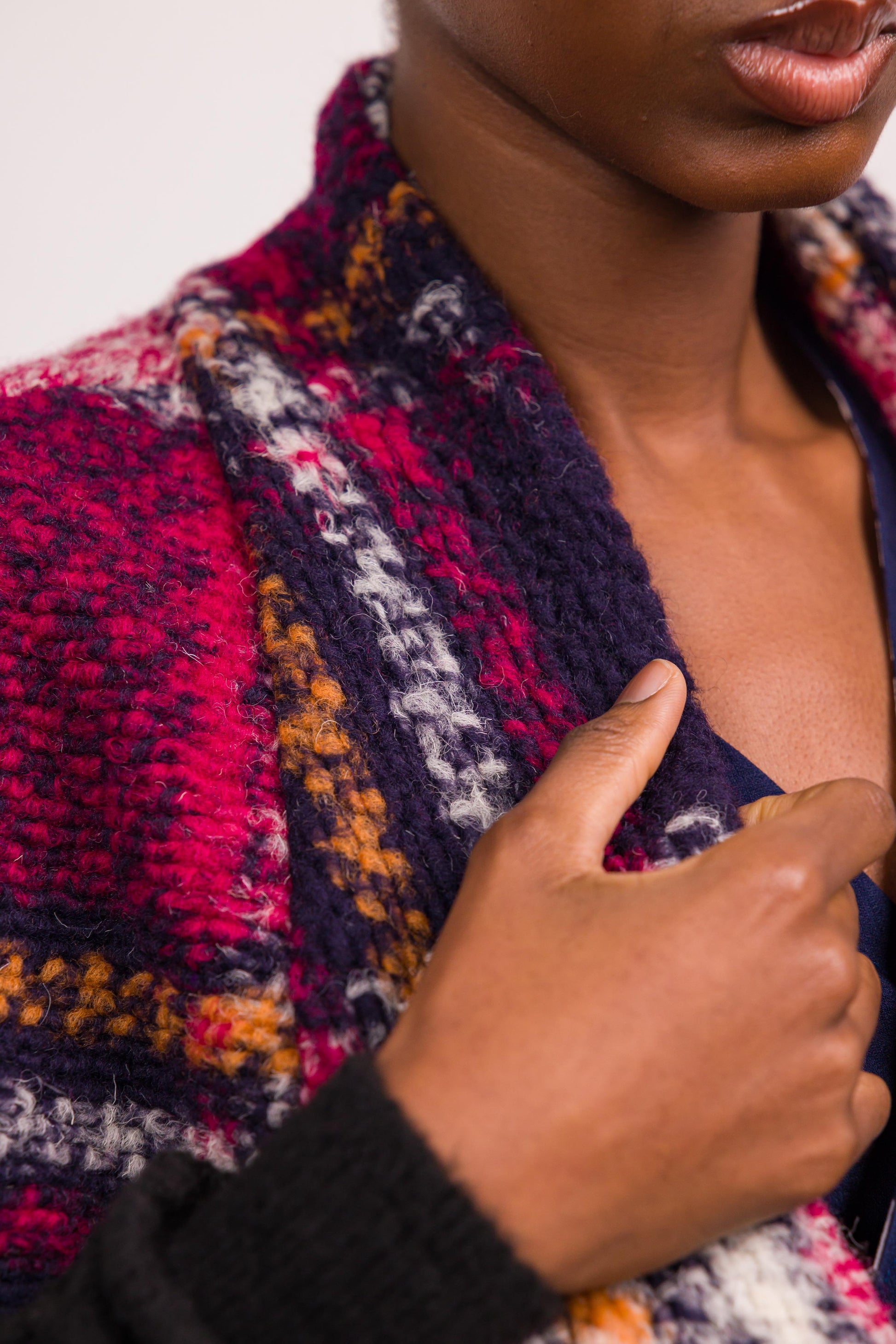 Réalisée dans une matière texturée à motifs écossais, elle apporte immédiatement du caractère à une tenue. Son col souple esprit tailleur encadre la silhouette avec justesse, tandis que les jeux de couleurs donnent profondeur et singularité à la pièce.