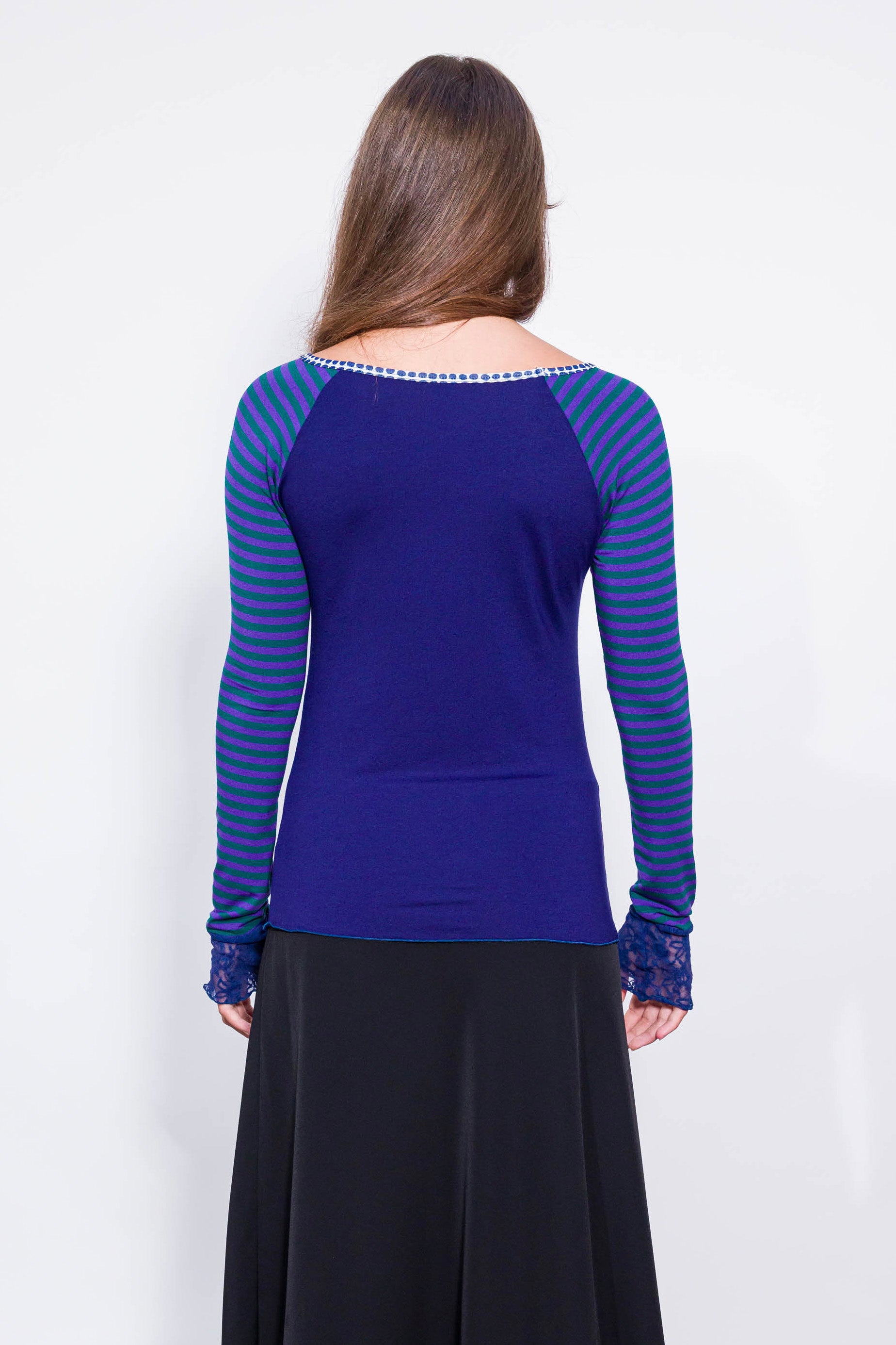 Classique chez Marieve, le tee shirt raglan se porte sur un jean pour un look créateur. Sous une tunique ou sur une jupe il apporte un peu de fantaisie et beaucoup de confort. Ses manches extra longues dépasseront de vos pulls et manteaux pour laisser apparaitre des motifs qui donneront de la couleur à vos tenues ! Ici un mix de violet et de dentelle.