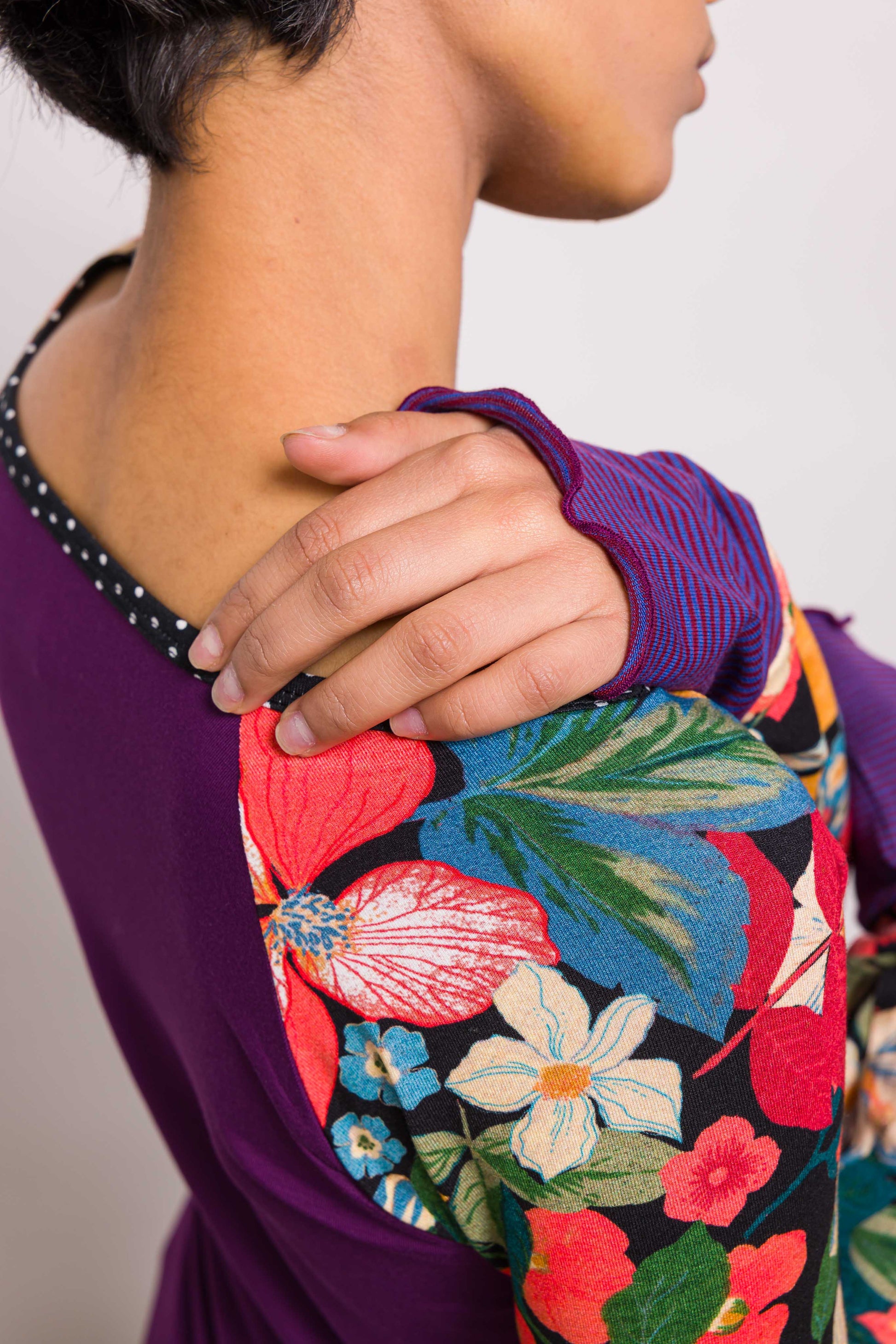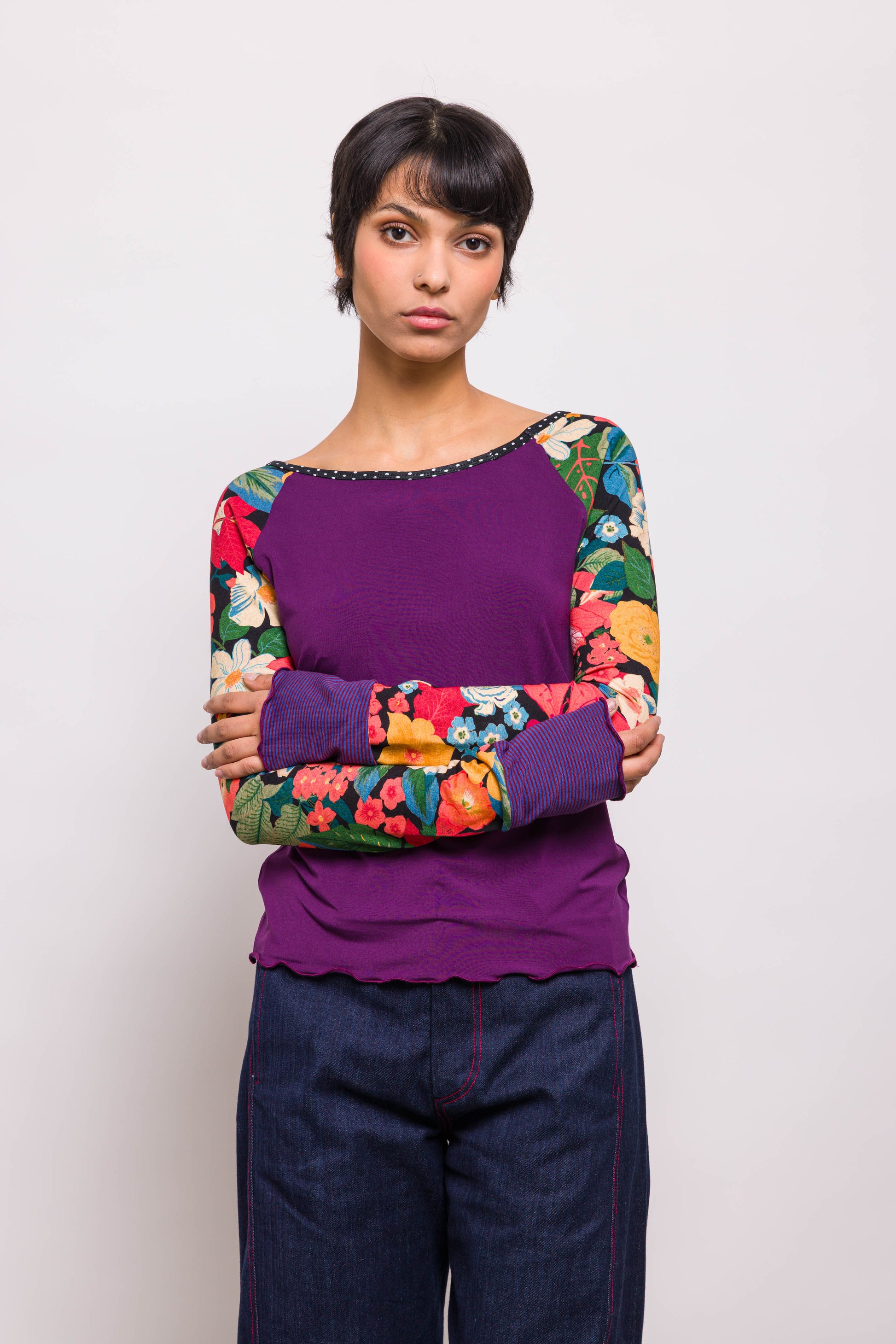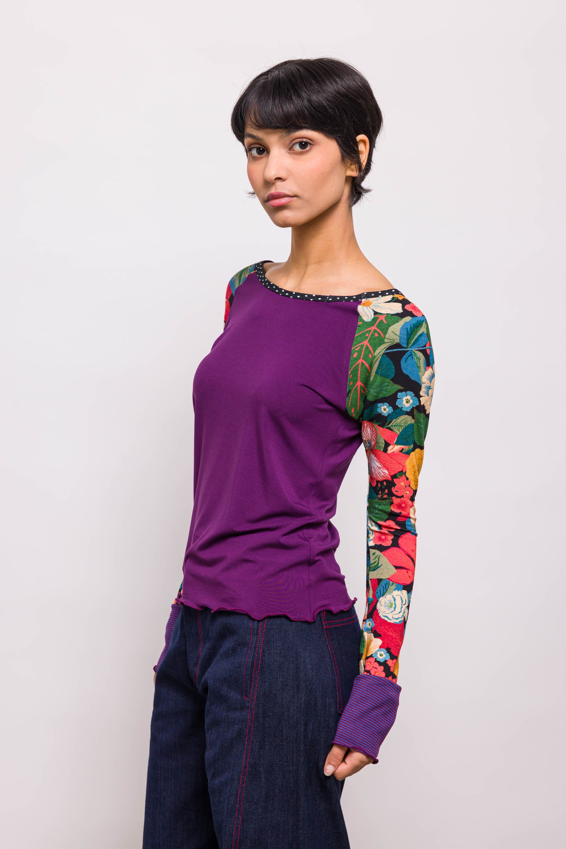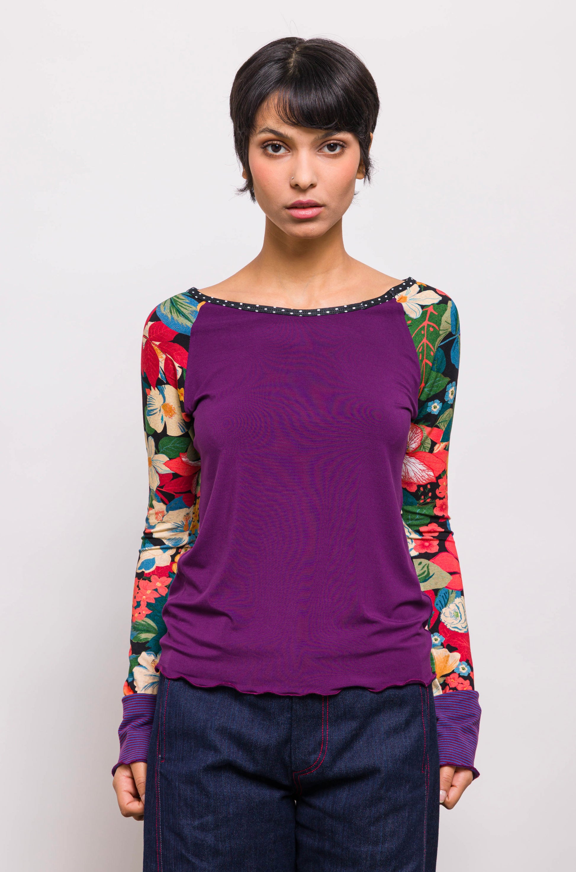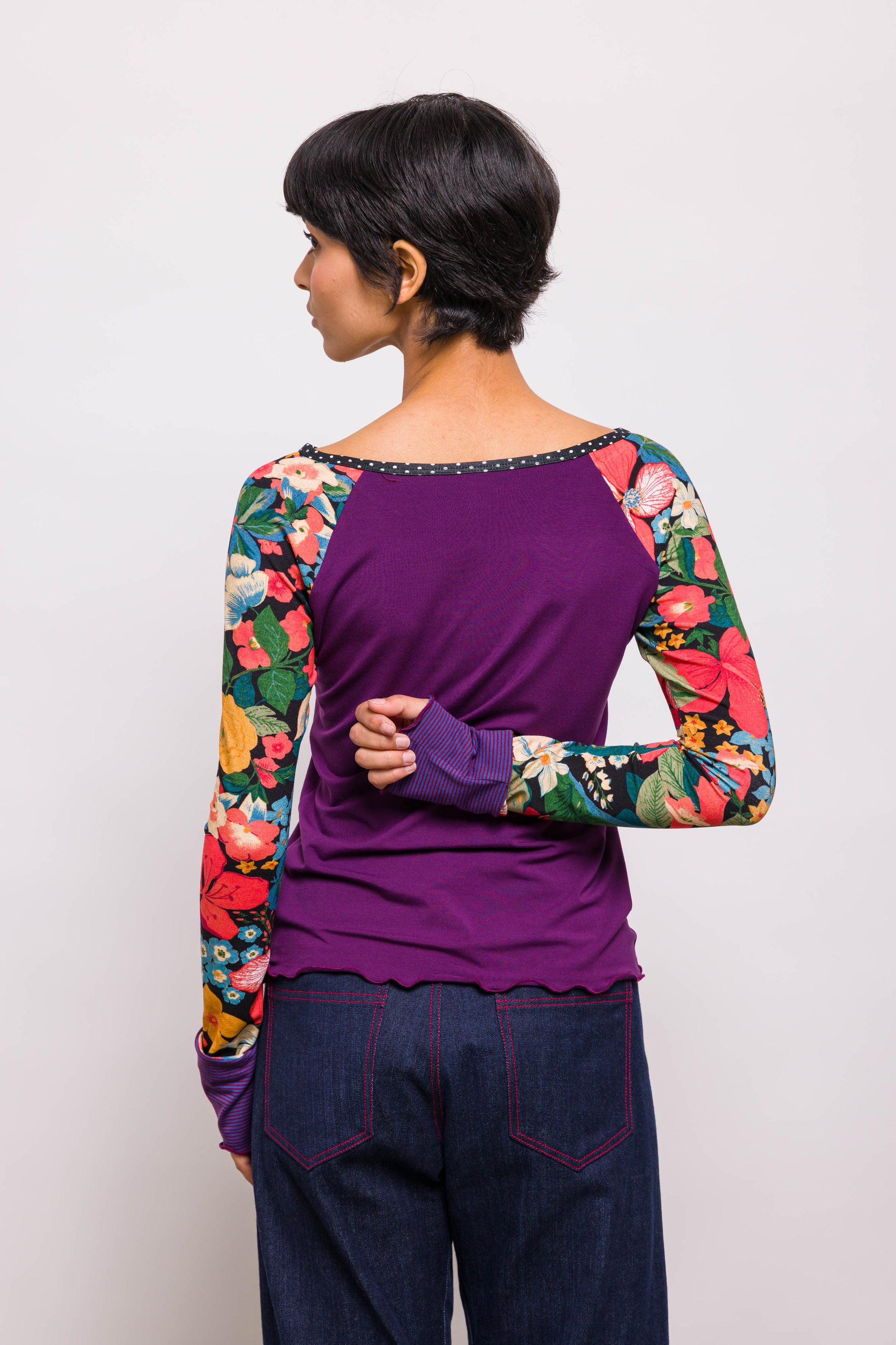 Classique chez Marieve, le tee shirt raglan se porte sur un jean pour un look créateur. Sous une tunique ou sur une jupe il apporte un peu de fantaisie et beaucoup de confort. Ses manches extra longues dépasseront de vos pulls et manteaux pour laisser apparaitre des motifs qui donneront de la couleur à vos tenues ! Ici un mix de violet et de motifs fleuris.