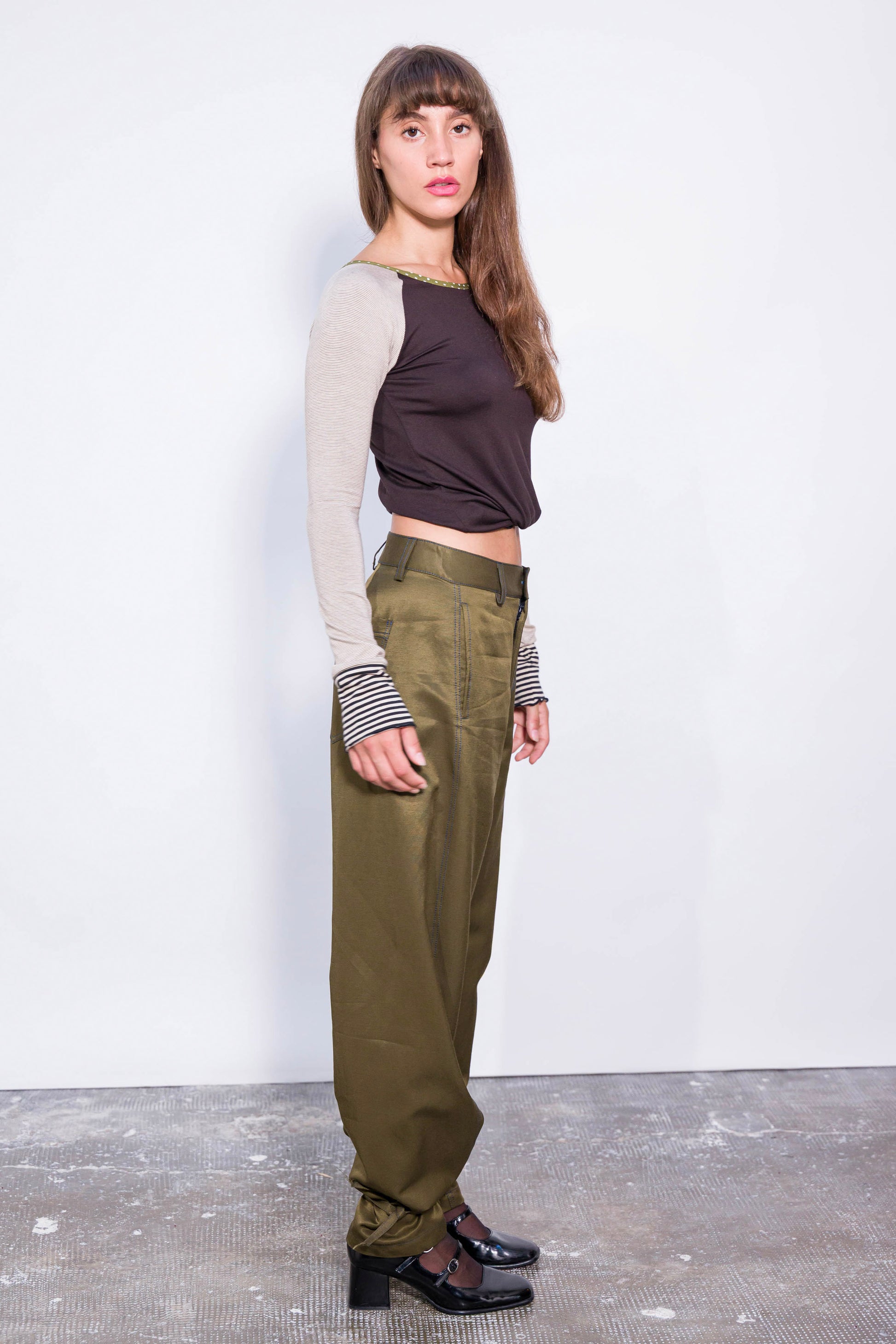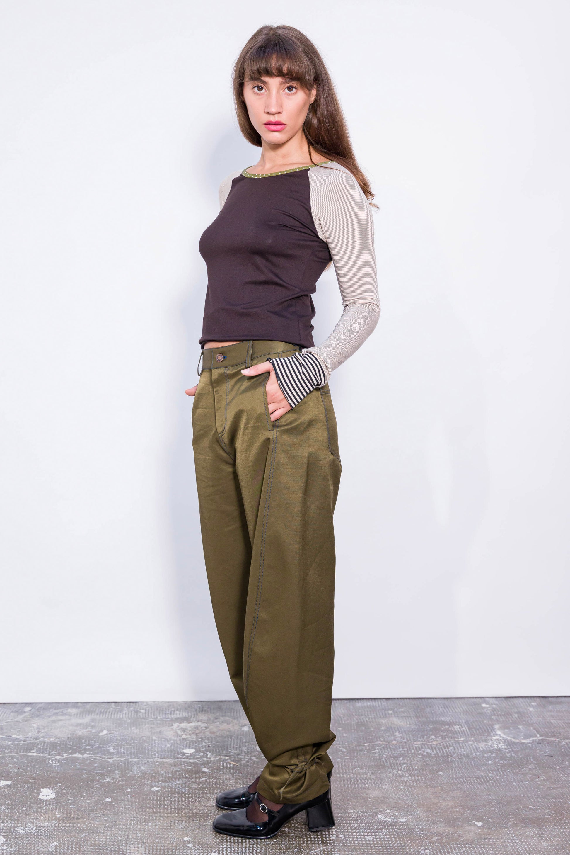Jean Nelson en toile sergé kaki fabriquée en Italie. Coupe barrel avec une couture qui revient sur la jambe. La taille tombe sous le nombril mais il peut être porté taille basse en prenant une taille au-dessus de votre taille habituelle.. Le Nelson vient agrandir notre proposition de jeans avec sa coupe parfaite. A porter tout le temps et avec tout…les détails de surpiqures bleu marine et sa coupe barrel en font une pièce actuelle.