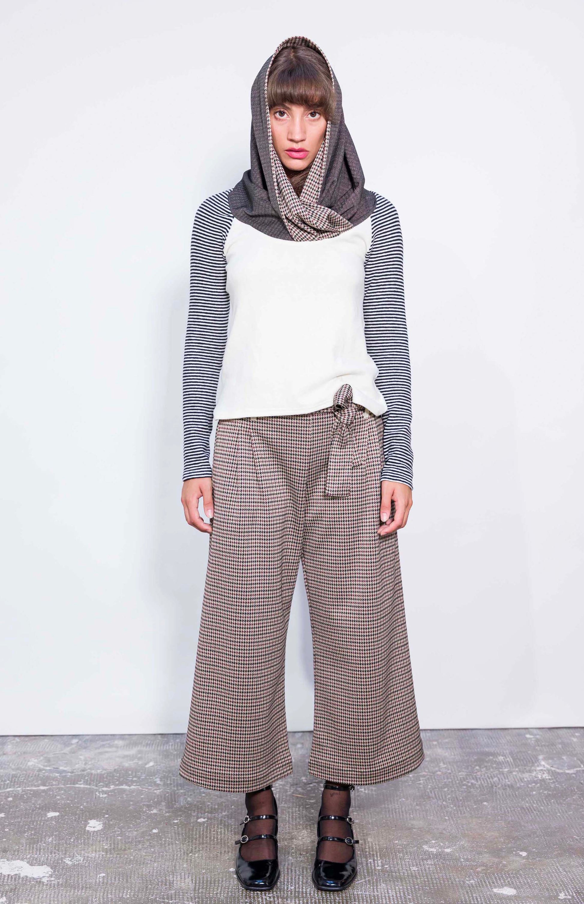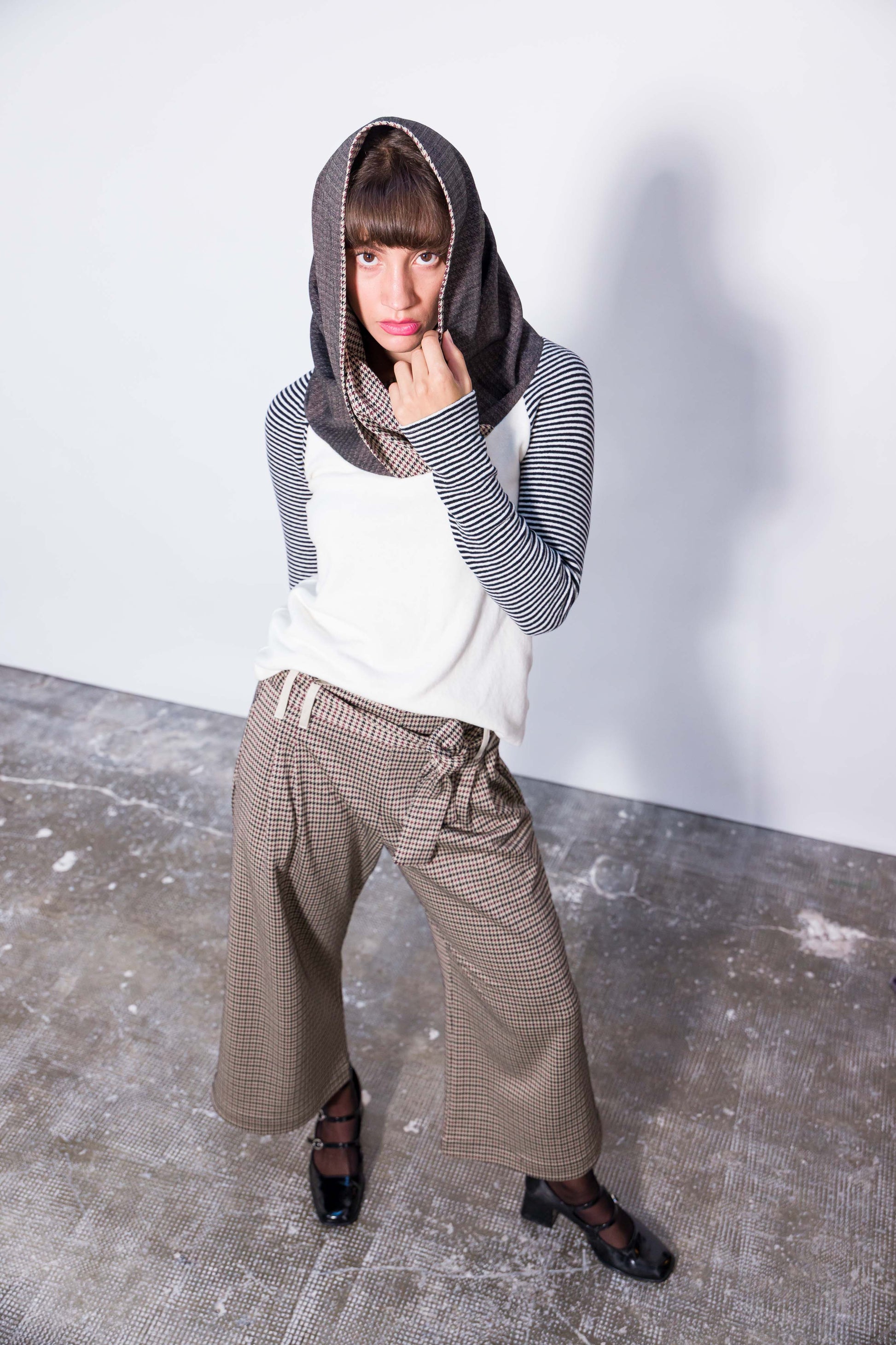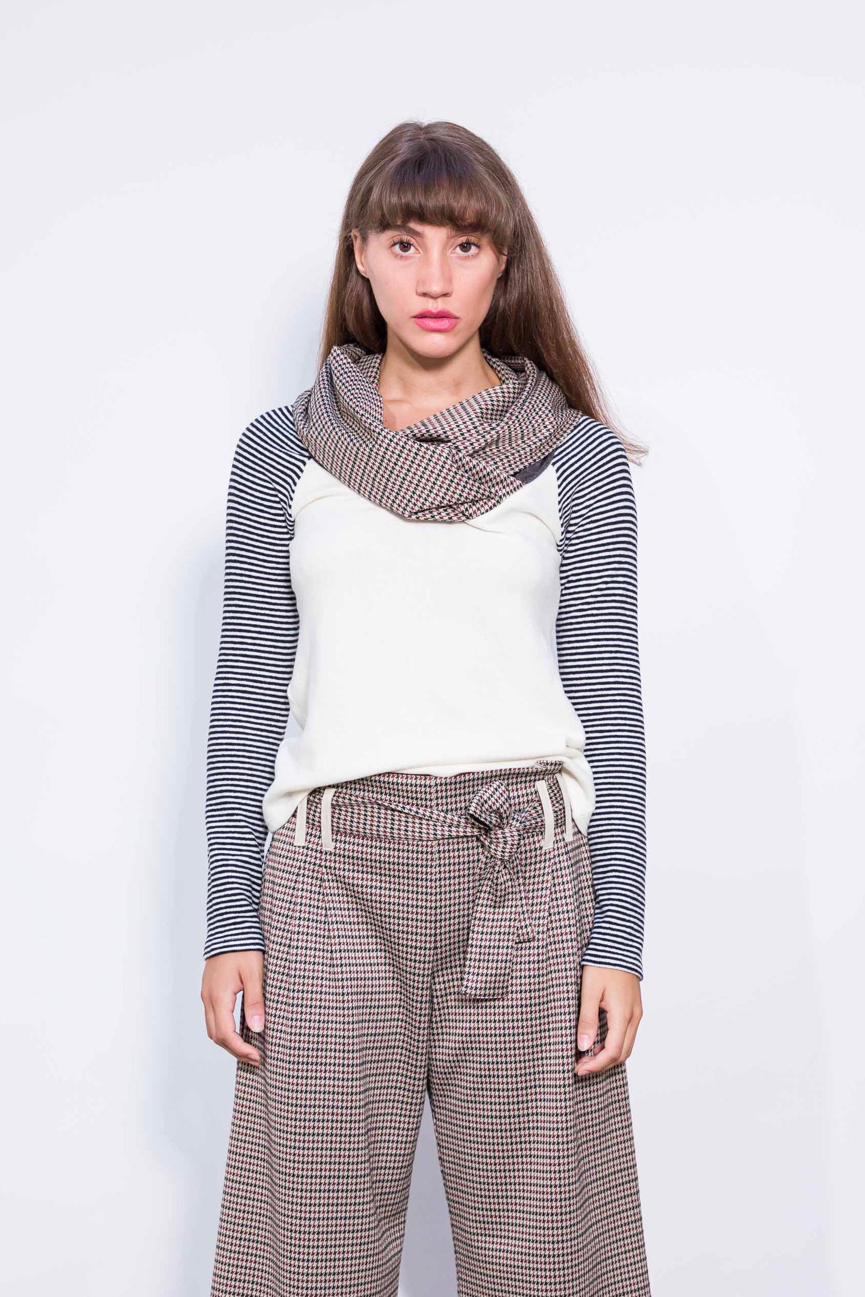 Le pull col fait peau neuve cette saison avec une version toute en douceur. Sa maille douce permet de le porter à même la peau. Son maxi col peut se transformer en capuche pour affronter le froid de cet hiver. Le blanc lumineux contraste avec notre jacquard pied de poule assorti au pantalon Eva.