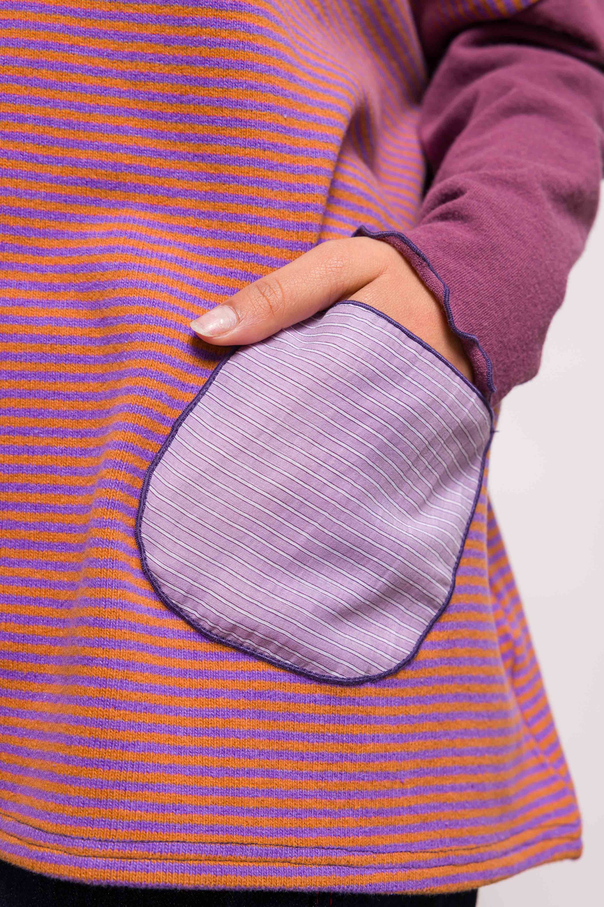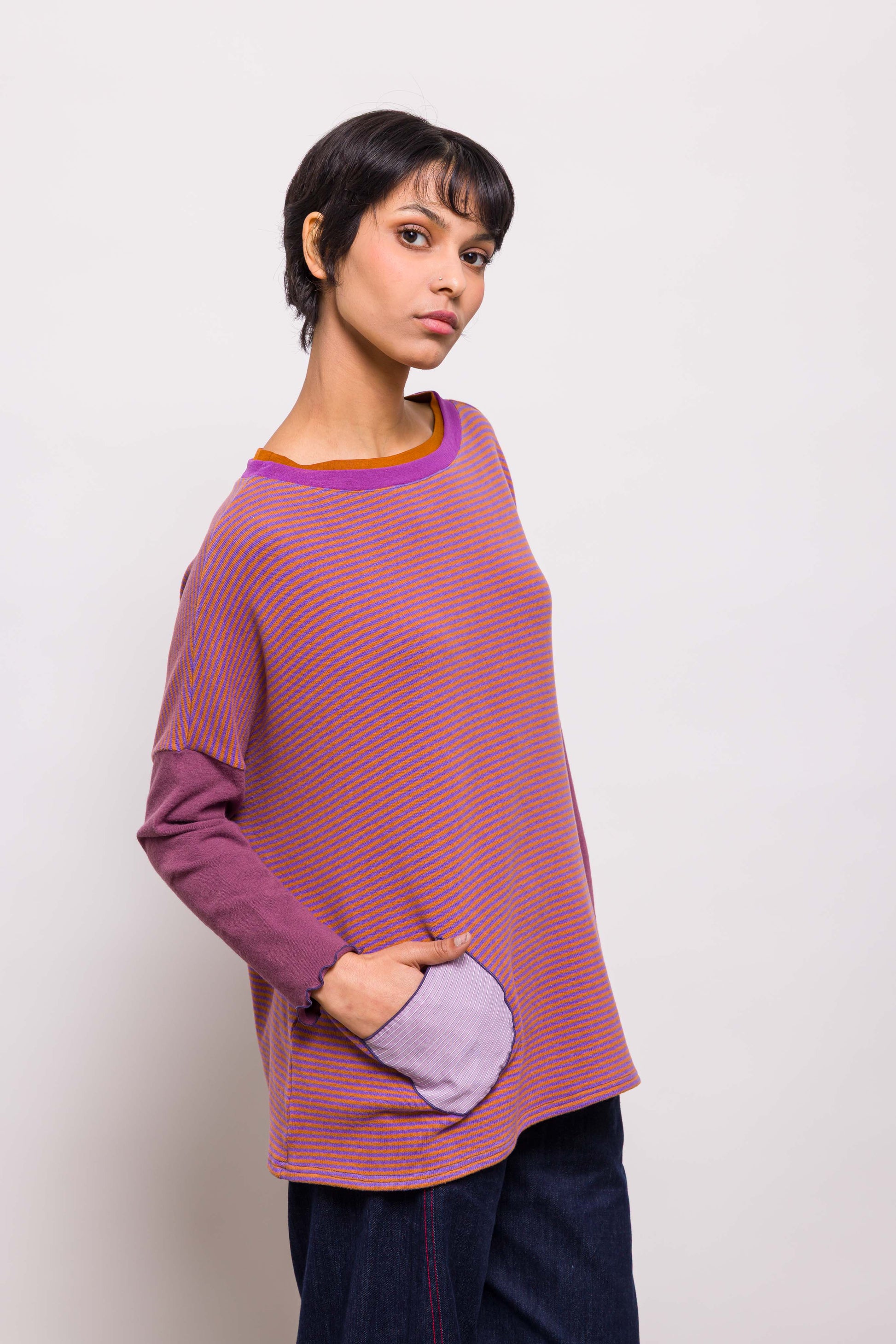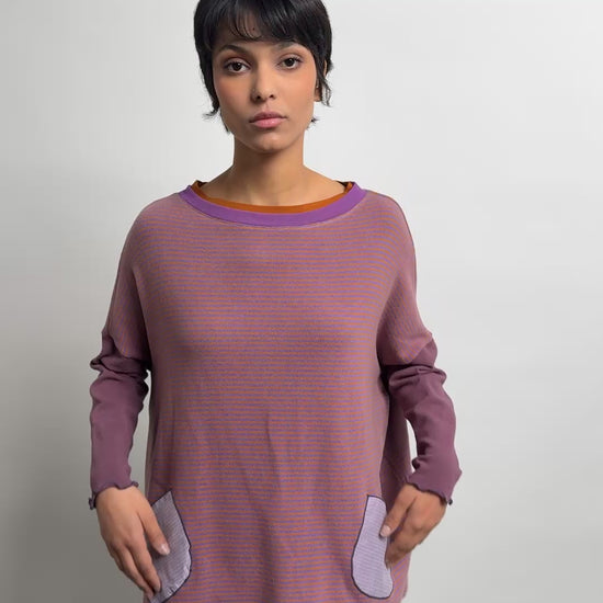 Intemporel de la marque, le pull poches associe une coupe loose et un mélange de matières. Ici en maille rayée violet et orange, les poches plaquées dans un coton rayé apportent une touche créateur. Les manches assorties donnent la touche Marieve. Facile à porter, il convient à toutes les tailles.