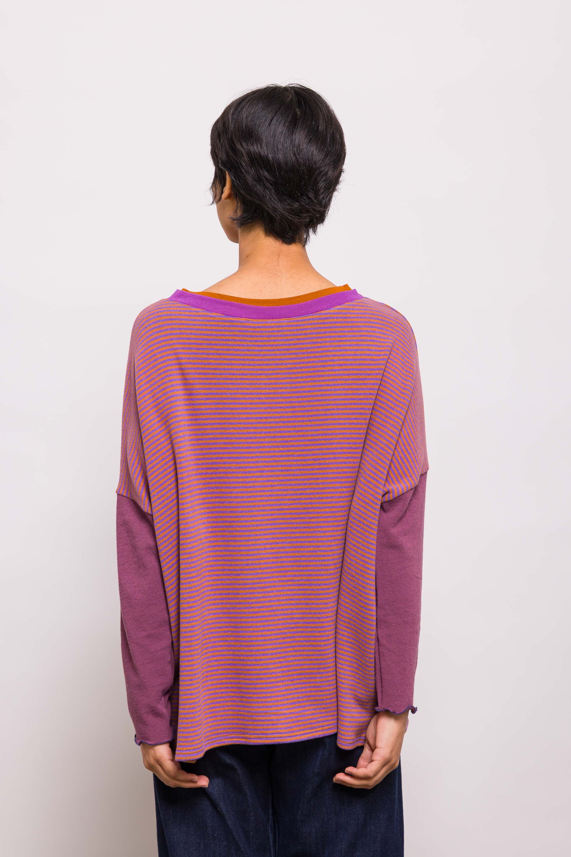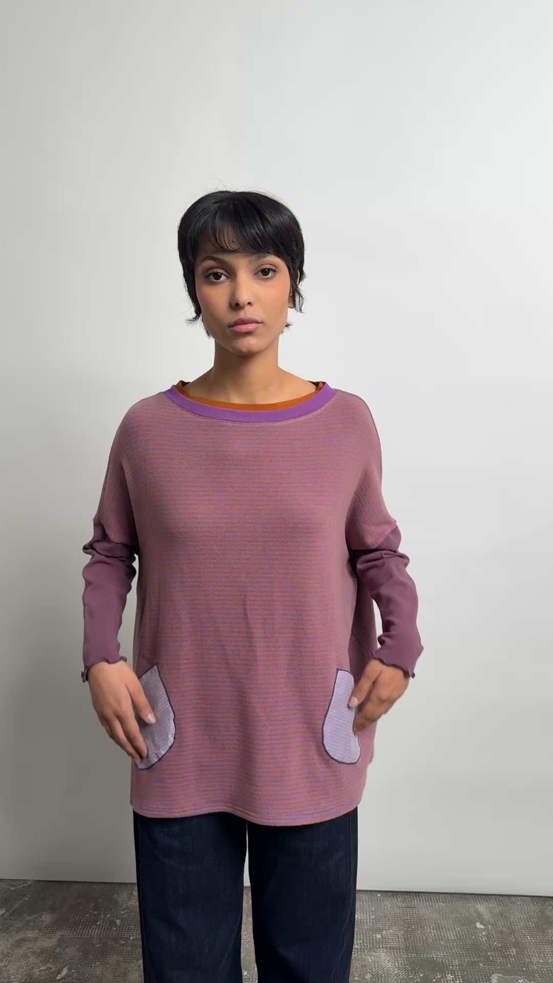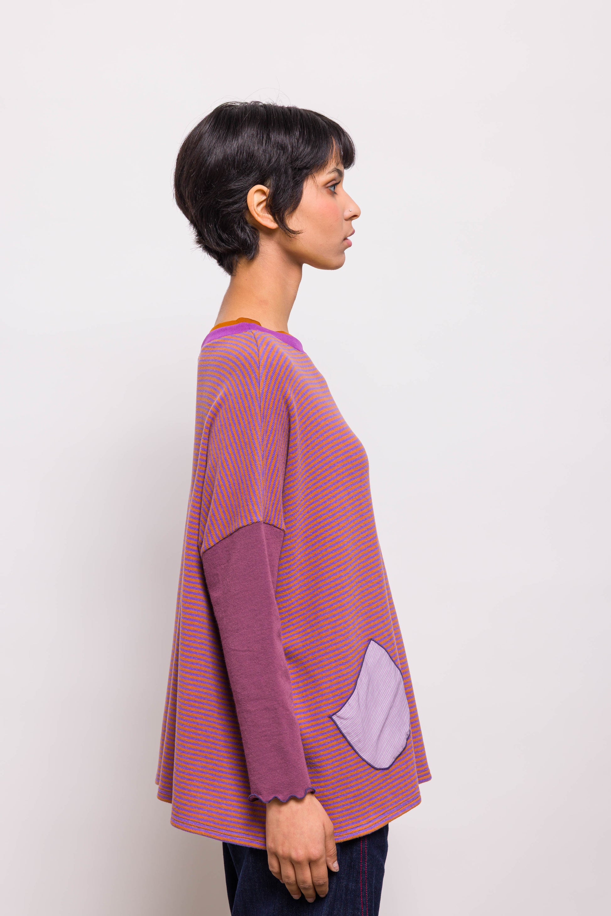 Intemporel de la marque, le pull poches associe une coupe loose et un mélange de matières. Ici en maille rayée violet et orange, les poches plaquées dans un coton rayé apportent une touche créateur. Les manches assorties donnent la touche Marieve. Facile à porter, il convient à toutes les tailles.