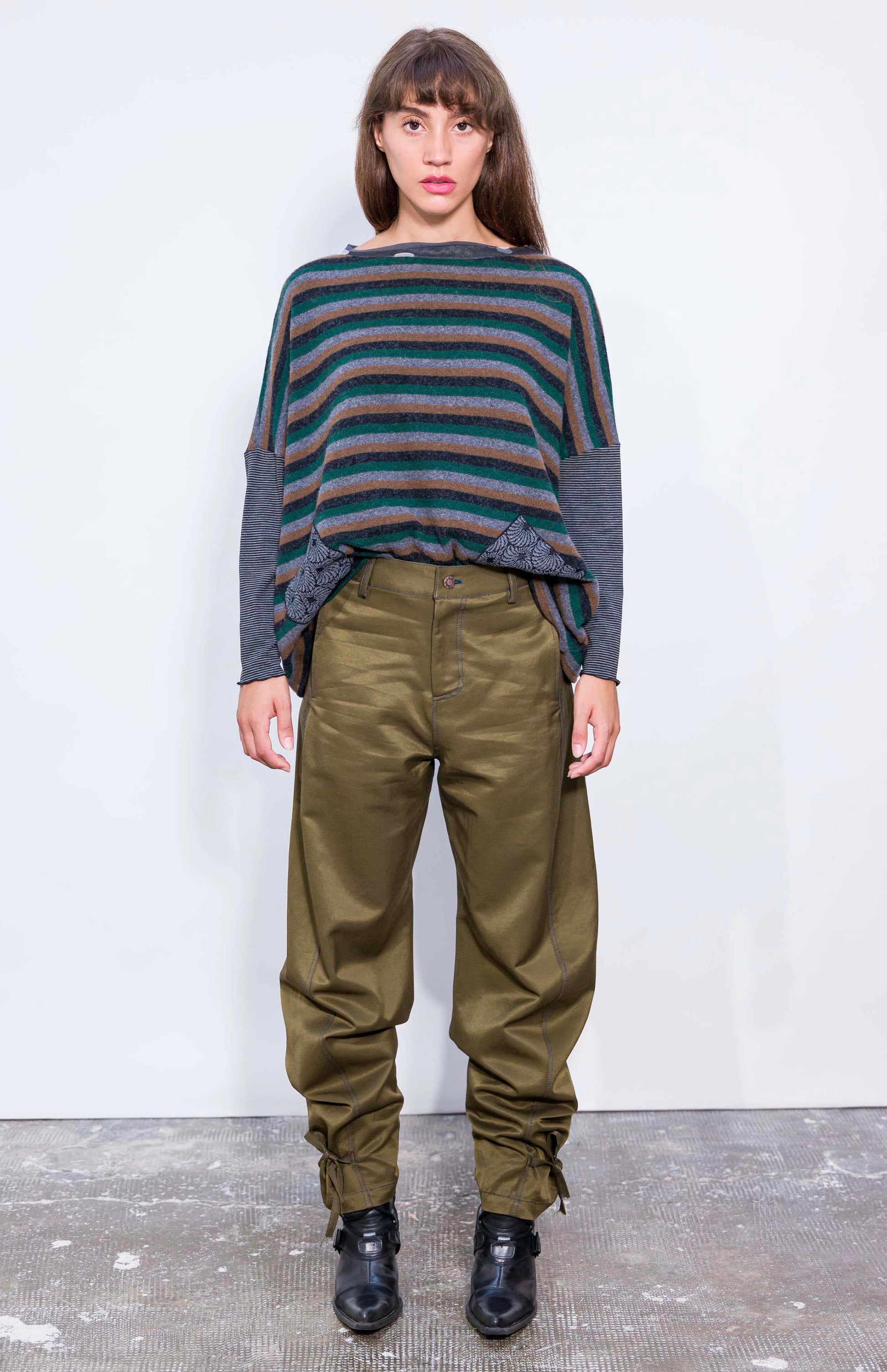 Intemporel de la marque, le pull poches associe une coupe loose et un mélange de matières. Ici en maille de laine rayée, les poches plaquées dans un jacquard à motif japonais apportent une touche créateur. Les manches rayées noires et grises ainsi que son double col en résille donnent la touche Marieve. Facile à porter, il convient à toutes les tailles.