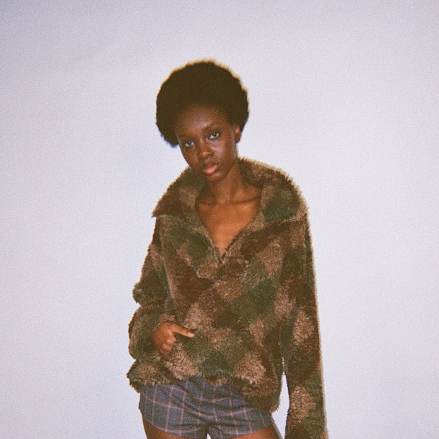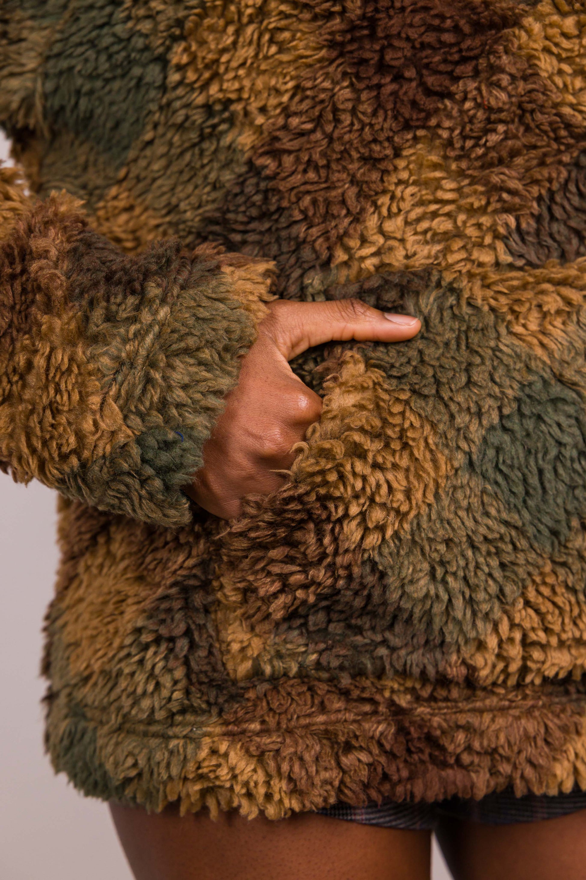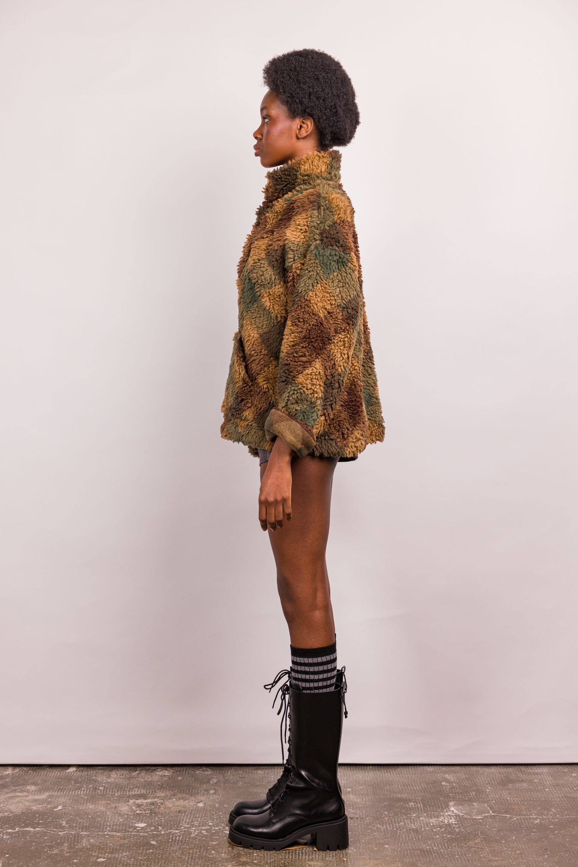 Réalisé dans une matière effet moumoute aux nuances naturelles de kaki, brun et ocre, il se distingue par sa texture généreuse et son toucher doux. Son col montant apporte protection et caractère, tandis que la fermeture par boutons pression permet de moduler le porté, ouvert ou fermé selon l’allure souhaitée.
