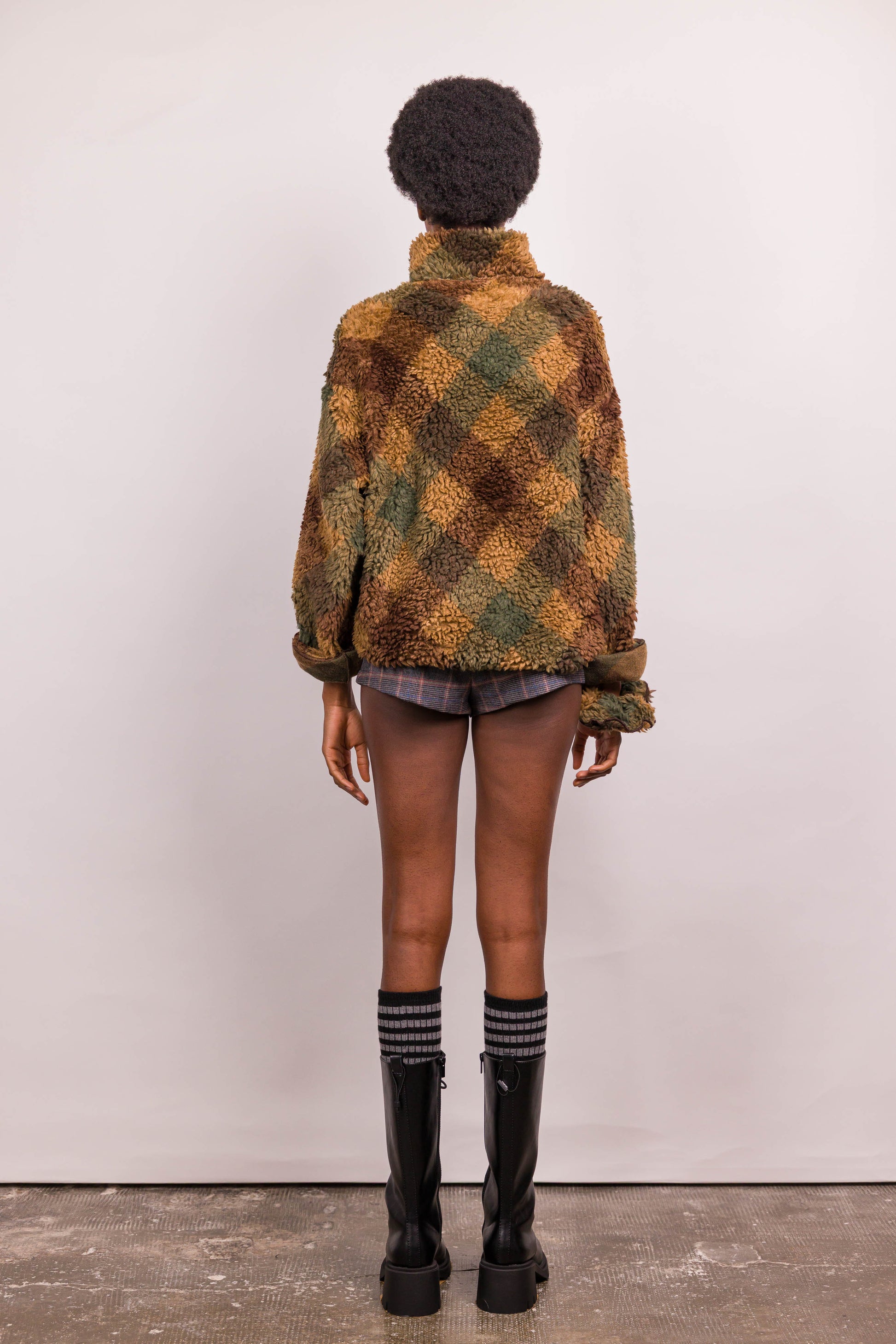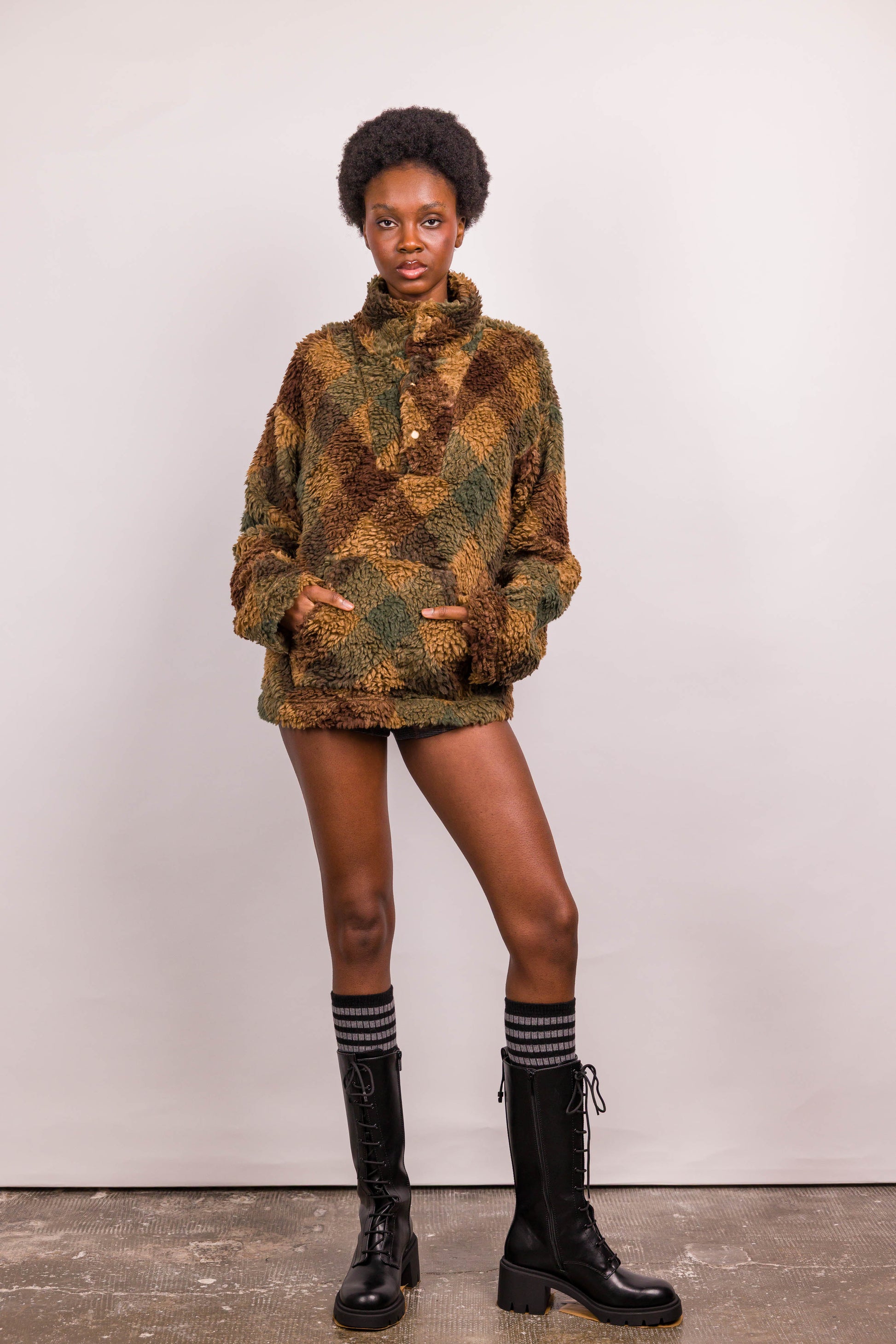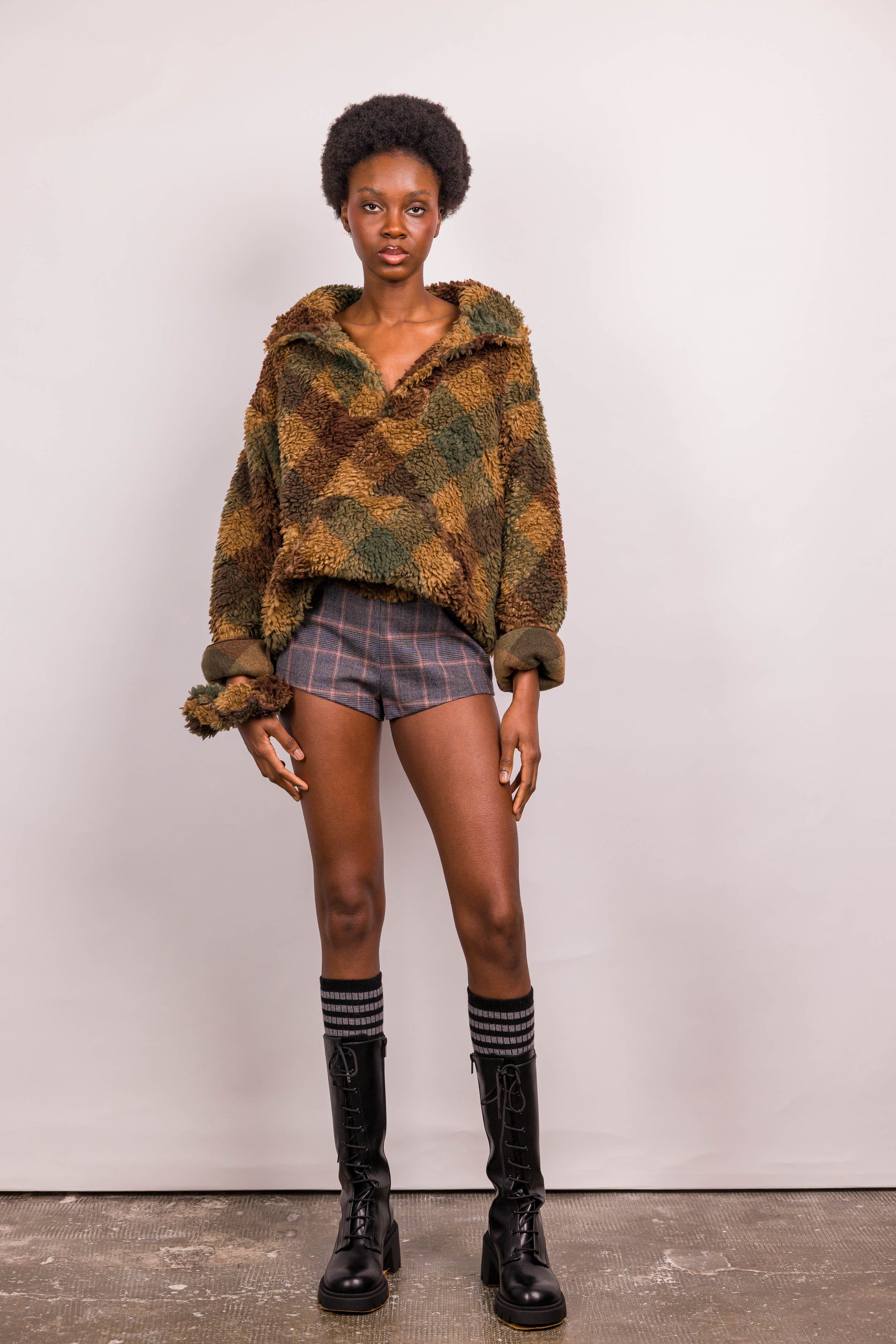Réalisé dans une matière effet moumoute aux nuances naturelles de kaki, brun et ocre, il se distingue par sa texture généreuse et son toucher doux. Son col montant apporte protection et caractère, tandis que la fermeture par boutons pression permet de moduler le porté, ouvert ou fermé selon l’allure souhaitée.
