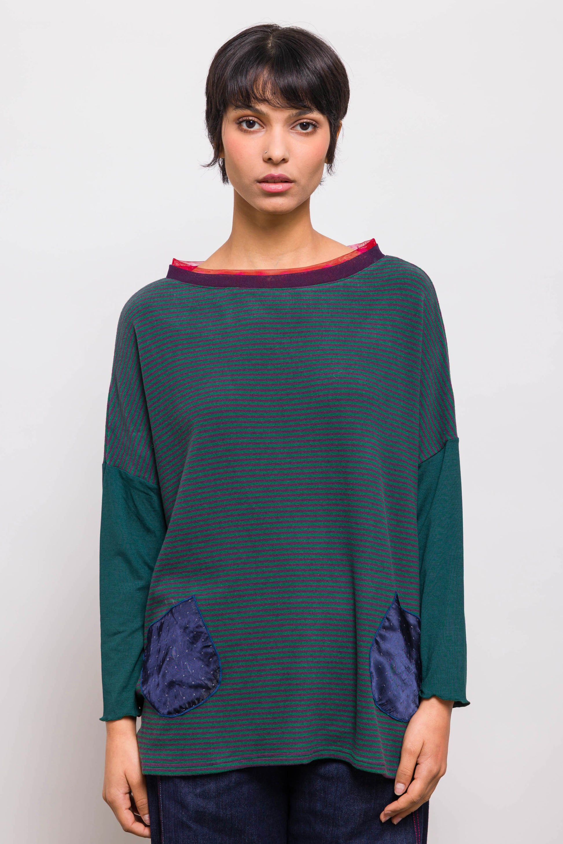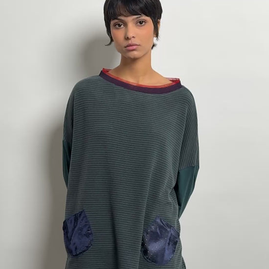 Intemporel de la marque, le pull poches associe une coupe loose et un mélange de matières. Ici en maille de laine rayée, les poches plaquées à pois apportent une touche créateur. Son double col en résille donnent la touche Marieve. Facile à porter, il convient à toutes les tailles.
