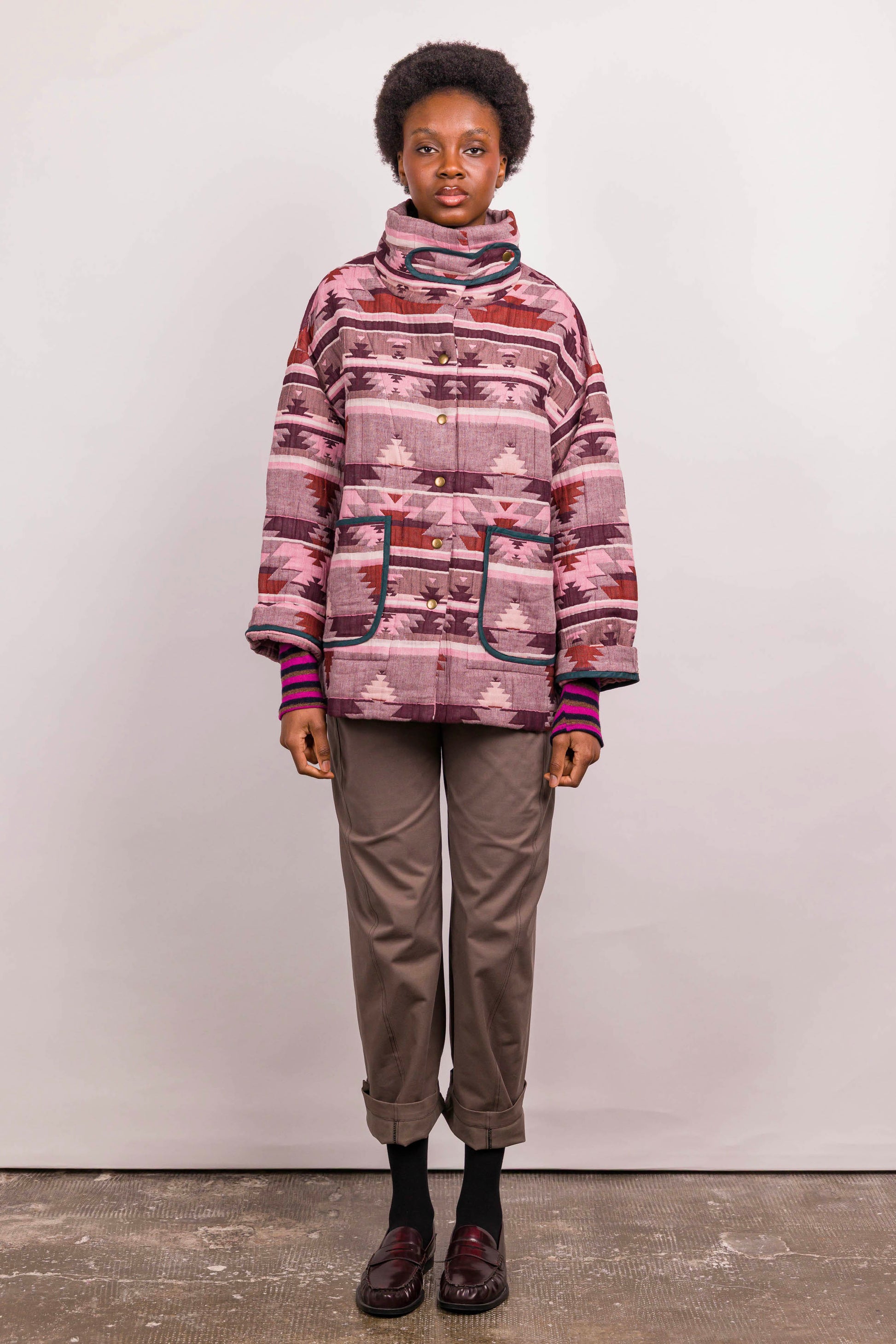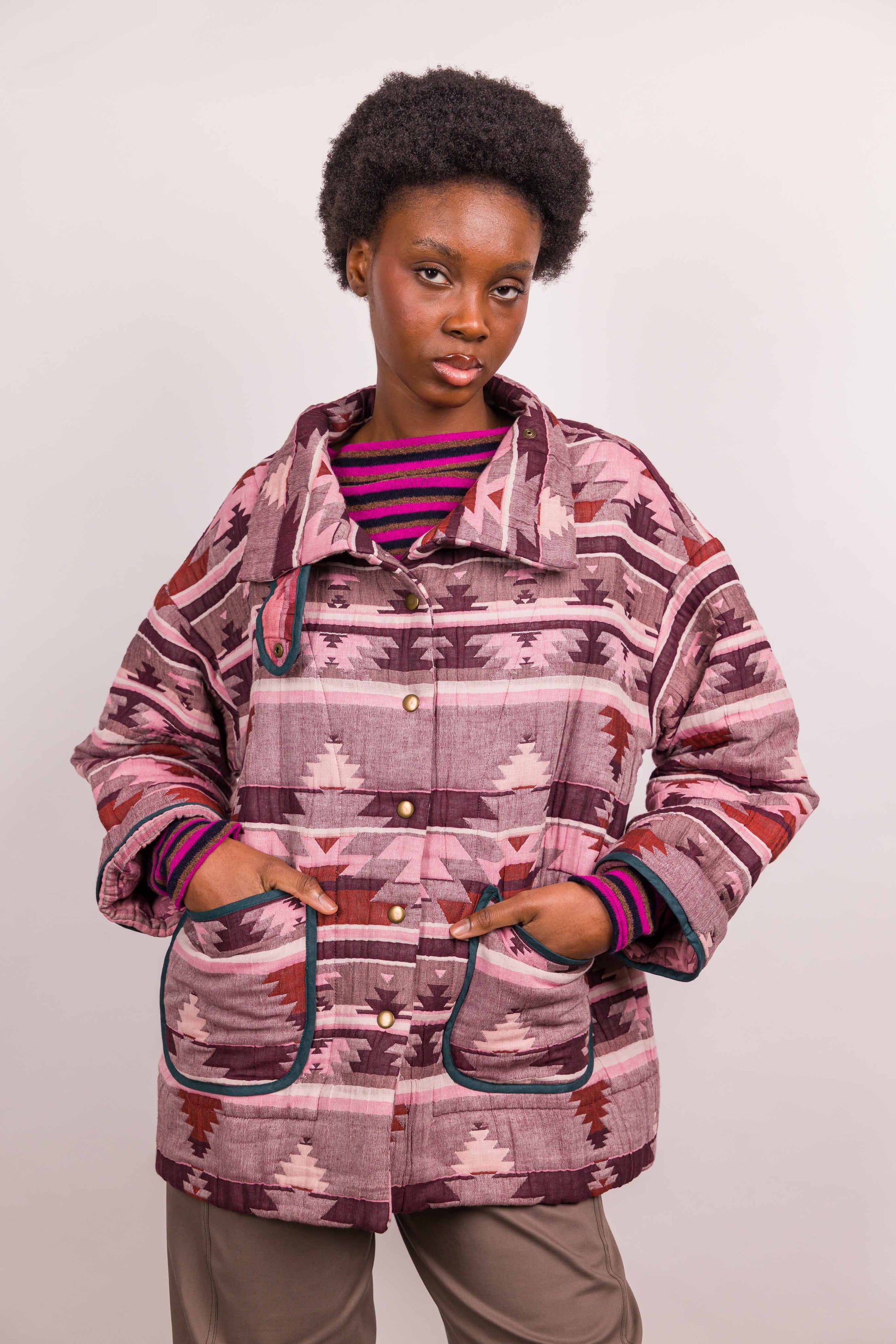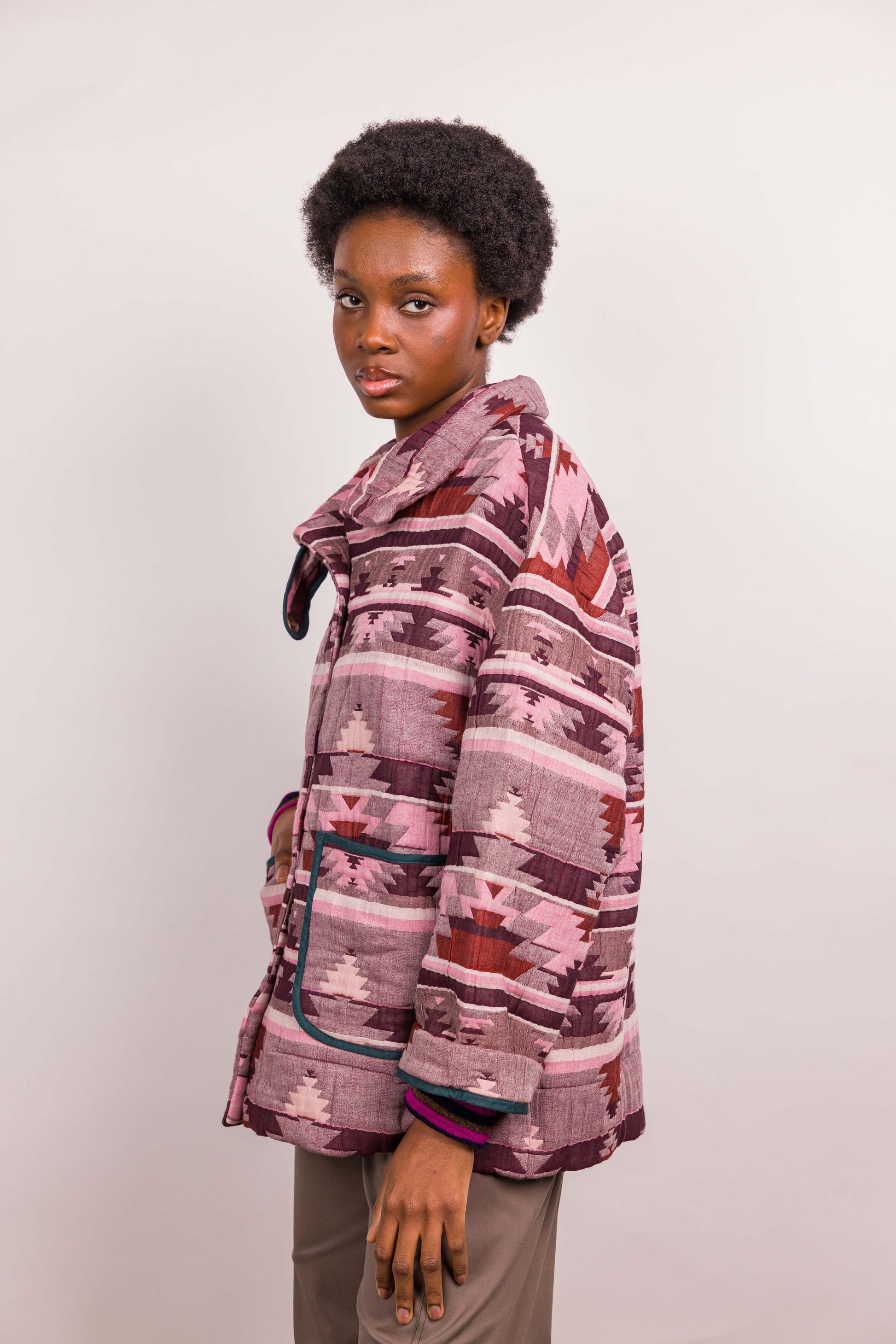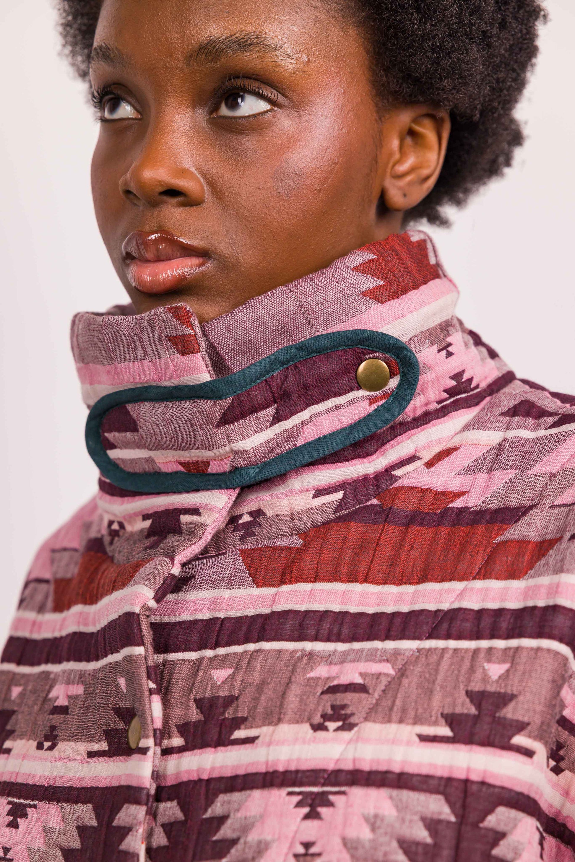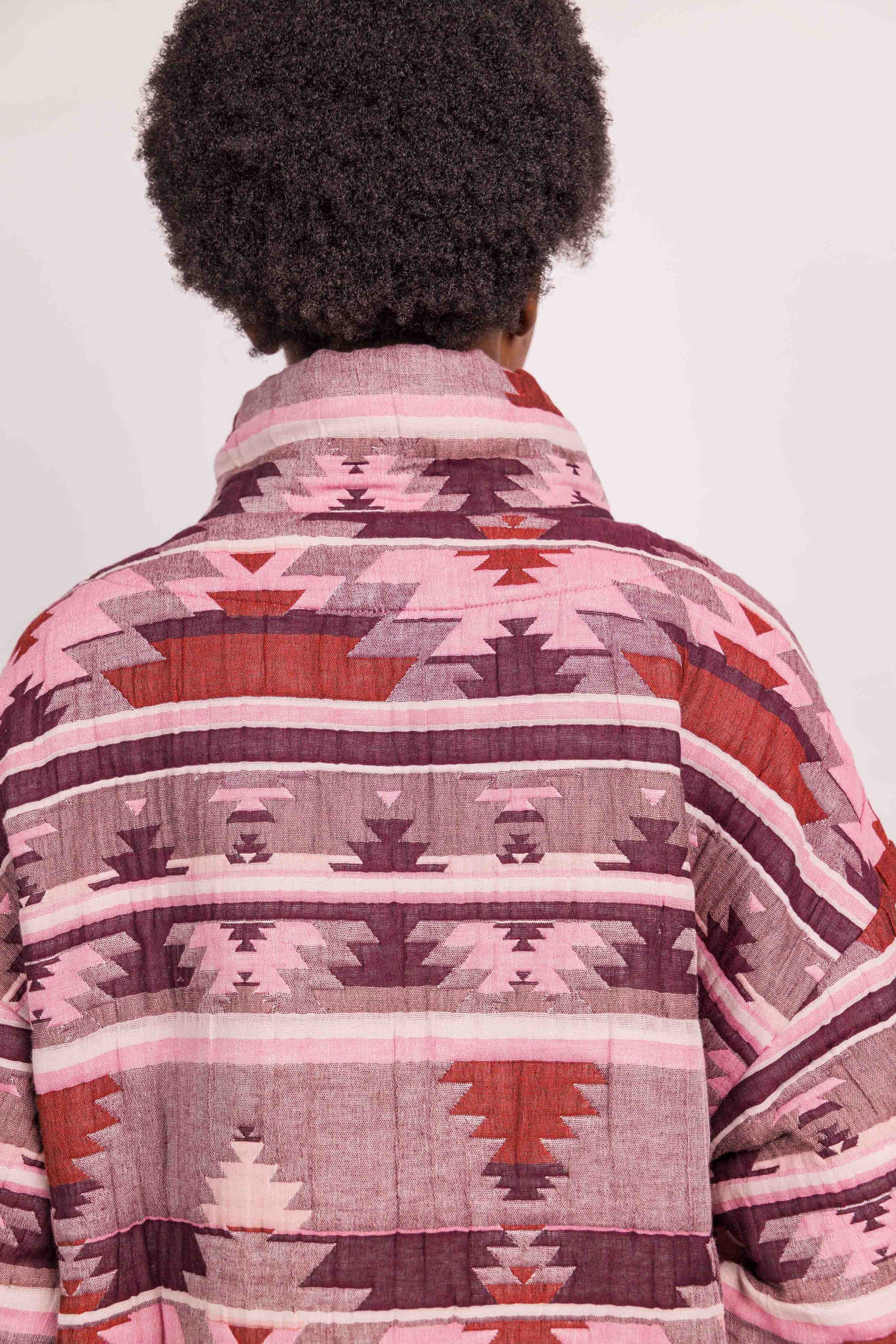 Réalisée dans un tissu matelassé à motif graphique esprit ethnique, elle se distingue par son col enveloppant modulable, à porter relevé ou ouvert selon l’allure souhaitée. Les poches plaquées soulignées d’un biais contrasté apportent rythme et caractère à la pièce, tandis que la fermeture par boutons pression renforce son esprit fonctionnel.