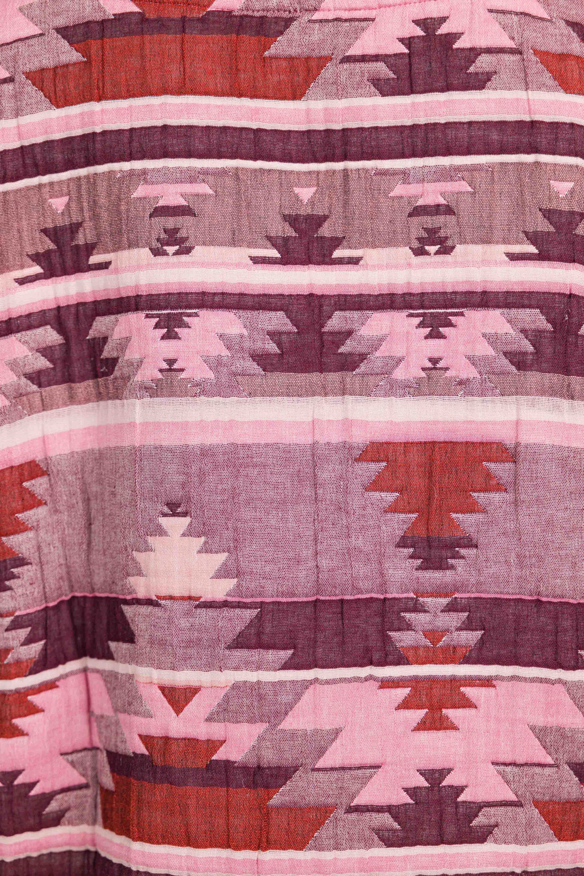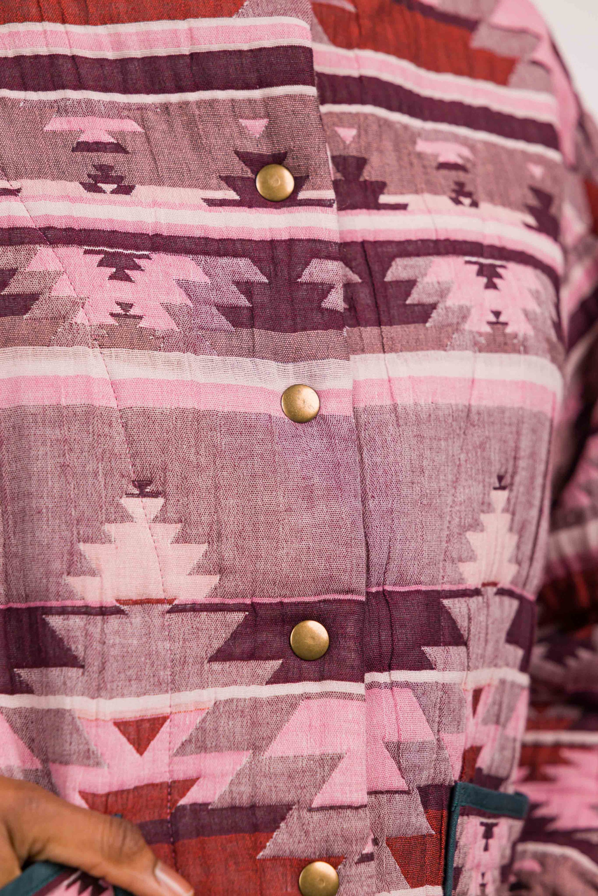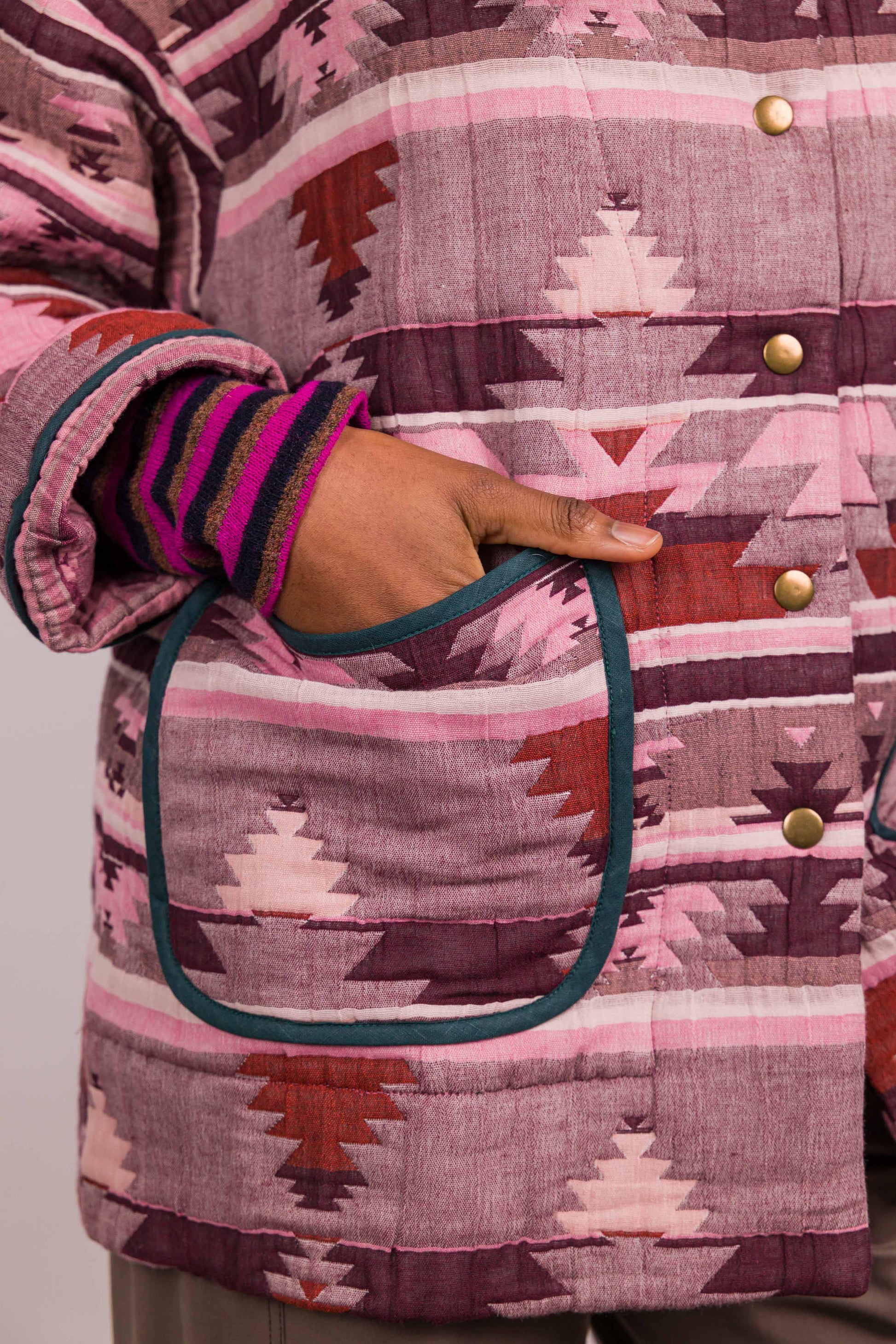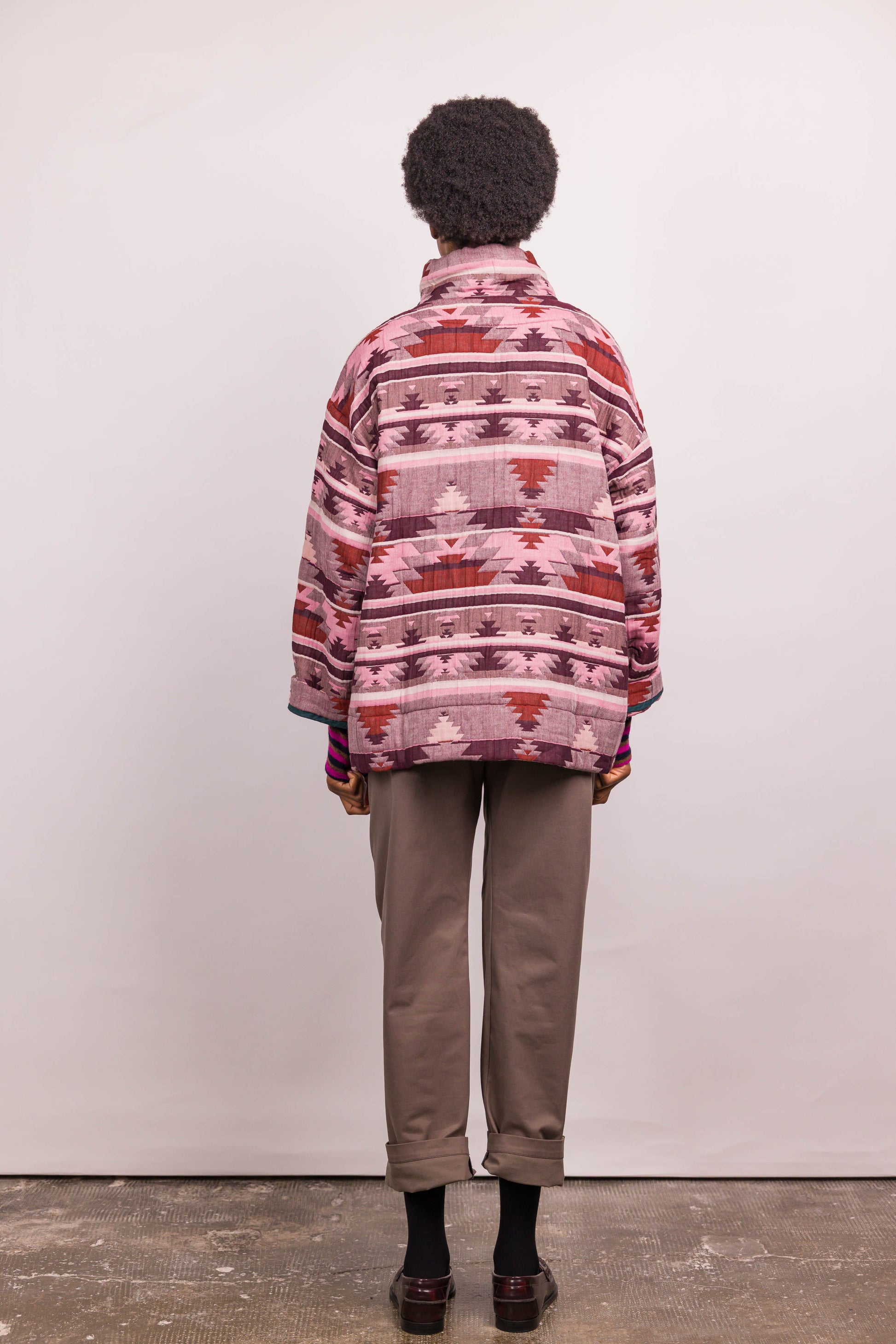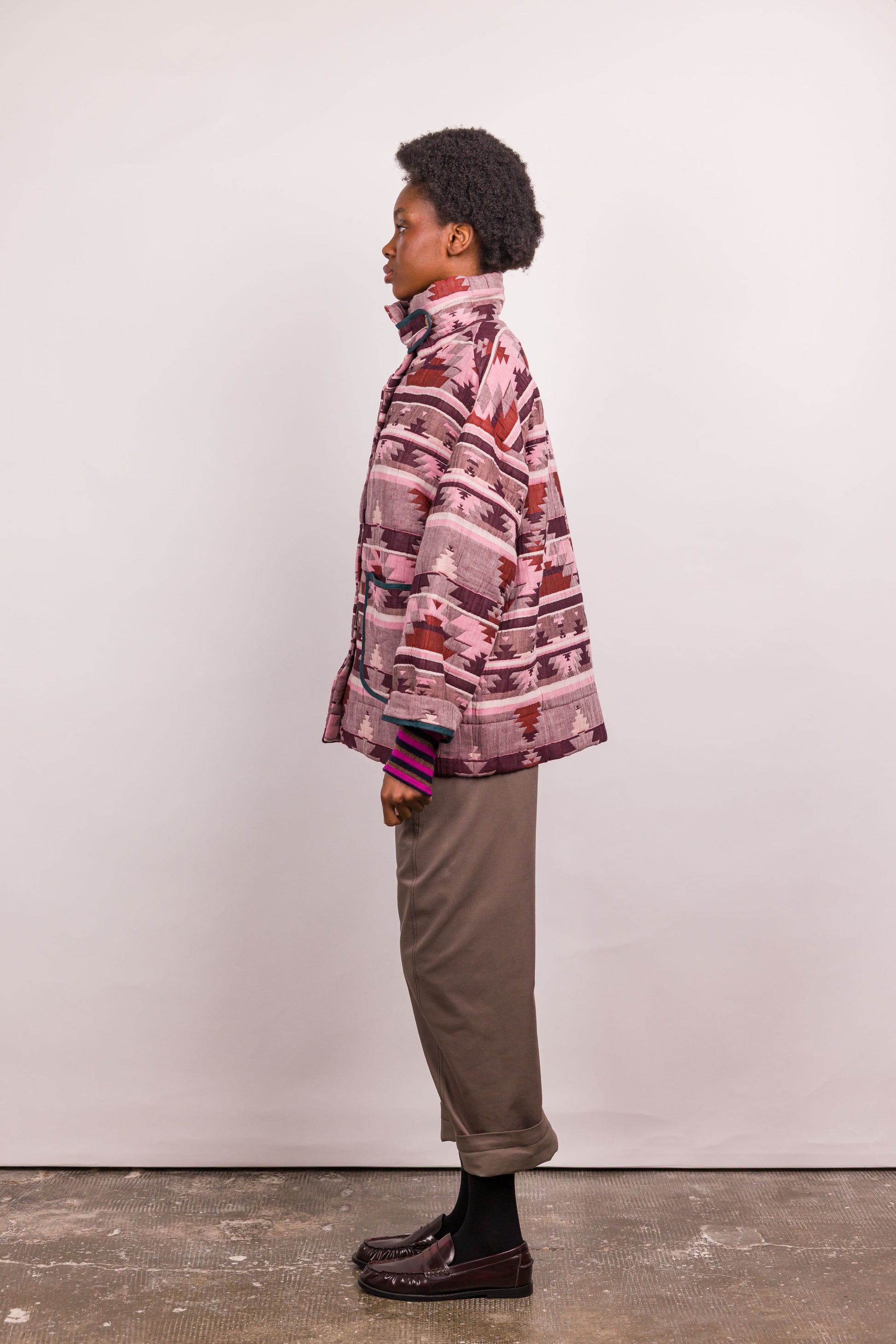 Réalisée dans un tissu matelassé à motif graphique esprit ethnique, elle se distingue par son col enveloppant modulable, à porter relevé ou ouvert selon l’allure souhaitée. Les poches plaquées soulignées d’un biais contrasté apportent rythme et caractère à la pièce, tandis que la fermeture par boutons pression renforce son esprit fonctionnel.