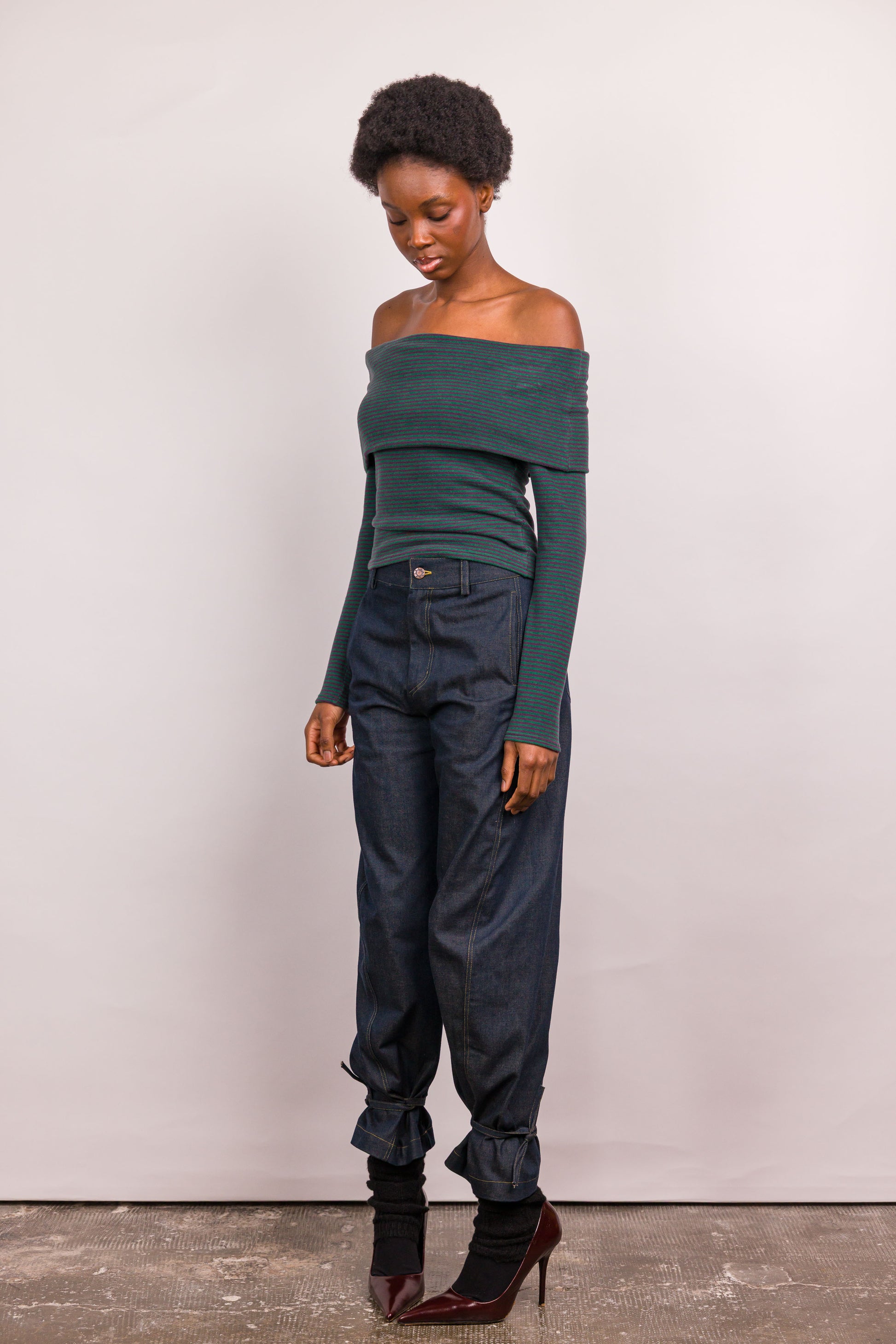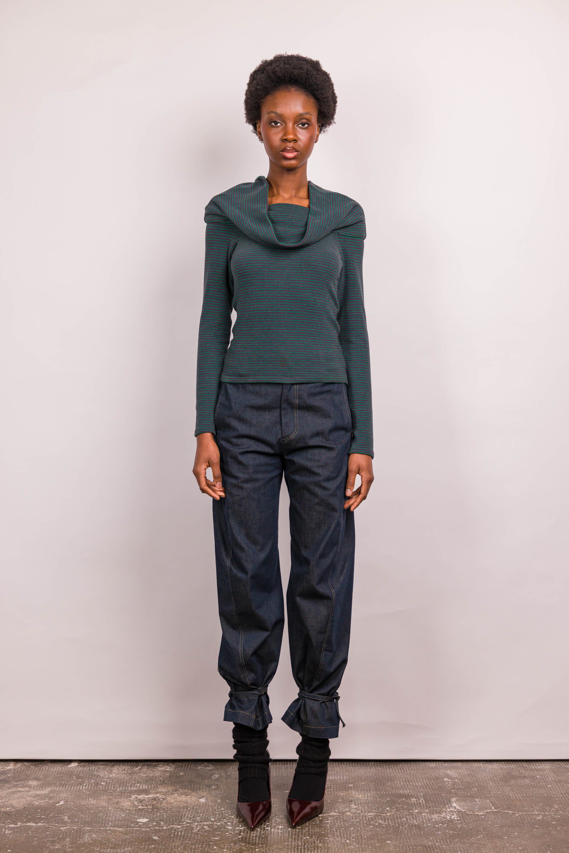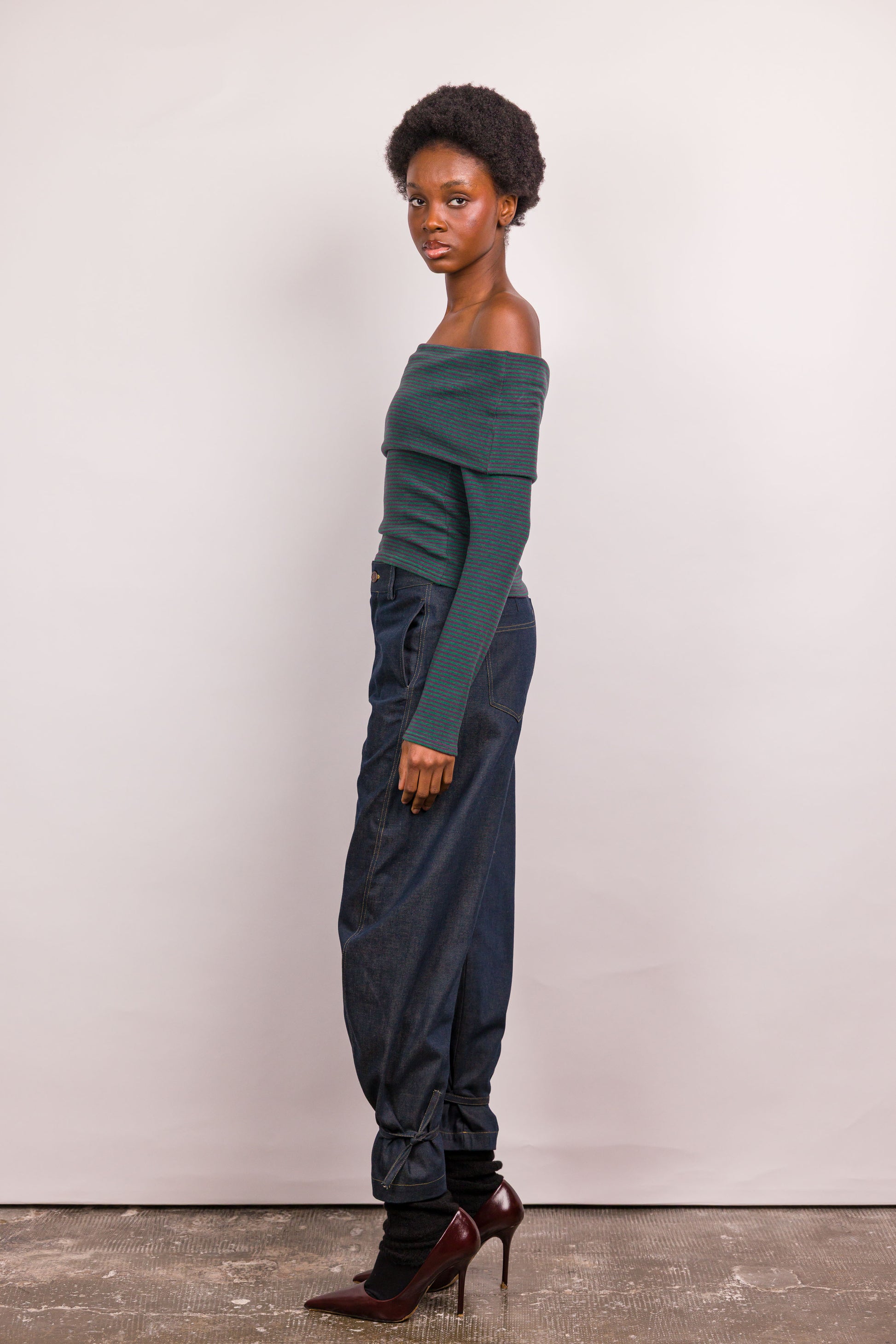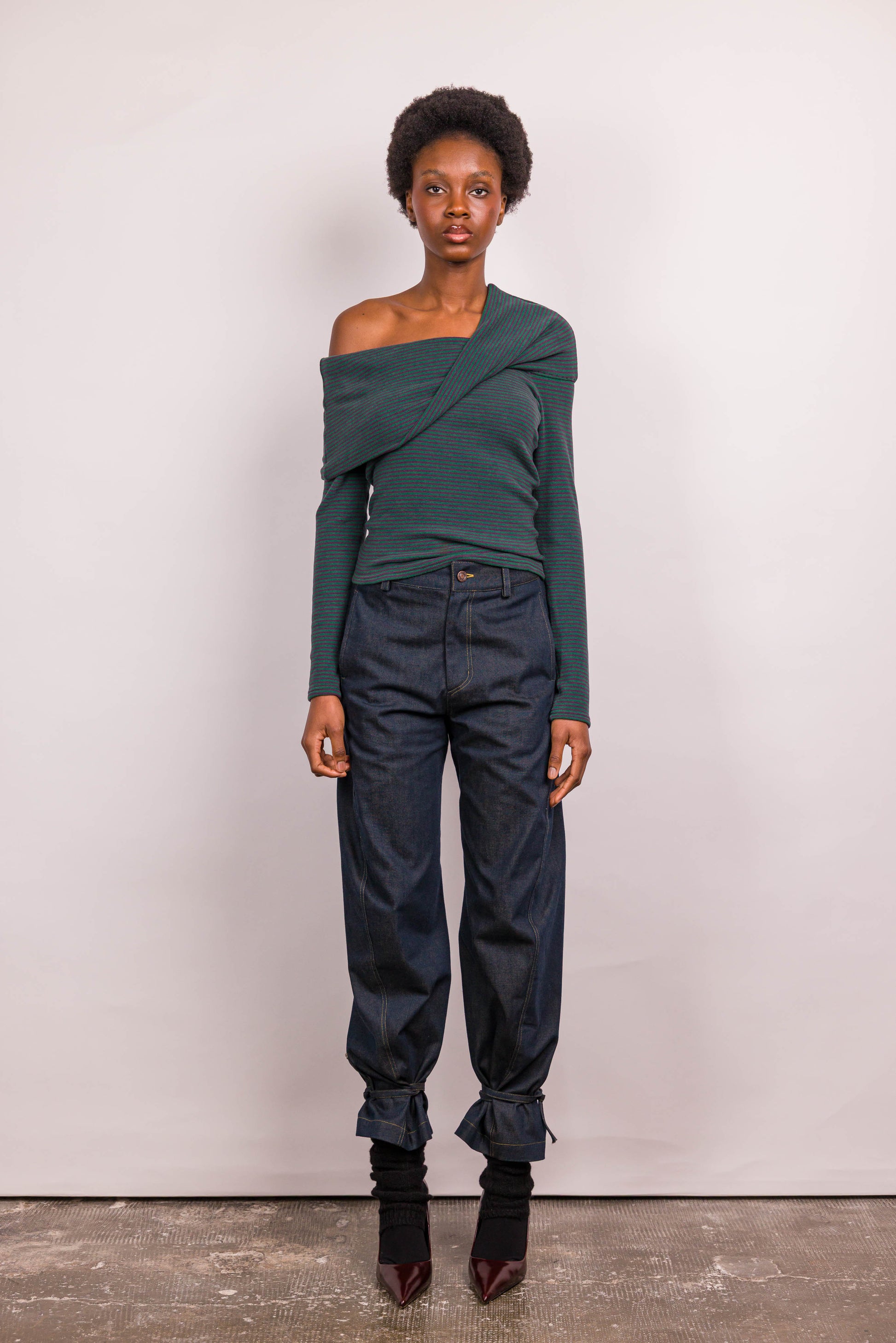 Charlie est un haut rayé vert en coton et polyester, pensé pour se porter de deux façons : en bandeau, légèrement descendu sur les épaules pour une allure romantique, ou relevé en col tombant pour un effet plus graphique.
