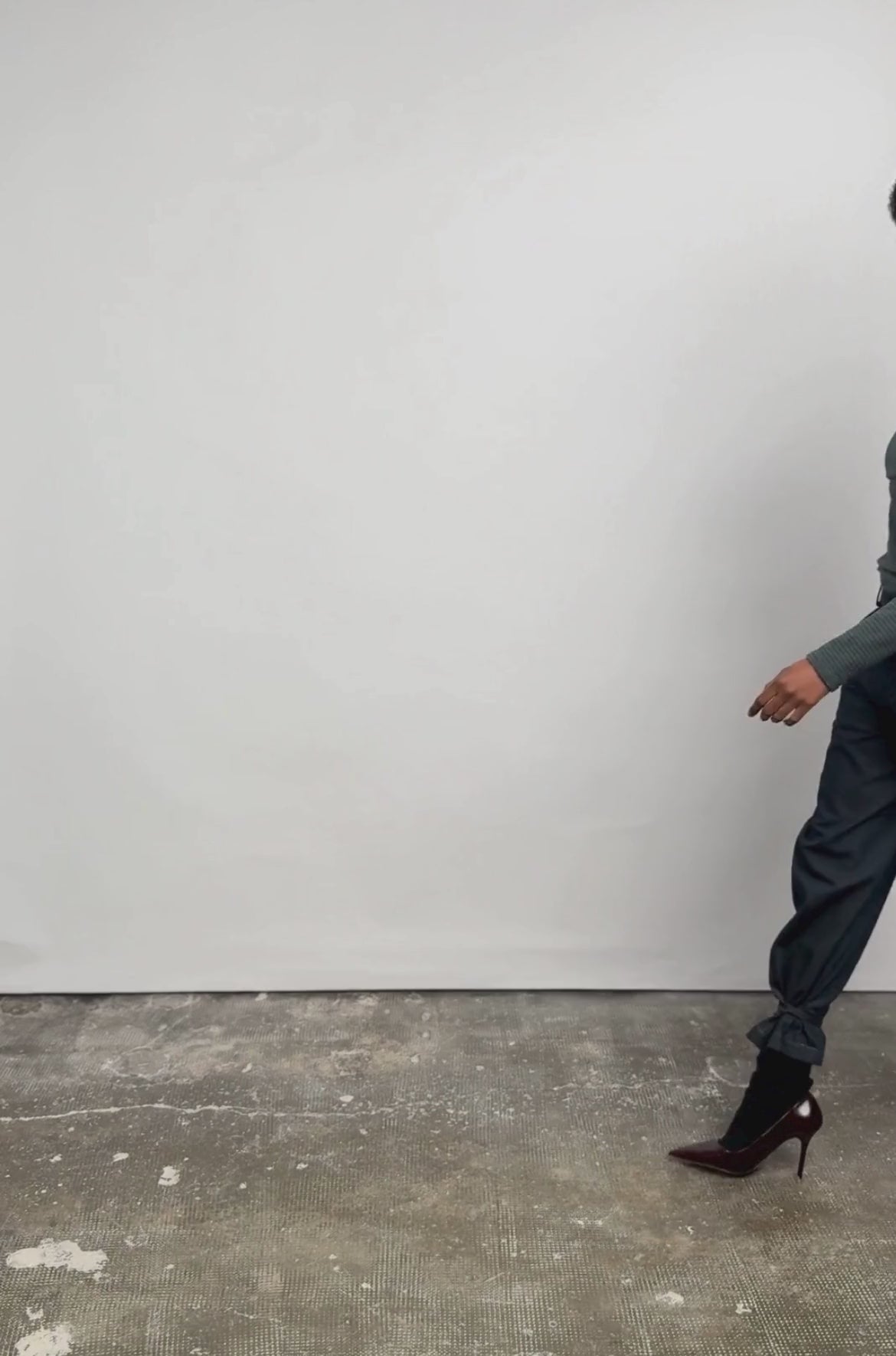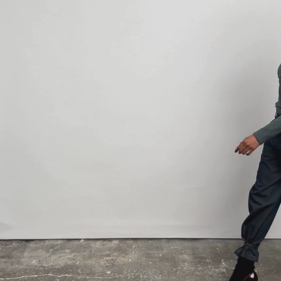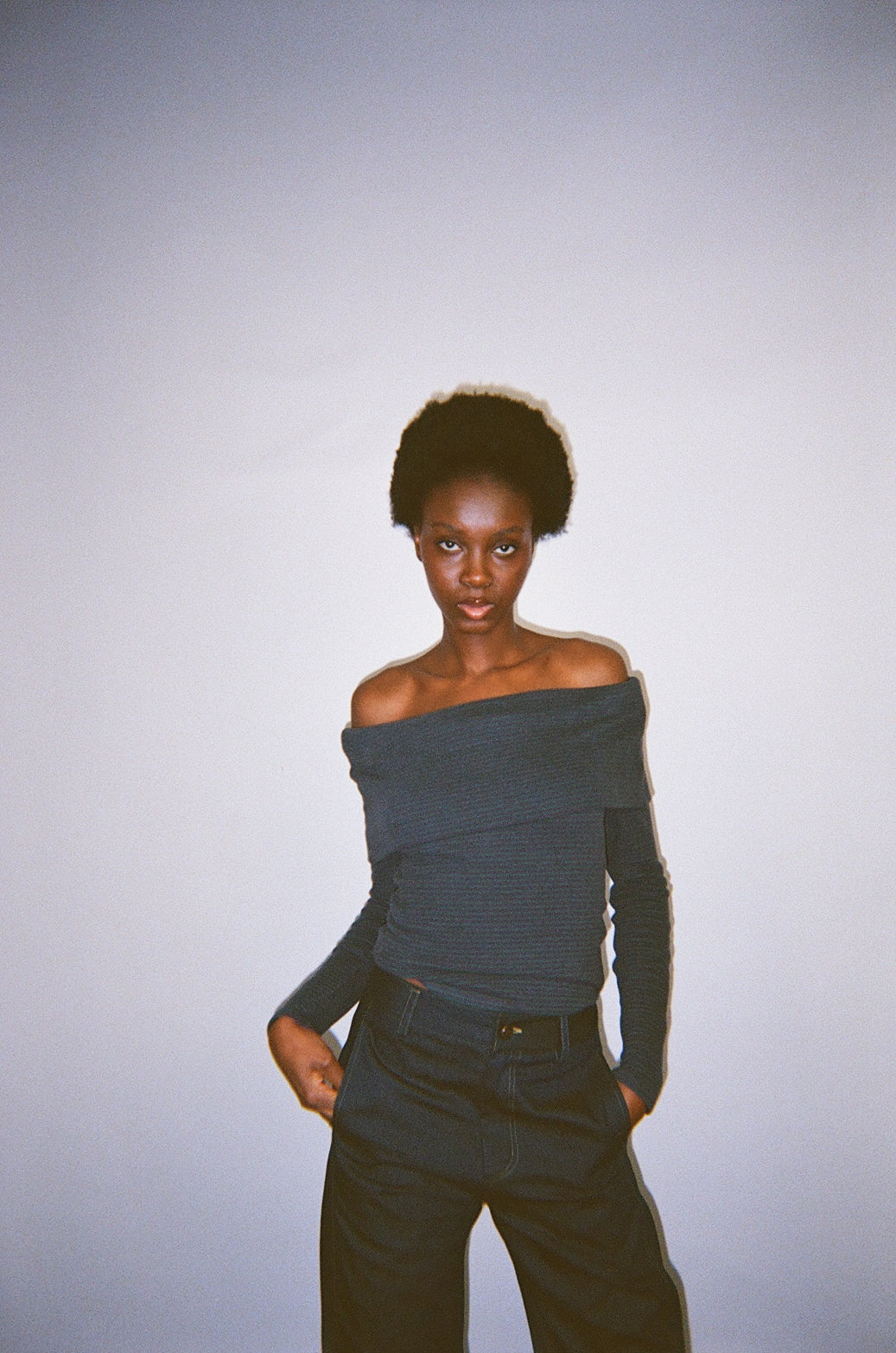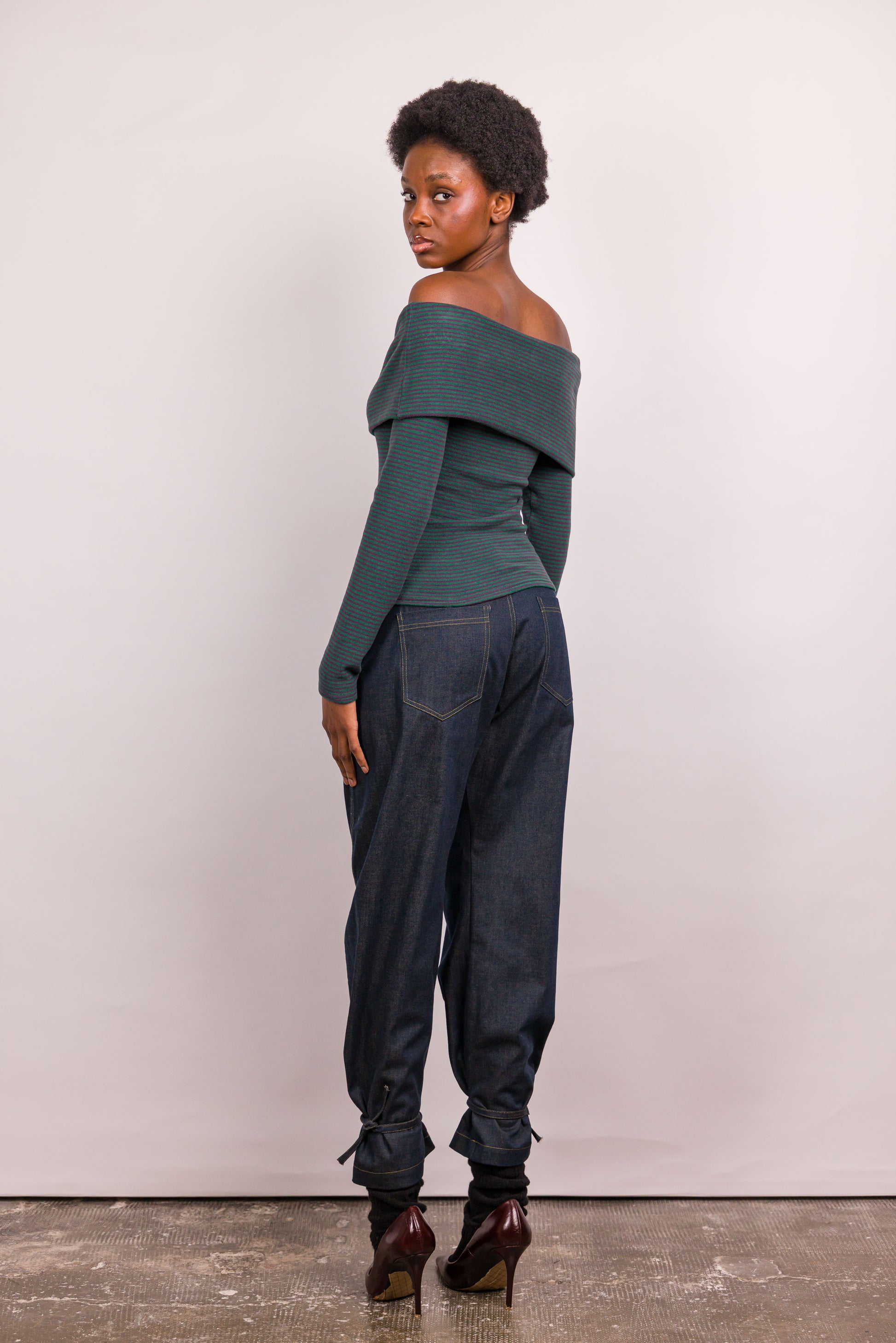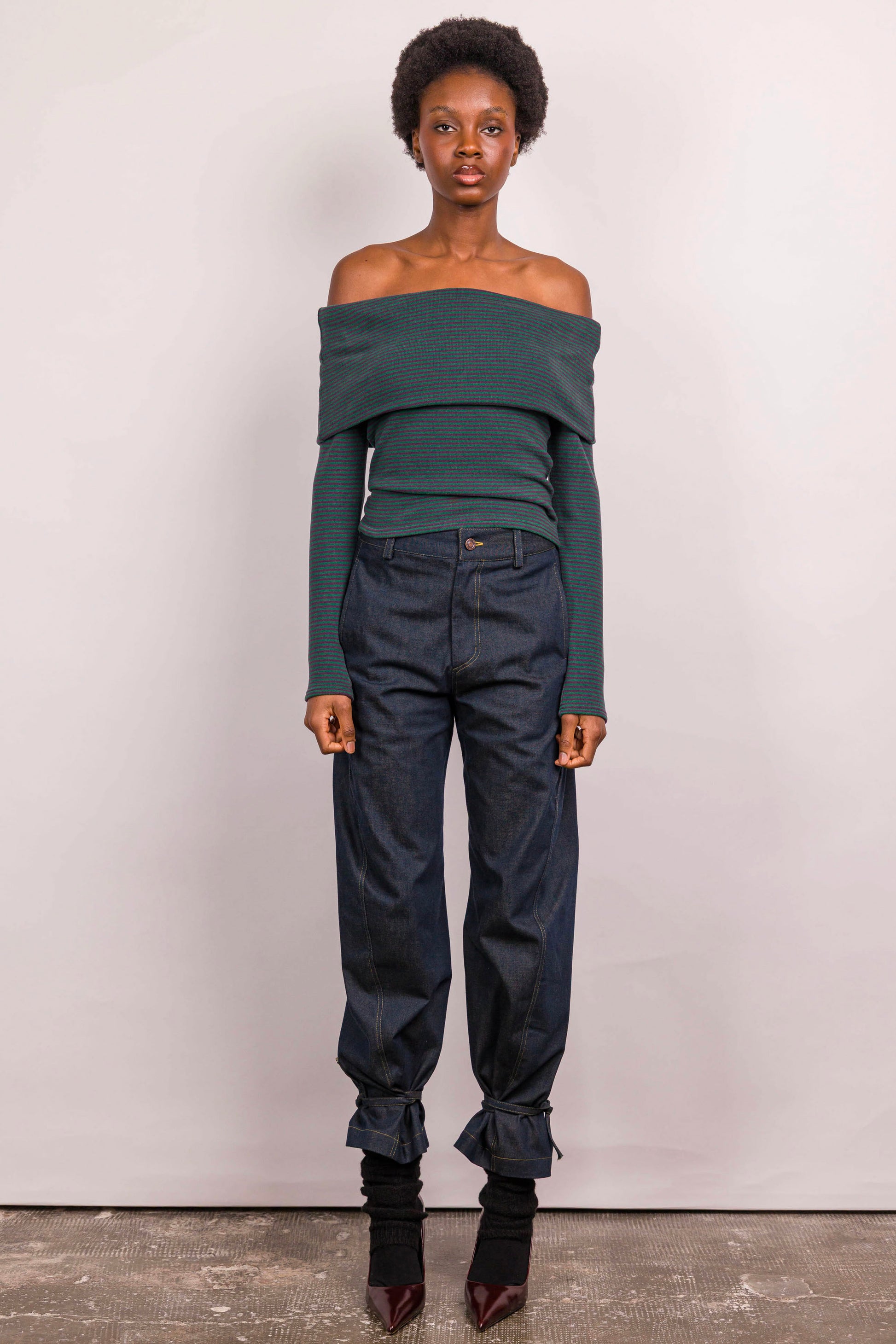 Charlie est un haut rayé vert en coton et polyester, pensé pour se porter de deux façons : en bandeau, légèrement descendu sur les épaules pour une allure romantique, ou relevé en col tombant pour un effet plus graphique.