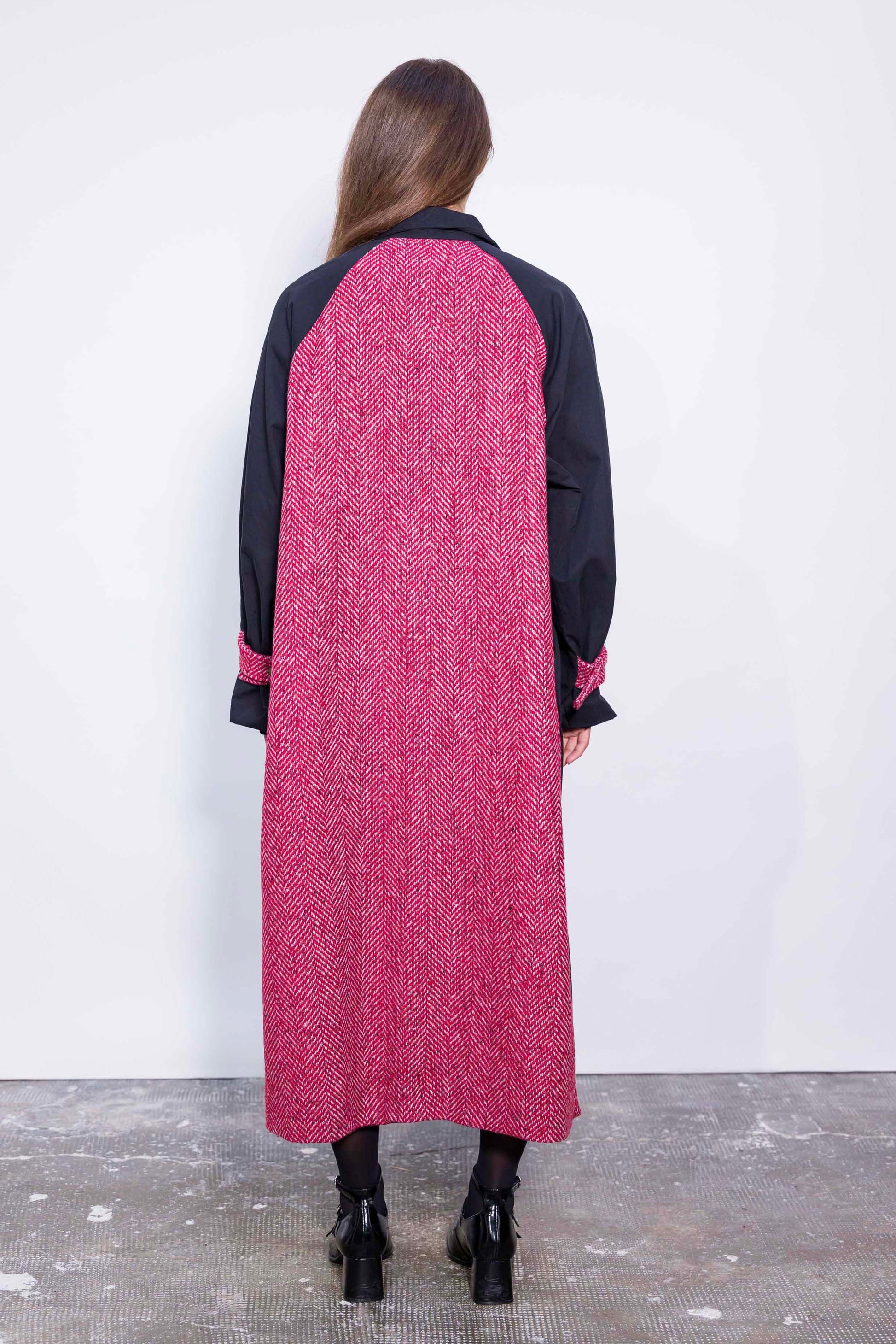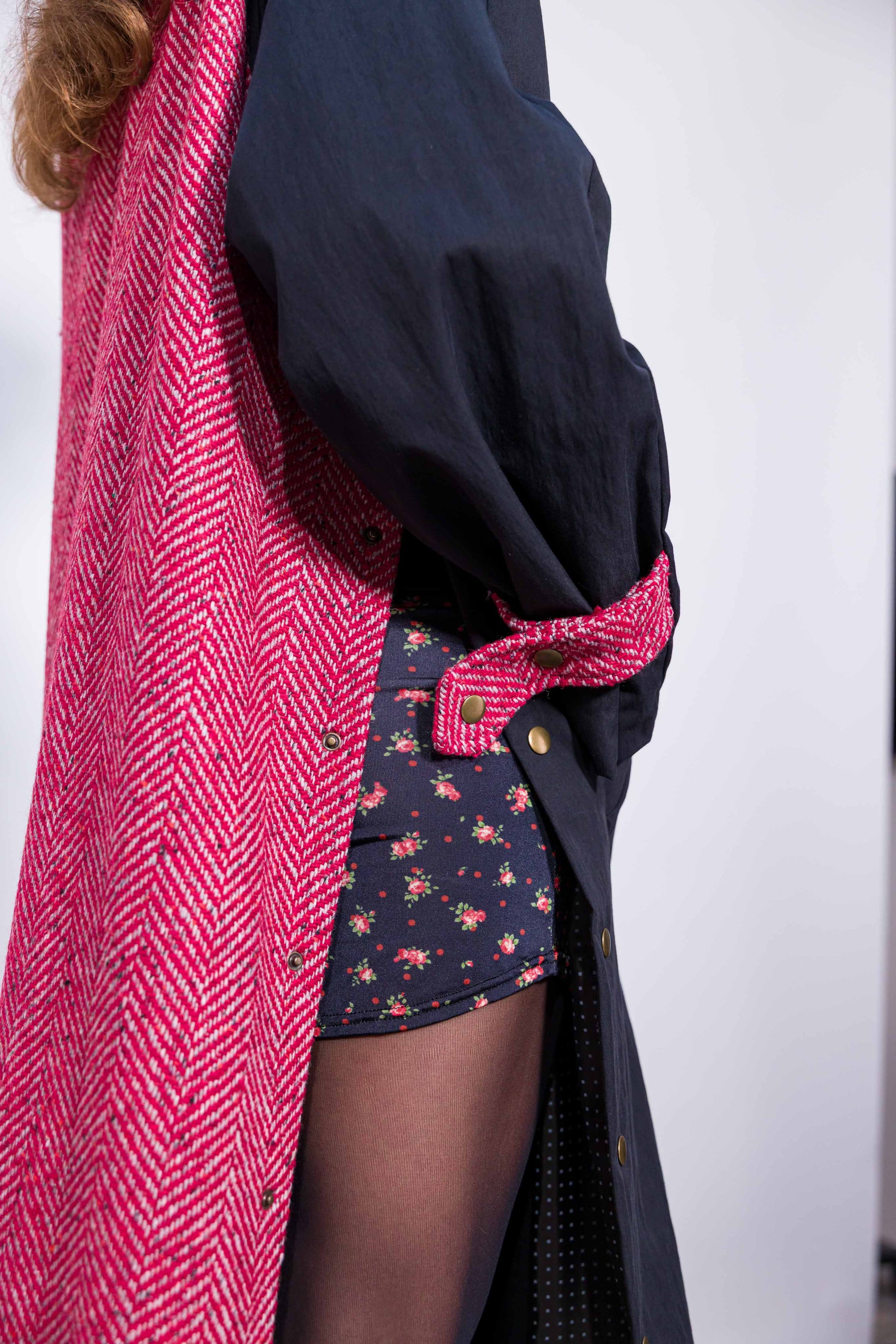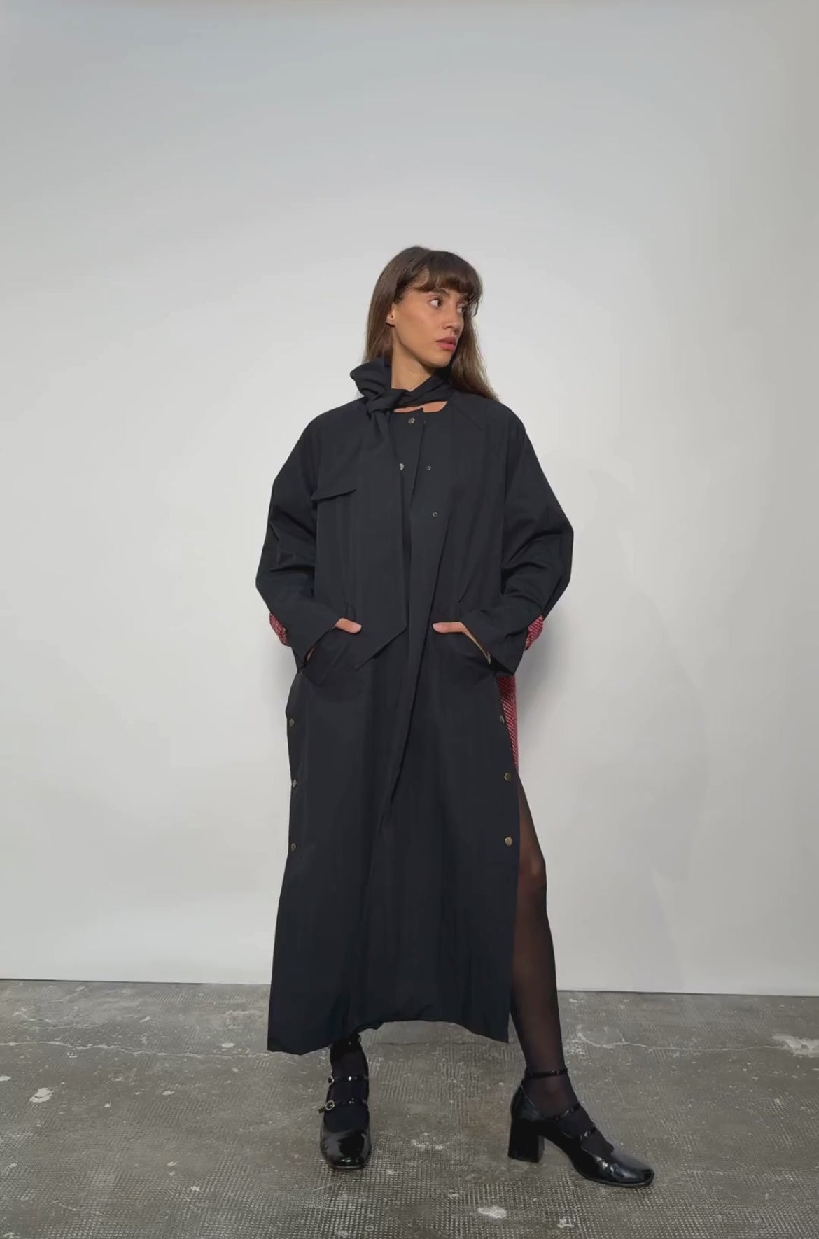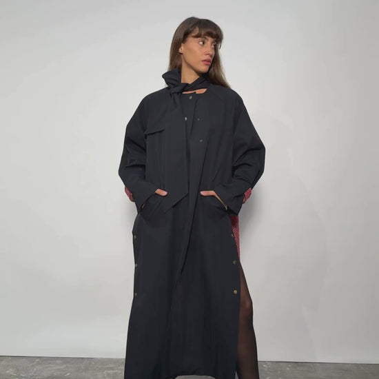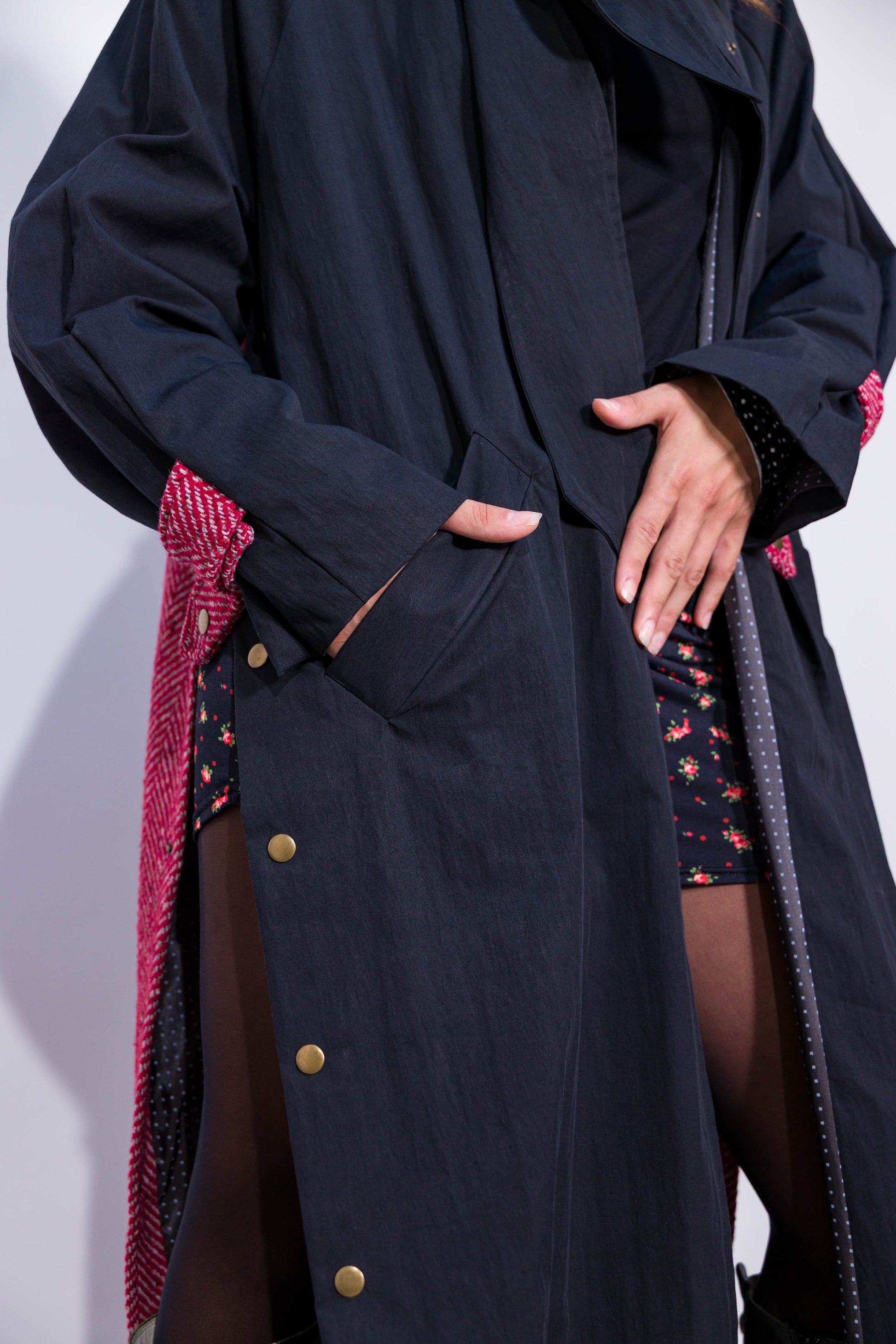 Depuis le temps qu'on en rêvait... voici Antonin, notre trench bi-matière en gabardine noire et laine à chevrons rouge. On l'a voulu complètement ajustable. Les cotés sont fermés avec des pressions, les manches peuvent se resserrer et surtout le col peut se nouer ou se laisser libre. Comme toujours nous avons sélectionné une doublure magnifique qui rend ce manteau encore plus doux. Une allure chic et créative.